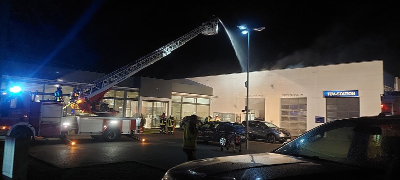 Höxter (red). Zwei Mitarbeiterinnen des Autohauses Hermann haben kurz vor Feierabend den Brand in ihrem Autohaus im Industriegebiet Lüre in Höxter gegen 17:25 Uhr bemerkt. Das Feuer ist am späten Nachmittag im Autohaus Hermann in Höxter ausgebrochen. Flammen und Rauch haben sich schnell ausgebreitet. Als die Feuerwehr am Einsatzort eintraf, schlugen die Flammen bereits aus dem Dach und den Einsatzkräften entgegen. Zu hören war ein Knistern und auch immer mal wieder mehrfach ein lautes Knallen, hieß es von der Feuerwehr.
