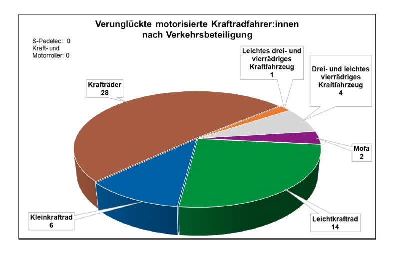 Während die Gesamtzahl der Verkehrsunfälle, unter Beteiligung motorisierter Zweiradfahrer, gestiegen ist, ging die Anzahl der Verunglückten deutlich zurück. Die Altersstruktur ähnelt der des Vorjahres. Jeder zweite Verunglückte, der mit einem motorisierten Zweirad unterwegs war, fuhr ein „großes“ Motorrad. 30 der verunglückten Zweiradfahrer verunfallten ohne Beteiligung anderer Verkehrsteilnehmer (Alleinunfall). Bei 17 Verkehrsunfällen, bei denen ein motorisierter Zweiradfahrer verletzt oder getötet wurde, war die nicht angepasste oder überhöhte Geschwindigkeit des Zweiradfahrenden Unfall-ursächlich. Mit 300 Km/h über die B64 im Kreis Höxter: In einem Fall sei die Polizeibehörde auf einen Motorradfahrer aufmerksam gemacht worden, der seinen Geschwindigkeitsverstoß im Internet gepostet hat: Mit 300 Km/h über die B64 – das blieb nicht ohne Folgen. Mit seinem Internet-Post sei er inzwischen nicht nur seinen Führerschein los, sondern auch sein Motorrad, berichtete Markus Tewes.