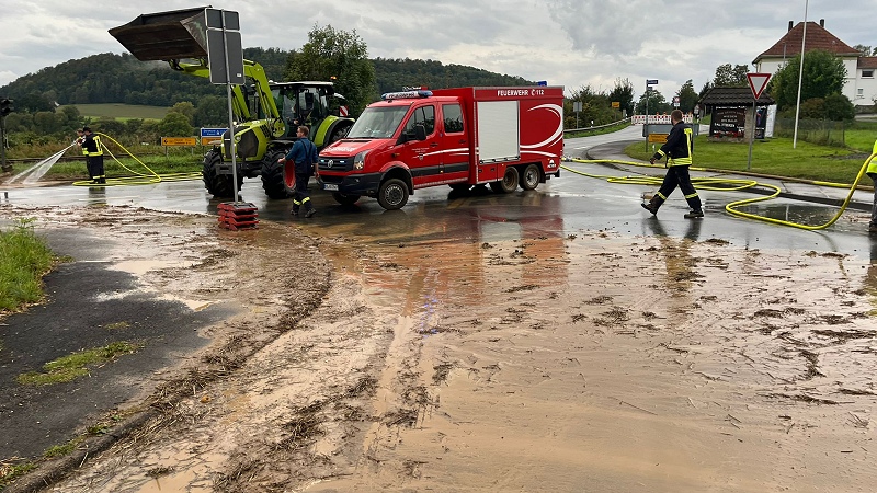 Boffzen/Ottbergen (TKu). Am Mittwochnachmittag gegen 16:30 Uhr sorgten gleich zwei Starkregen-Felder, die auf einer Zugbahn über die Region hinweg gezogen sind, zu Schlammlawinen und Überschwemmungen. Betroffen waren hauptsächlich in den Ortschaften Höxter-Ottbergen und die Ortschaft Boffzen. Binnen kürzester Zeit wurde der Boden auf nahegelegenen Feldern derart durchnässt, dass der Schlamm und die Wassermassen von den umliegenden Hängen auf die Straßen gespült wurden. In Ottbergen wurde die komplette Derenbornstraße sowie der nahe gelegene Bahnübergang von einer Schlammlawine erfasst. Die Straße war für eine längere Zeit unpassierbar, und die Löschgruppen Bruchhausen und Ottbergen mussten ausrücken, um den Schlamm und das Wasser zu beseitigen, damit die Straßen, insbesondere die Bundesstraße 64, für den Verkehr wieder freigegeben werden konnte. Landwirtschaftliche Geräte unterstützten beim Freiräumen in Ottbergen ebenso, wie in Boffzen. Hier war die Straße am Hessenborn, auch „Himmelsleiter“ in den Solling genannt, am stärksten betroffen. Denn auch hier kam es zu zwei Schlammlawinen, die Straßen erfasste, Regenwasserabflussschächte verstopfte und einige Keller der Wohnhäuser an der Straße unter Wasser setzte. Anwohner berichteten von einem plötzlichen Wasserschwall, der in kurzer Zeit in die Häuser eindrang. „Es ging alles sehr schnell“, erzählt ein Betroffener und ergänzt: „Das Wasser kam plötzlich die Straße herunter und stand innerhalb weniger Minuten in unserem Keller.“ Die Ortsfeuerwehren aus Boffzen, Lauenförde-Meinbrexen und Fürstenberg waren zusammen mit einem Traktor im Dauereinsatz, um die überfluteten Keller leer zu pumpen und die Straßen vom Schlamm zu befreien. Vorsorglich wurde auch eine Sandsack-Barriere durch die Feuerwehrleute an der Stelle errichtet, wo der Übergang der Schlammlawine vom Feld auf die bewohnte Straße erfolgte.