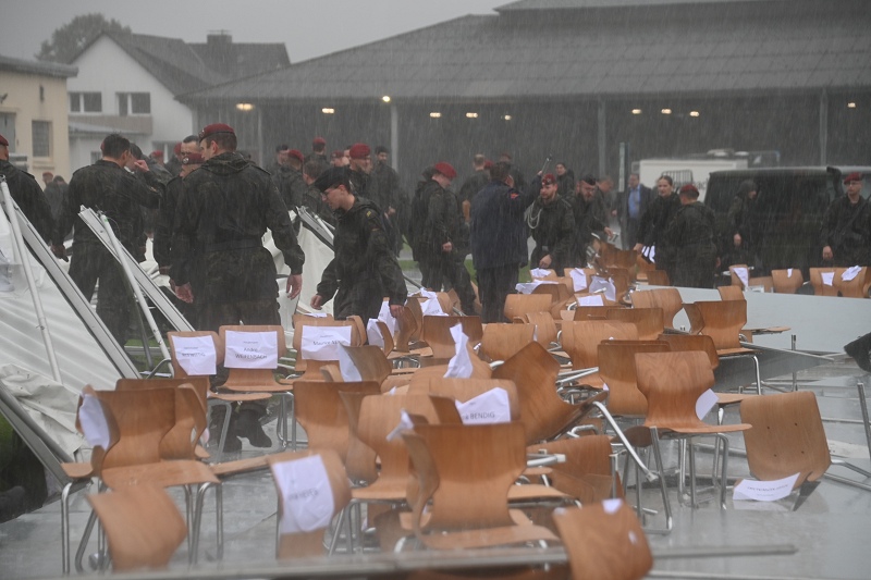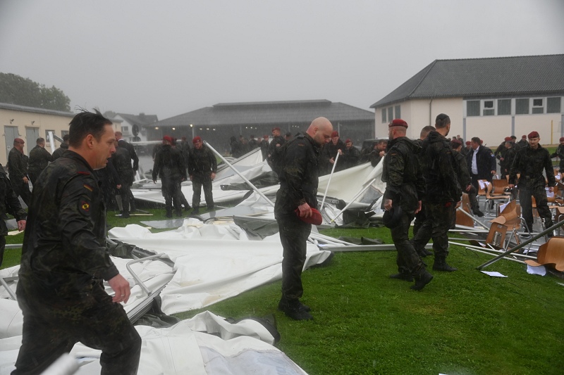 Bereits nach einer Minute - um 15:14 Uhr und 30 Sekunden - war der Spuk der Orkanböen schon wieder vorbei. Das Zelt lag einige Meter hinter seinem Aufstellort verstreut auf der Fläche. Die Stühle waren leer und die Menschen in die große Fahrzeughalle am Rande des Appellplatzes geflüchtet. Kreisbrandmeister Stefan Nostiz und Höxters Feuerwehrleiter Jürgen Schmits waren ebenfalls unter den Gästen. Sie starteten und koordinierten die ersten Maßnahmen für den kurze Zeit später folgenden Rettungsdienst-Großeinsatz. 17 Menschen sind zumeist leicht verletzt worden, einige wenige wurden hingegen schwerer verletzt – zum Glück jedoch niemand lebensgefährlich. Mehr als zehn Rettungsfahrzeuge, Notärzte aus Höxter, Brakel und Holzminden sowie ein Rettungshubschrauber eilten zum Einsatzort, um die Verletzten zu versorgen und um sie zum Teil den Krankenhäusern zuzuführen. „Die Lage sei schnell im Griff gewesen“, hieß es von den Rettungskräften, die alle Verletzten im Sanitätsbereich versorgt haben. Nach zwei Stunden war ihr Einsatz beendet. Die Bundeswehr war bestürzt über diese Tragödie, die es so noch nie in der Geschichte der Bundeswehr in Höxter gegeben hat während eines solchen Festaktes. Nach Informationen des ABC-Abwehrbataillons soll der Kommandeurswechsel in einem kleineren Rahmen am Freitag, 27. September, nachgeholt werden.