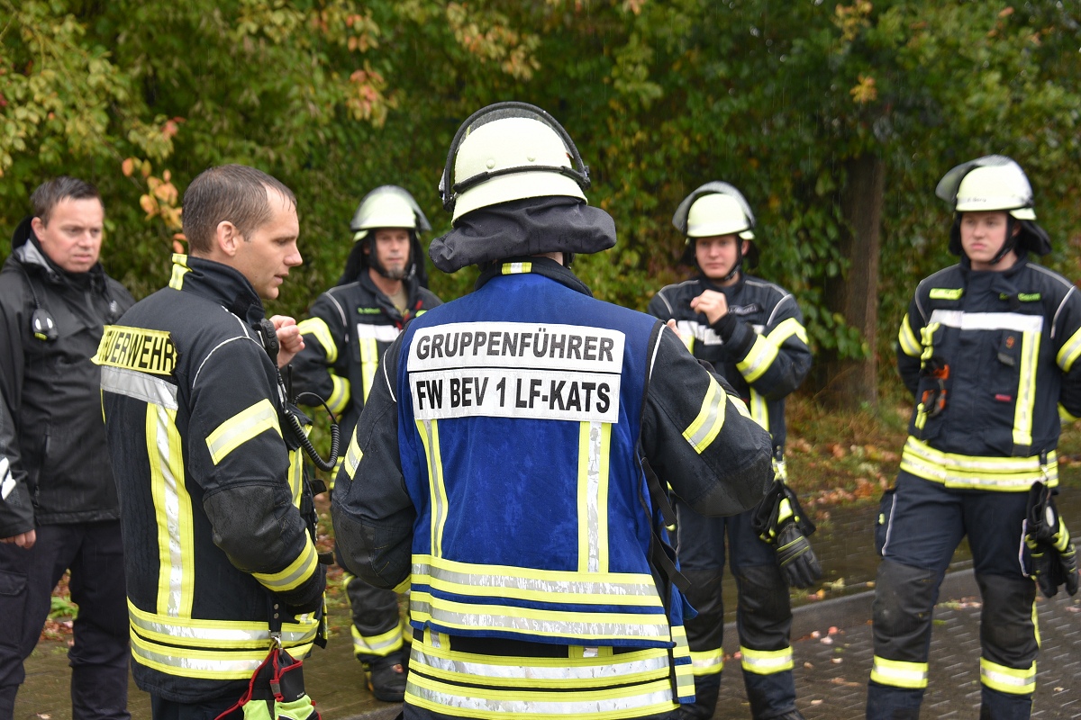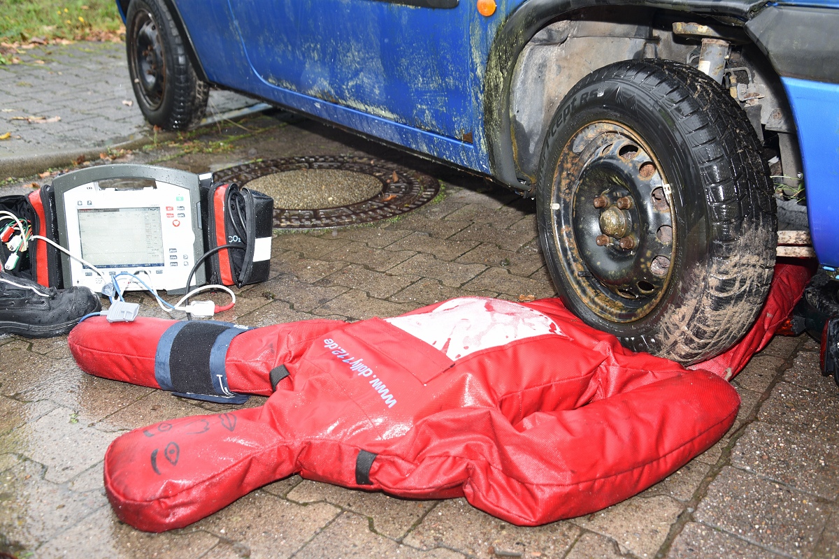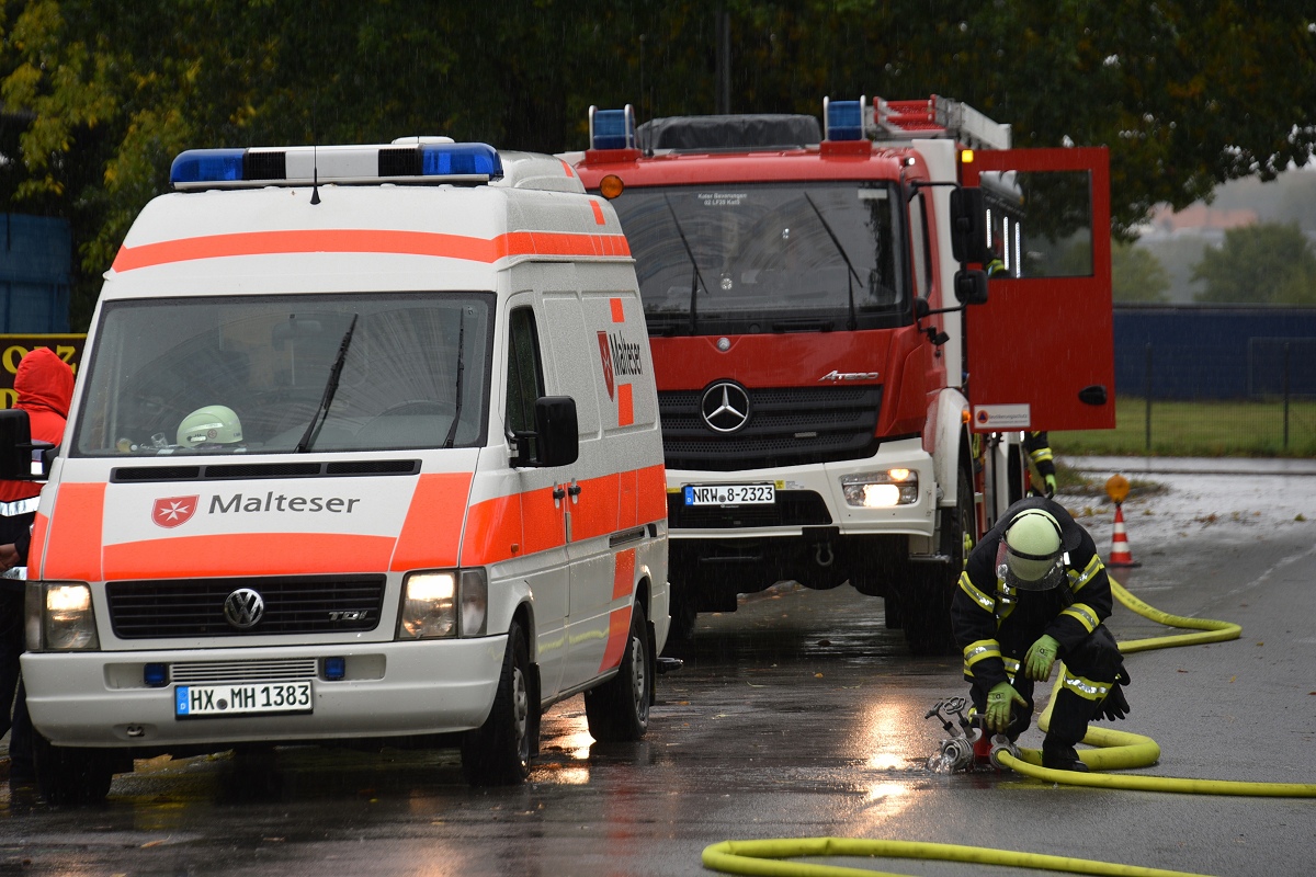 Die Übung war in vier Szenarien gegliedert, die an unterschiedlichen Orten in Beverungen und Dalhausen stattfanden. Bei einer Übung im Industriegebiet Beverungen mussten die Einsatzkräfte ein Kind retten, das unter einem Pkw eingeklemmt war. Da passendes technisches Gerät nicht verfügbar war, stand die Feuerwehr vor einer kniffligen Aufgabe und musste mit dem vorhandenen Material improvisieren. Parallel kümmerte sich der Rettungsdienst um die Versorgung des kleinen Patienten. „Für sie eine besondere Herausforderung, da Medikamente bei Kindern exakt nach Körpergewicht dosiert werden müssen“, sagt der Feuerwehr-Ausbilder und Notfallsanitäter Jan Nolte, der für dieses Szenario verantwortlich war und auch seine Kinder Lennart (10) und Jonathan (7) als vom Einsatz betroffene Kinder eingebunden hat. Ein weiteres Szenario führte die Kräfte in die verwinkelten Versorgungsgänge der Stadthalle Beverungen, in dem eine Brandmeldeanlage ausgelöst hatte. Die Ursache: Ein Brand mit einer starken Verrauchung in einem Technikraum. „Unbekannte Fluchtwege und die Orientierung über Feuerwehrpläne machten die Lage anspruchsvoll“, erklärte Alexander Bönning. Während die Feuerwehr im Inneren tätig war, blieb der Rettungsdienst in Bereitschaft und musste nachher doch noch einen kleinen Patienten mit einer Rauchgasvergiftung behandeln.
