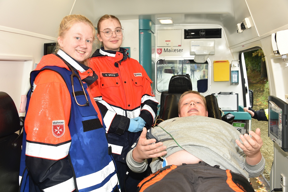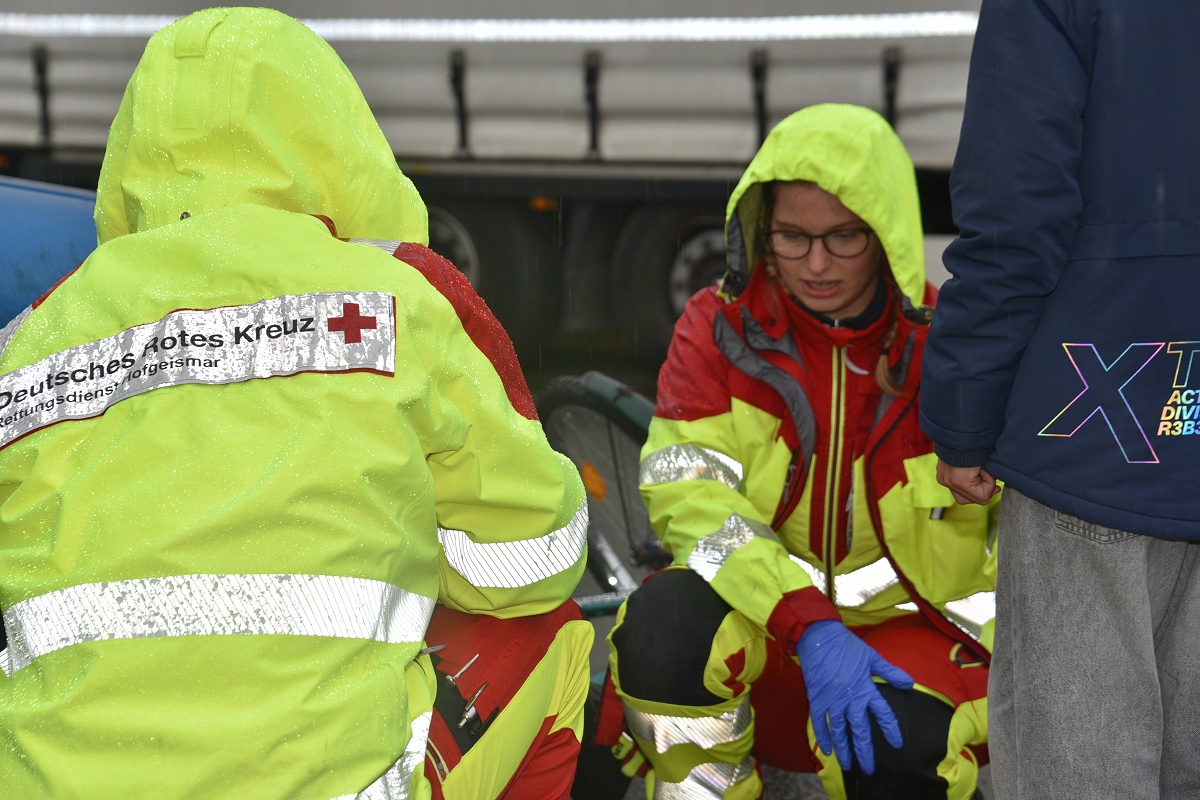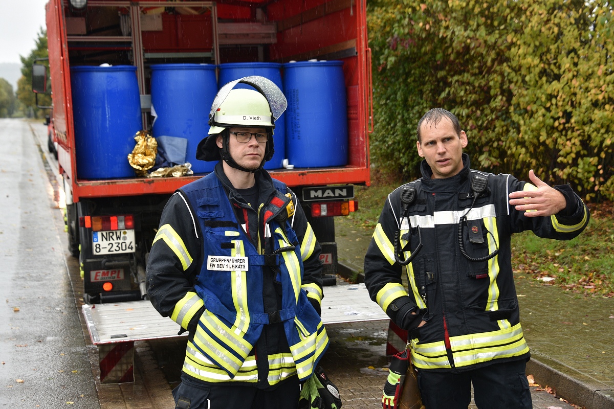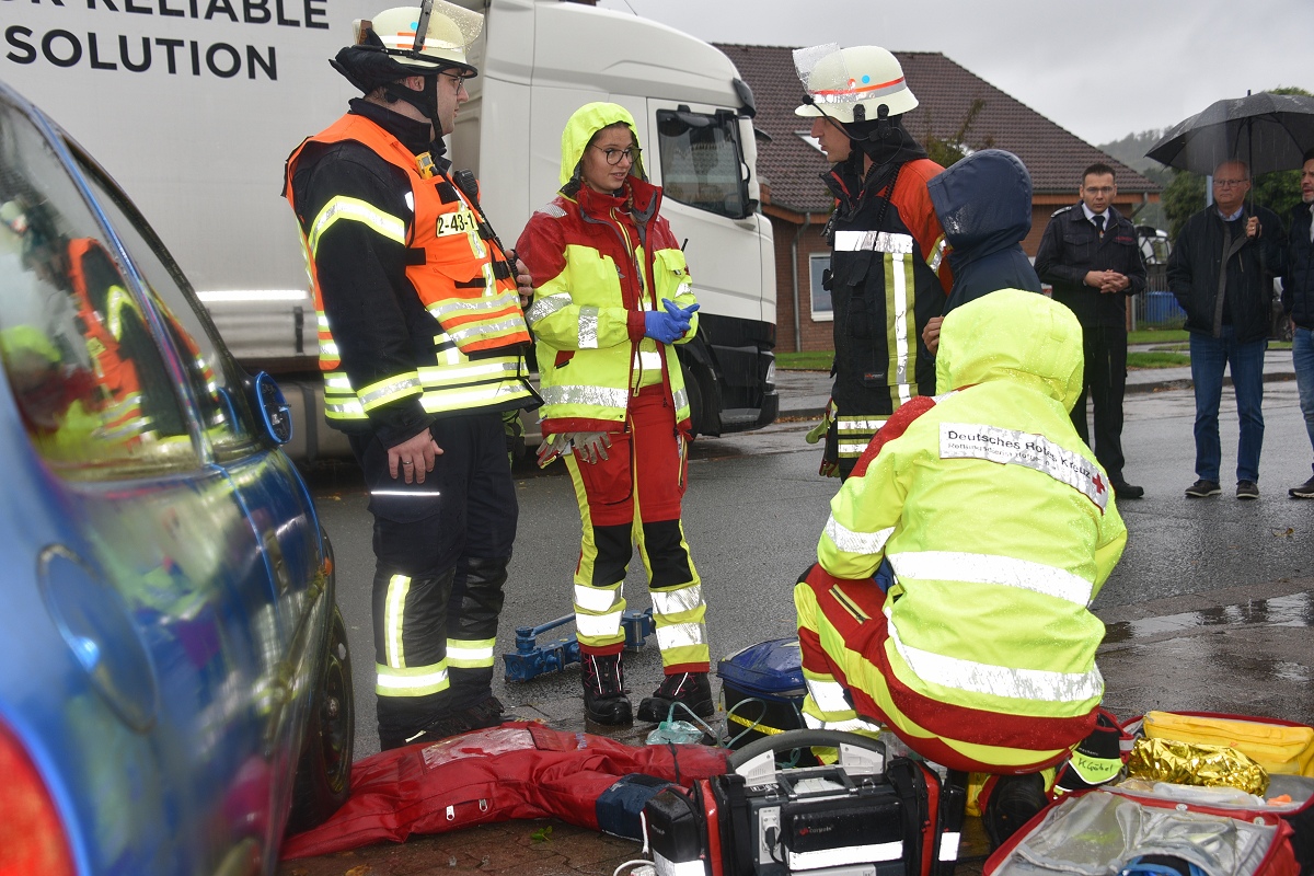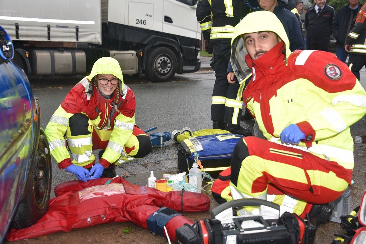 Beim vierten Fall ging es in die Verbundschule nach Dalhausen, wo ein Elektriker einen Stromschlag erlitten hatte. Dunkle Flure ohne Beleuchtung und ein unklarer Zugang erschwerten den Einsatz. Feuerwehrkräfte verschafften dem Rettungsdienst den Weg und unterstützten bei der Rettung des schwer verletzten Patienten, während dieser parallel notfallmedizinisch versorgt wurde. Begleitet wurden die Übungen von den Bürgermeistern der beteiligten Städte. Sie zogen von Station zu Station, informierten sich über die Abläufe und dankten den Einsatzkräften für ihr Engagement. Trotz Sturm und Dauerregen, die den Tag zusätzlich erschwerten, lobten sie zusammen mit dem Leiter der Feuerwehr Beverungen, Sebastian Ewen, die Professionalität und die gute Zusammenarbeit aller Teams.