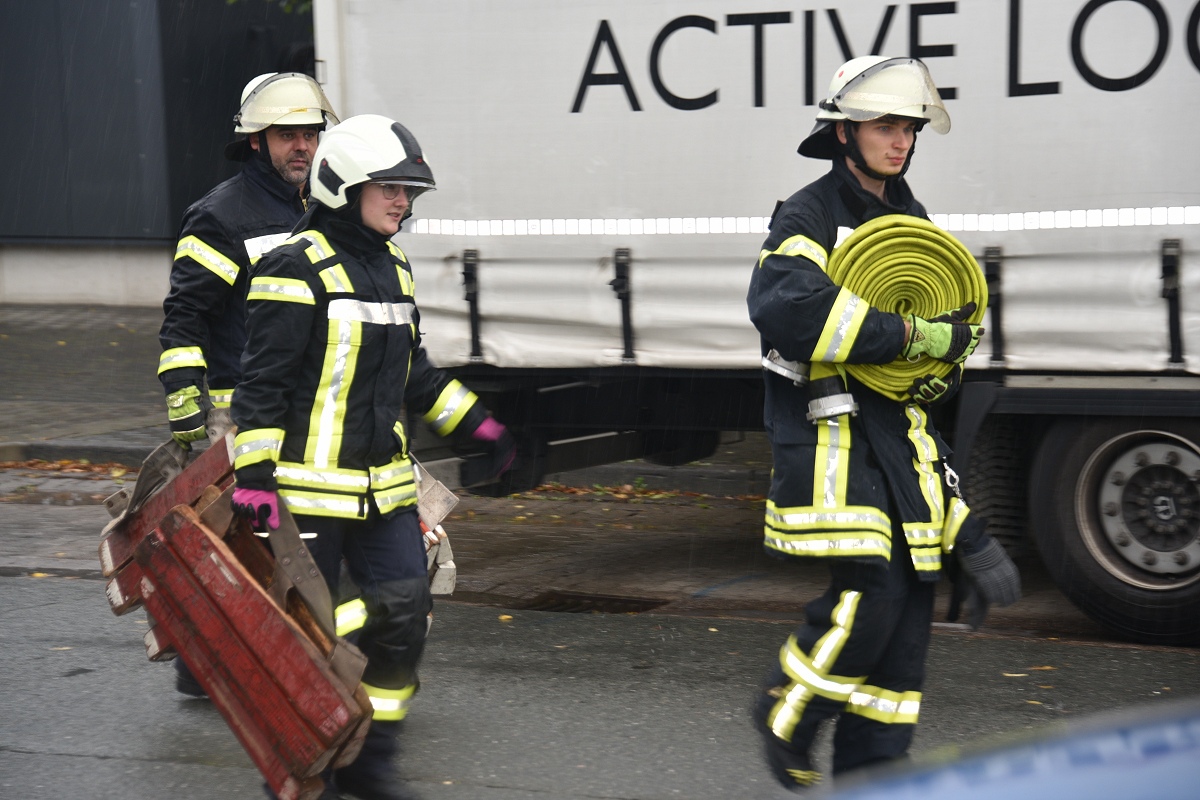 Gefährlich wurde es am Weseranger, wo ein Lkw mit Gefahrgutkennzeichnung Flüssigkeiten verlor. Hier galt es, die Lage nach dem sogenannten „GAMS-Schema“ abzuarbeiten, sprich die Gefahr erkennen, absperren, Menschenrettung einleiten und Spezialkräfte nachfordern. Die Feuerwehr rettete zwei Personen unter Atemschutz und zog sich danach wieder schnell zurück. Wichtig war unter anderem zu erkennen, dass dieser Stoff nicht mit Wasser in Berührung kommen darf, was auf der Warntafel an dem Gefahrgut-Lkw das „X“ vor der Gefahrzahl bedeute, erklärt der Pressesprecher. Bei dem ausgetretenen Stoff sollte es sich um Siliciumtetrachlorid handeln, eine farblose Flüssigkeit mit erstickendem Geruch, die in Gegenwart von Feuchtigkeit die meisten Metalle stark angreift und bei Kontakt mit Wasser heftig reagiert, wobei das ätzende Gas Chlorwasserstoff freigesetzt wird.