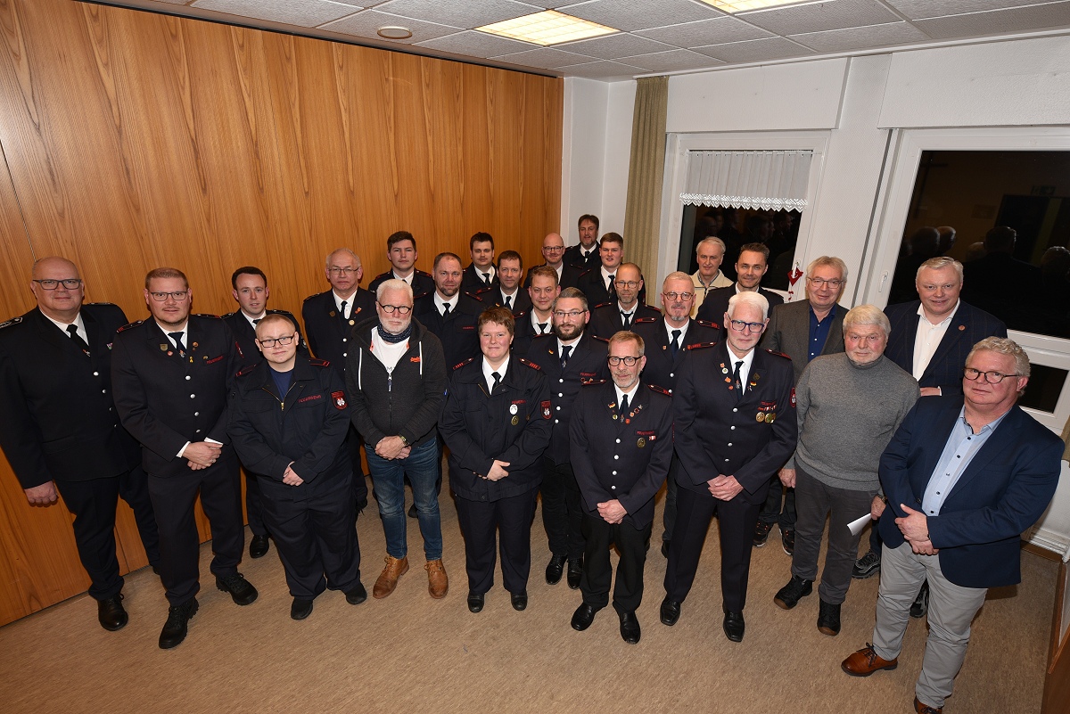 Wie aktiv die Löschgruppe Lüchtringen ist, zeigte der Jahresbericht von Löschgruppenführer Andreas Bohnenpoll. Im vergangenen Jahr rückte die Löschgruppe insgesamt 32 Mal zu Einsätzen aus, wie auch in den Jahren zuvor. Darunter waren zahlreiche Verkehrsunfälle, Brände sowie Unterstützungen für den Rettungsdienst. Besonders im Gedächtnis geblieben sind Einsätze wie der Kohlenmonoxid-Gasunfall an der Kirche, bei dem zwei junge Menschen ums Leben kamen, ein Pkw in der Weser bei Höxter sowie eine Hausgeburt, bei der die Feuerwehr als Tragehilfe für den Rettungsdienst alarmiert wurde und auch die Drehleiter aus Höxter zum Einsatz kam. „So einen freudigen Einsatz haben wir nicht alle Tage“, betonte Bohnenpoll rückblickend. Im Anschluss folgten Ehrungen und Beförderungen. Das Feuerwehrehrenzeichen des Landes Nordrhein-Westfalen in Gold verlieh Bürgermeister Daniel Hartmann an Hauptfeuerwehrmann Rolf Hillebrecht, Hauptbrandmeister Andreas Klie, Hauptfeuerwehrmann Jens Lippelt sowie Unterbrandmeister Oliver Heine. Das Ehrenzeichen in Silber für 25 Jahre aktiven Feuerwehrdienst erhielt Unterbrandmeister Sebastian Heine.
