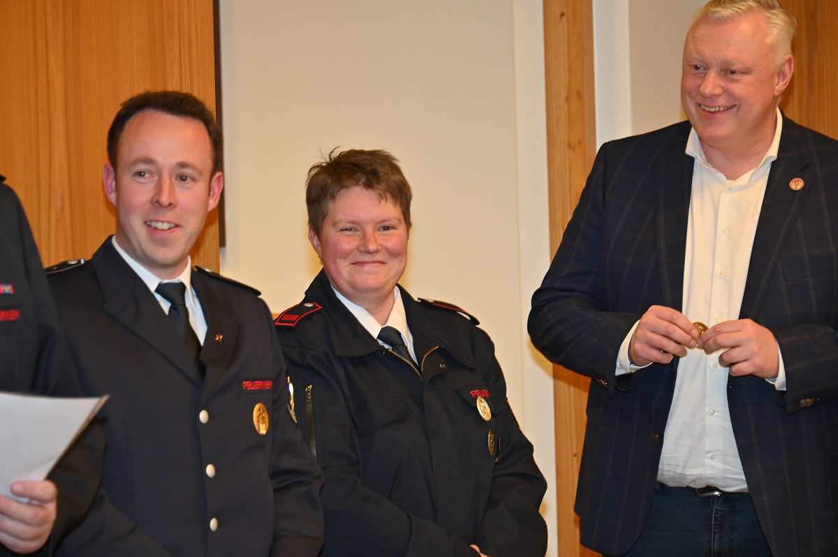 Auch Bürgermeister Daniel Hartmann sowie der Sachgebietsleiter für die Feuerwehr und den Rettungsdienst, Marcus Winkler, richteten Grußworte an die Versammlung. Hartmann betonte, dass er froh sei, dass es mit dem Neubau des Gerätehauses nun vorangehe, auch wenn Fledermäuse und Schwalben in den Abrissgebäuden sowie die aktuelle Witterung zu Verzögerungen geführt hätten. „Der Zug der rollt“, so der Bürgermeister wörtlich. Neben dem Gerätehaus standen auch künftige Fahrzeugbeschaffungen im Fokus. Laut Brandschutzbedarfsplan ist die Anschaffung von zwei neuen Einsatzfahrzeugen geplant. Vorgesehen sind ein neues, geländegängiges Mannschaftstransportfahrzeug, das auch bei Hochwasser zur Menschenrettung eingesetzt werden kann, sowie ein ebenfalls geländegängiges Löschfahrzeug mit großem Löschwassertank zur Vegetationsbrandbekämpfung. Diese Informationen gab Marcus Winkler im Rahmen der Versammlung bekannt.