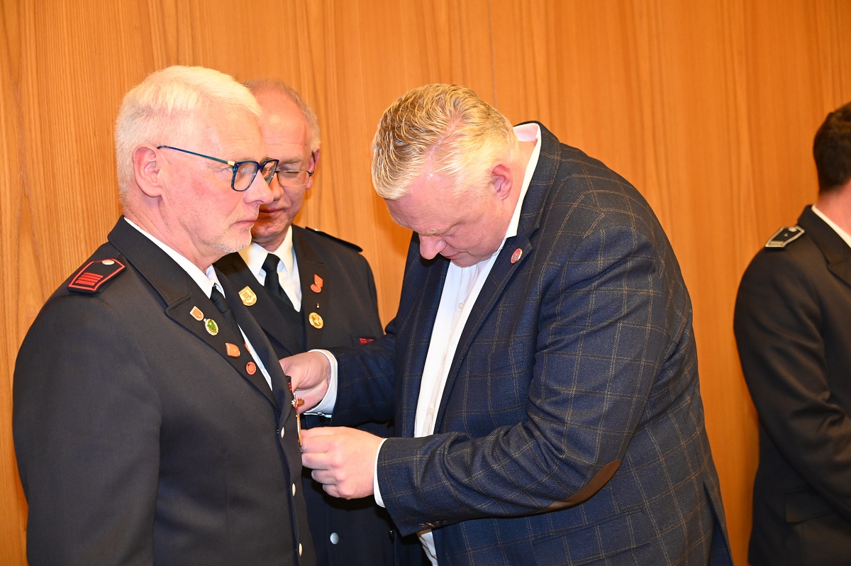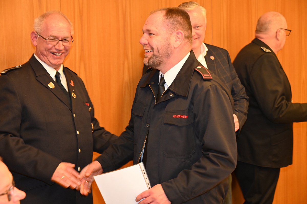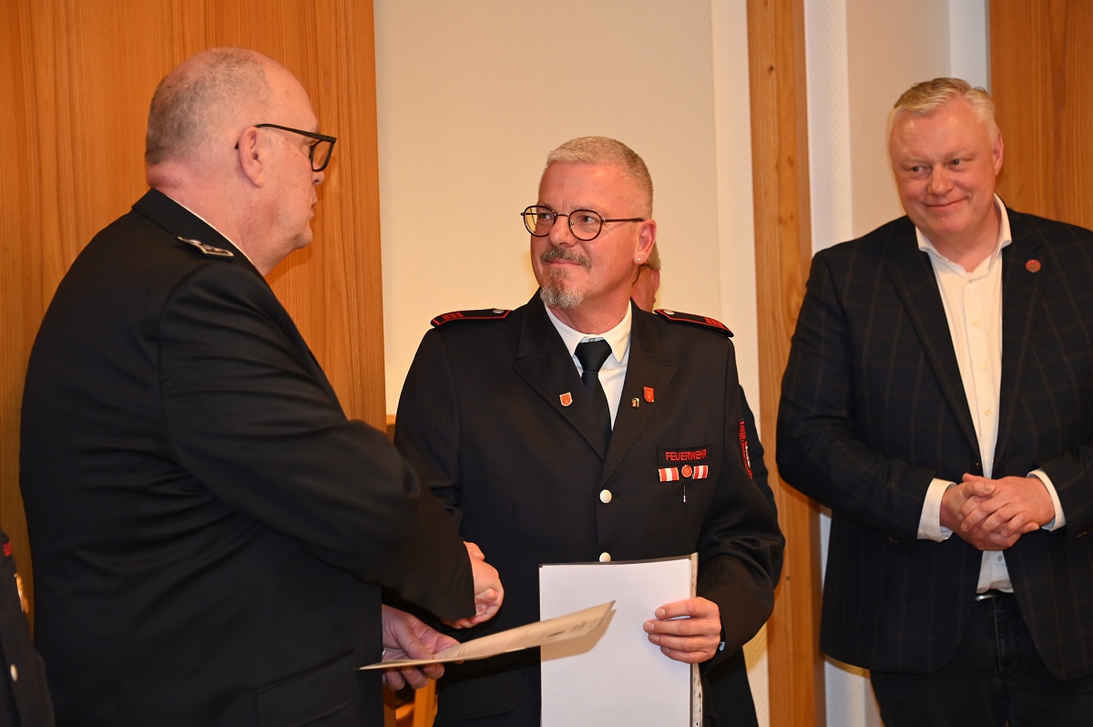Eine besondere Ehrung wurde Hauptfeuerwehrmann Ludger Heine zuteil. Für seine 40-jährige aktive Mitgliedschaft in der Freiwilligen Feuerwehr verlieh Stadtbrandinspektor Jürgen Schmits ihm eine Urkunde sowie das Sonderabzeichen des Landesfeuerwehrverbandes. Sowohl der Leiter der Feuerwehr als auch Bürgermeister Daniel Hartmann dankten ihm für seinen jahrzehntelangen Einsatz. Aus gesundheitlichen Gründen trat Ludger Heine aus der ersten Reihe der aktiven Feuerwehrleute zurück und wurde in die Ehrenabteilung versetzt. Unter großem Applaus der Mannschaft verabschiedete ihn Jürgen Schmits mit einer Urkunde. Für ihre zehnjährige aktive Mitgliedschaft wurden Unterbrandmeister Timo Heine und Fabian Rosner in Abwesenheit sowie Hauptfeuerwehrmann Julian Jöhren und Unterbrandmeister Maximilien Meise ausgezeichnet. Urkunden für 20 Jahre aktive Mitgliedschaft überreichte Löschgruppenführer Andreas Bohnenpoll an Rudolf Lützer, Patrick Haller und Lukas Heine.