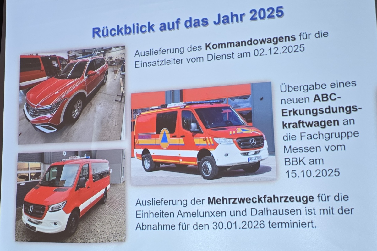 Zusätzlich stellte die Feuerwehr 32 Brandsicherheitswachen bei zahlreichen Großveranstaltungen, darunter das Weser-Open-Air, das OBS-Festival sowie weitere Veranstaltungen der Kulturgemeinschaft Beverungen. Auch bei der Ausstattung wurden wichtige Investitionen getätigt. Angeschafft wurden ein neuer Kommandowagen für den Einsatzleiter vom Dienst, ein ABC-Erkundungsfahrzeug für die Fachgruppe Messen sowie zwei Mehrzweckfahrzeuge für die Einheiten Amelunxen und Dalhausen. Insgesamt nahmen 116 Feuerwehrangehörige an 172 Seminarteilnahmen in 46 verschiedenen Aus- und Fortbildungsangeboten teil.