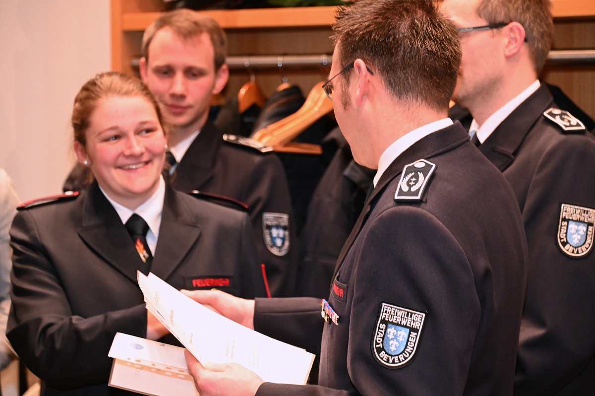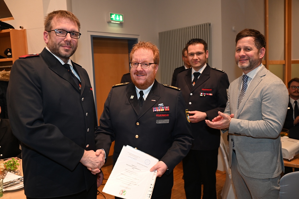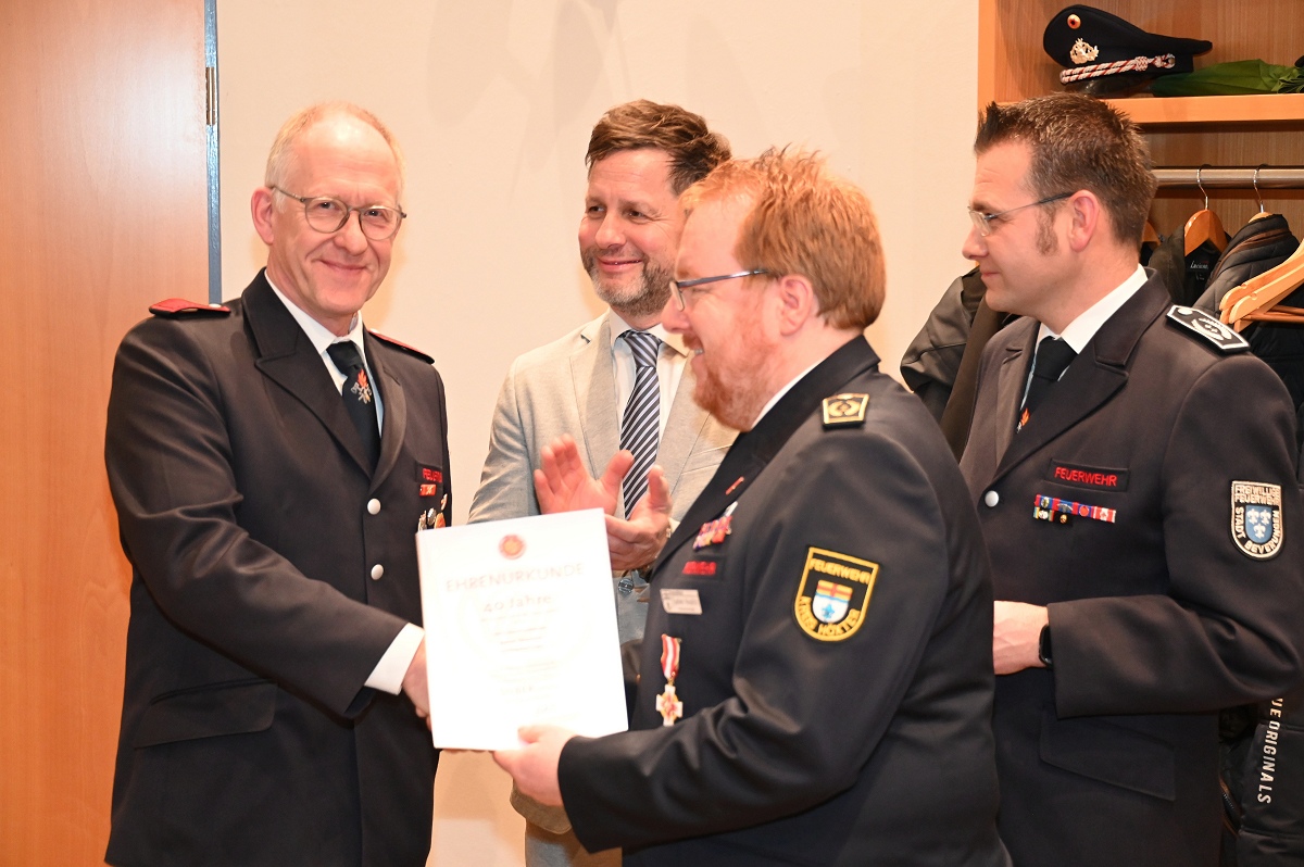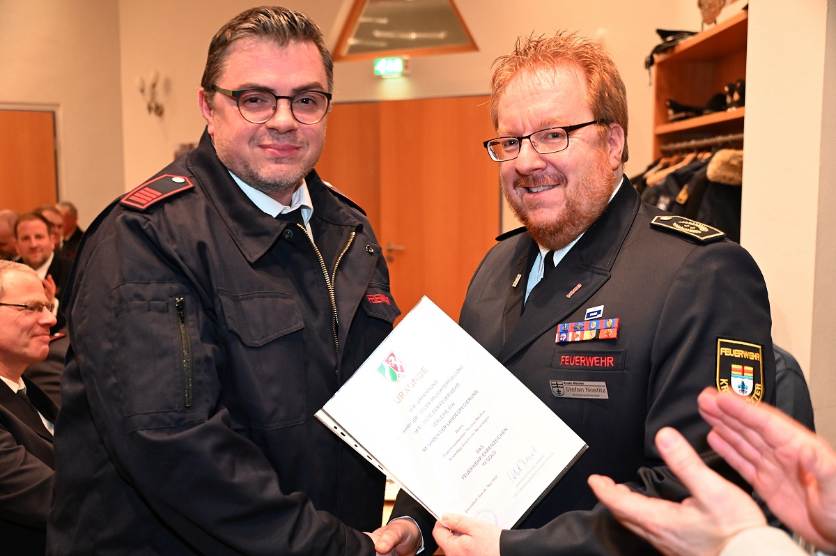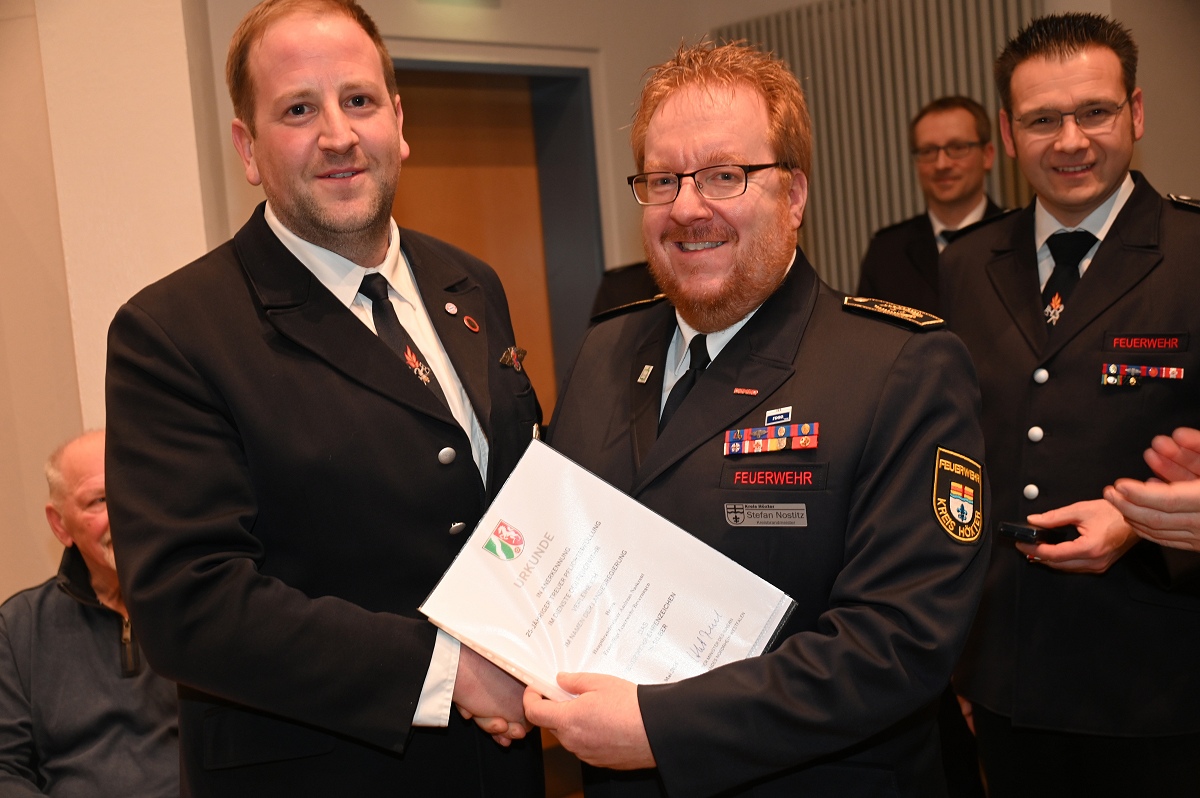 Zum Abschluss nahm Sebastian Ewen weitere Personalangelegenheiten vor. Lukas Peters wurde auf Wunsch als Stadtkinderfeuerwehrwart entlassen. Zudem wurde Marco Behler als Beauftragter für den Digitalfunk ernannt, und Alexander Bönning erhielt die Urkunde zur Bestellung als Pressesprecher der Feuerwehr überreicht.