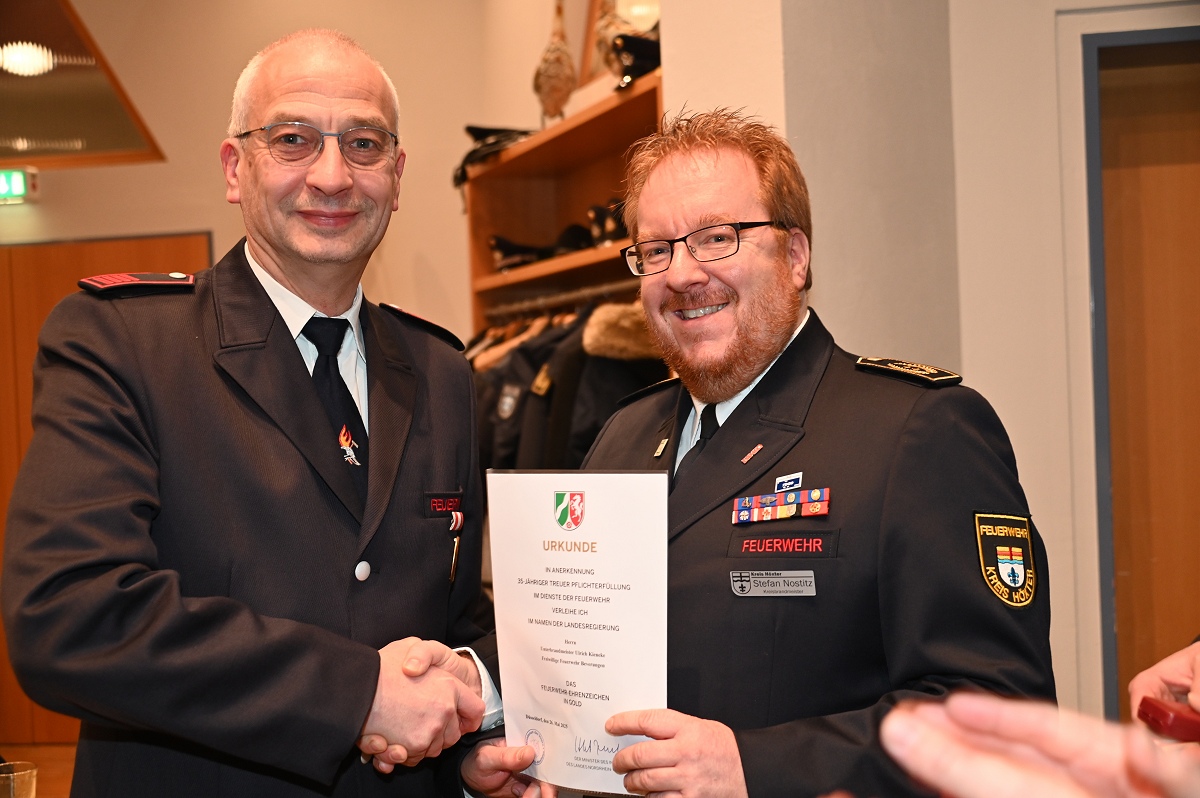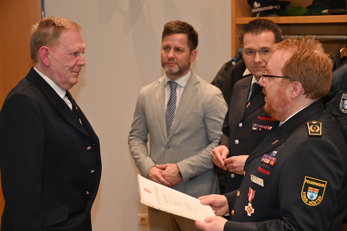 Das Feuerwehr-Ehrenzeichen des Landes in Gold für 35 Jahre aktiven Dienst ging an Stephan Sievers, Martin Beine, Klaus Even, Christoph Dierkes, Thomas Kröger, Tobias Dierkes, Markus Dierkes, Daniel Ernst, Kreisbrandmeister Stefan Nostiz, Andreas Nostitz und Ulrich Kieneke. Darüber hinaus wurden zahlreiche Sonderabzeichen des Verbandes der Feuerwehren NRW verliehen. Das Sonderabzeichen für 40 Jahre Feuerwehrmitgliedschaft in Silber erhielten Matthias Berg, Marc Schrick, Stefan Dewender, Arnold Dunschen und Franz Lavarino. Das Sonderabzeichen in Gold für 50 Jahre Mitgliedschaft verlieh Kreisbrandmeister Nostiz an Rudolf Berg, Günter Konzek, Ludwig Kuhn und Manfred Schade sowie für 60- bzw. 70-jährige Mitgliedschaft an Hans Lorenz Vössing und Josef Vössing.