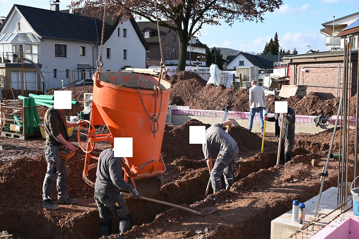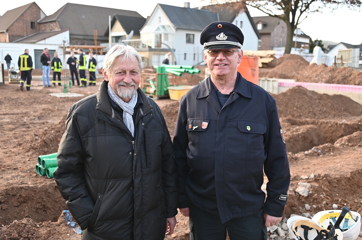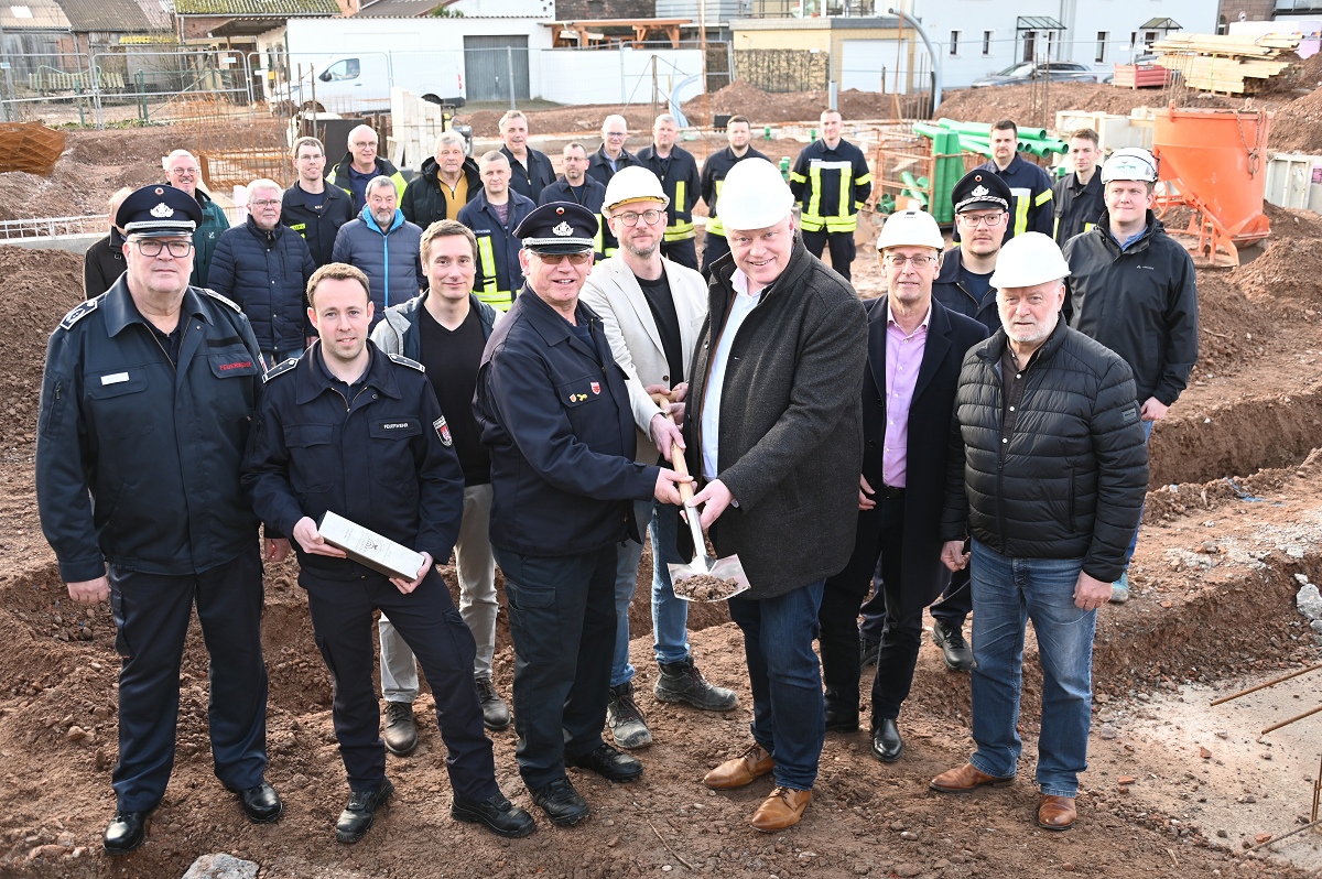 Architekt Schmidt verwies auf die durchdachte Planung des Neubaus: „Das Gebäude ist funktional gegliedert, bietet kurze Wege und schafft sichere sowie zeitgemäße Arbeitsbedingungen für die Einsatzkräfte.“ Der Neubau wird in Massivbauweise mit Flachdach errichtet. Mit der Ausführung der Bauarbeiten ist die Firma Nolte Hochbau beauftragt. Ein besonderer Schwerpunkt liegt auf Nachhaltigkeit und Energieeffizienz: Die Beheizung erfolgt über eine Wärmepumpe, sämtliche Räume werden mit Fußbodenheizung ausgestattet, während in der Fahrzeughalle die Bodenplatte thermisch aktiviert wird. Zusätzlich ist auf dem Flachdach eine Photovoltaikanlage vorgesehen. Insgesamt verfügt das Gebäude über eine Nutzfläche von rund 565 Quadratmetern bei einem Bruttorauminhalt von etwa 2.780 Kubikmetern. Der Alarmzugang erfolgt über den Plattenweg, an dem auch die Alarmparkplätze angeordnet sind. Der öffentliche Eingang sowie die Feuerwehrausfahrt orientieren sich zur Allenbergstraße und sorgen für klare und sichere Abläufe im Einsatzfall. Wehrführer Jürgen Schmits machte deutlich, wie notwendig der Neubau ist: „Das bisherige Gerätehaus aus dem Jahr 1964 entsprach nicht mehr den heutigen Anforderungen. Der Neubau ist ein wichtiger Schritt, um Einsatzbereitschaft, Ausbildung und Arbeitsschutz dauerhaft sicherzustellen.“ Auch Löschgruppenführer Bohnenpoll sieht der Zukunft positiv entgegen: „Mit den neuen Räumlichkeiten schaffen wir beste Voraussetzungen für eine leistungsfähige Feuerwehr und zeitgemäße Ausbildung. Davon profitieren sowohl die Aktiven als auch der Nachwuchs.“