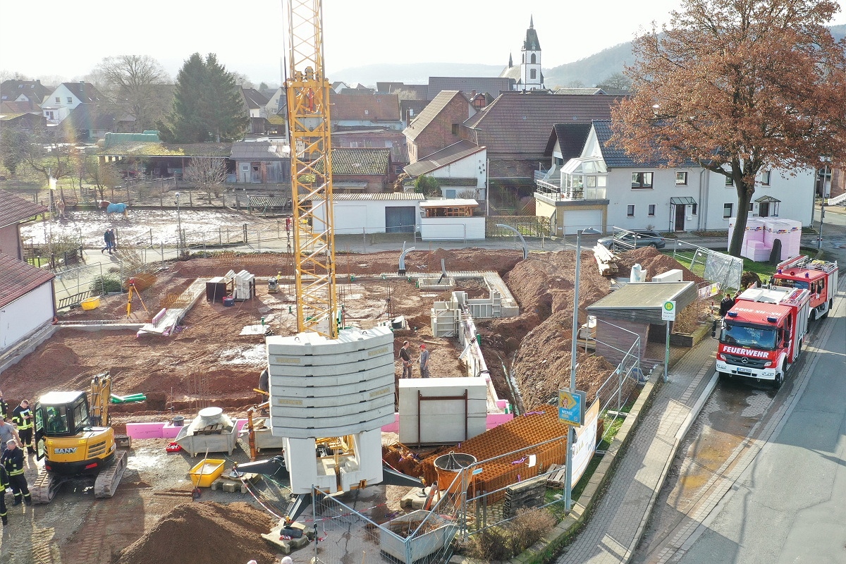 Lüchtringen (TKu). Aufgrund der in den vergangenen Tagen herrschenden winterlichen Wetterlage wurde am Dienstagnachmittag der symbolische erste Spatenstich für den Neubau des Feuerwehrgerätehauses der Löschgruppe Lüchtringen nachgeholt. Danach ging man direkt zur Grundsteinlegung über. In den Grundstein soll in Kürze noch eine Zeitkapsel eingepflegt werden, welche die aktuellen Tageszeitungen von Dienstag, den 24. Februar, einen Satz Hartgeld, einen Kümmerling, ein Blaulichtwasser sowie ein aktuelles Foto der Löschgruppe Lüchtringen enthält. Mit dem offiziellen Baustart rückte die Löschgruppe Lüchtringen geschlossen an: Mit beiden Einsatzfahrzeugen fuhren zwei Gruppen an die Baustelle, wo bei sonnigem Wetter der Beginn eines wichtigen Projekts markiert wurde. Ebenfalls mit dabei war auch eine große Abordnung der Ehrenabteilung der Löschgruppe Lüchtringen. Unter ihnen war auch der langjährige ehemalige stellvertretende Löschgruppenführer Josef Korte. Er war bereits bei der Grundsteinlegung des inzwischen abgerissenen Gerätehauses an gleicher Stelle mit dabei, das im Jahr 1964 fertiggestellt worden ist.