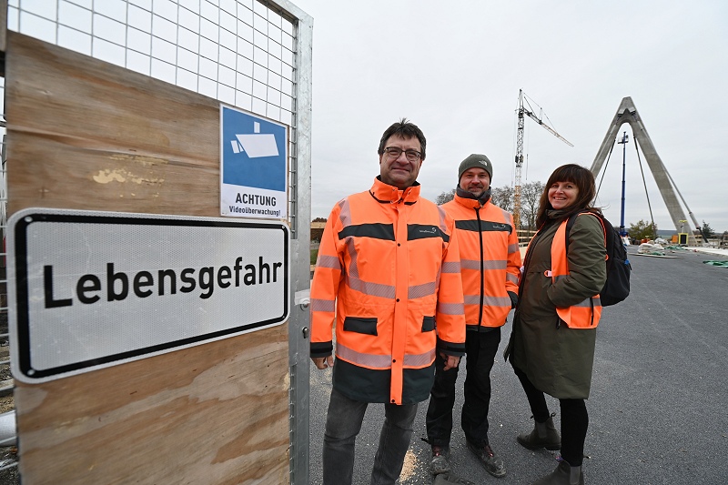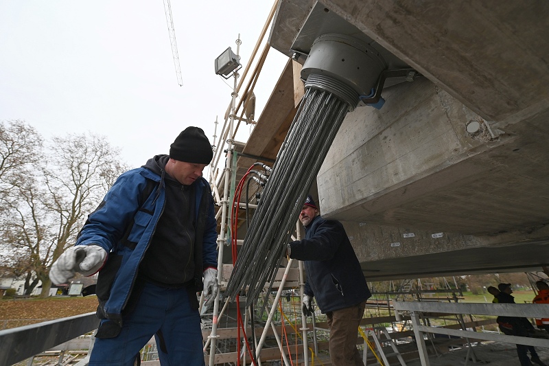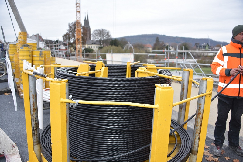 Ab dem ersten Februar sollen wieder Fahrzeuge über die Brücke rollen: Die Fahrbahn ist bereits fertiggestellt. Sie wurde nach einer Flüssigbeschichtung mit Brechsand versehen, der nun nur noch abgekehrt werden müsse, weiß Bauüberwacher Björn Schlüter zu berichten. Aktuell konzentrieren sich die Arbeiten parallel zur Fertigstellung des Fußweges auf den zweiten Spannvorgang der Seilverspannung. Danach werden nur noch Kontrollmessungen durchgeführt und die Seile mit Korrosionsschutz versehen. Die vier Spannseile, die aus je 43 Litzen bestehen, sind vom Pylon zum Querträger befestigt worden.