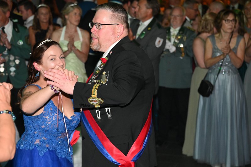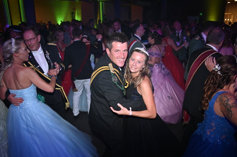 Es war ein imposantes und farbenprächtiges Bild, das sich ergab, als sich die Königspaare samt Hofstaaten und Schützen gemeinsam mit drei Musikkapellen die Marktstraße hinauf in Richtung Stadthalle im Festumzug auf den Weg machten. Dazu wurde auch das Landesgartenschaugelände in der Wallstraße überquert, weil Bürgermeister Daniel Hartmann im Umzug ganz vorne mit dabei war und den Schlüssel für das Tor in der Tasche hatte. Bewegt von dem prächtigen Anblick war neben Bürgermeister Daniel Hartmann und der Bezirksbundesmeister Stefan Rüther, der zusammen mit dem Bürgermeister in der aus „allen Nähten platzenden“ Stadthalle ein paar kurze Grußworte an die Gäste richtete. Bevor der Ball der Könige jedoch offiziell mit dem Königstanz startete, begrüßte Brudermeister Stefan Berens sämtliche geladenen Gäste, Obristen und Majestäten einzeln mit Namen. Nach dem Abendessen eröffneten dann die Bezirkskönige Wolfgang Schröder von der St. Sebastianus Schützenbruderschaft Bödexen und Markus Scholz von St. Kilian Lügde die Tanzfläche und somit auch den Königsball gemeinsam mit ihren Königinnen zum Lied „Moviestar“. Musikalisch unterhielt die Band „Unglaublich“ die Gäste an diesem Abend. „Wir freuen uns, dass wir dem Bezirkskönigspaar Wolfgang und Marion Schröder sowie unserem aktuellen Altkönigspaar Melanie und Rüdiger Überdick sowie dem Jungkönigspaar Bianca Heinemann und Frederik Rehker einen schönen Abschluss der Schützenfestsaison 2023 anbieten konnten“, erklärte Brudermeister Stefan Berens. „Royal“ gefeiert wurde der Ball anschließend noch bis tief in die Nacht hinein.