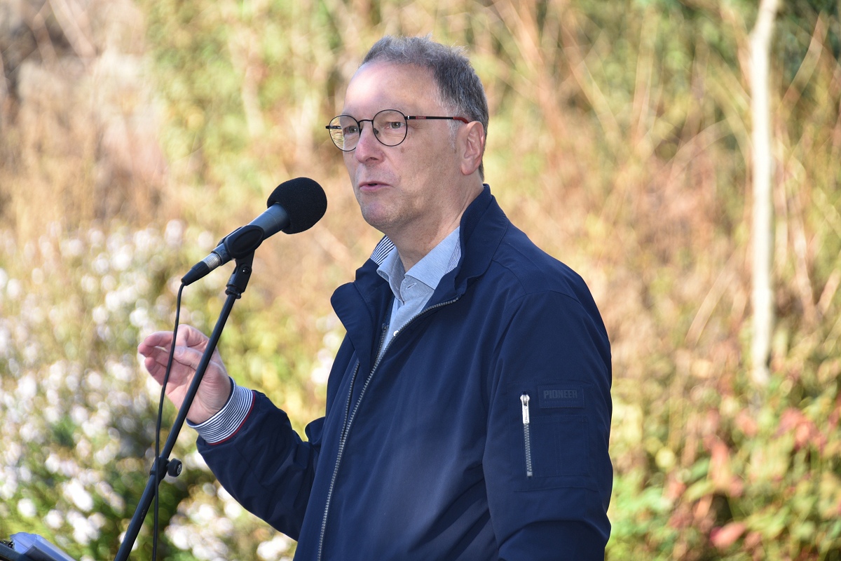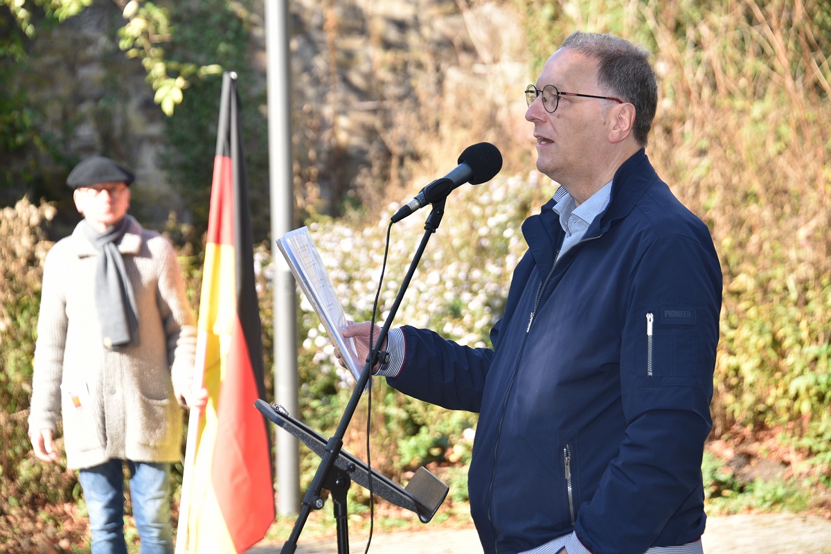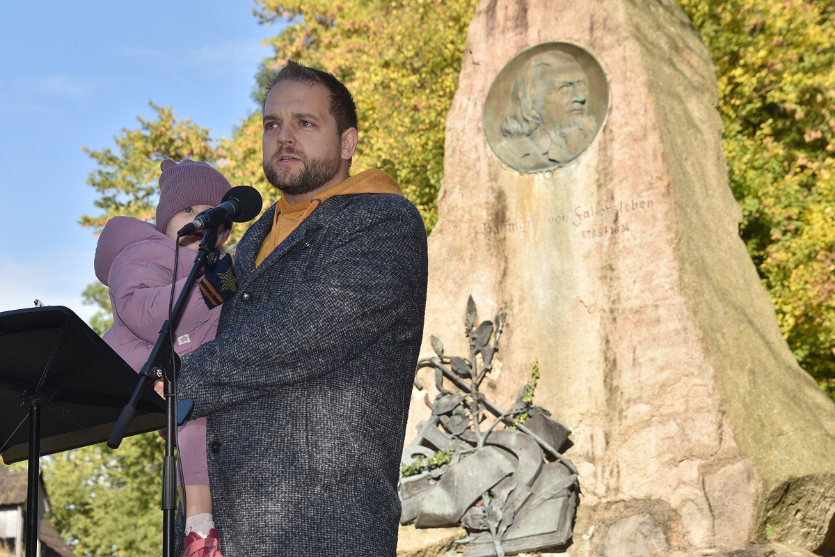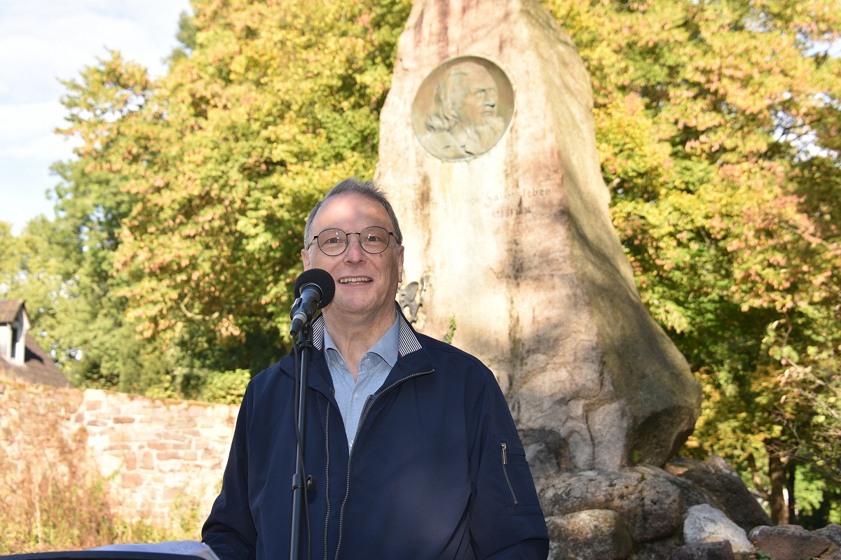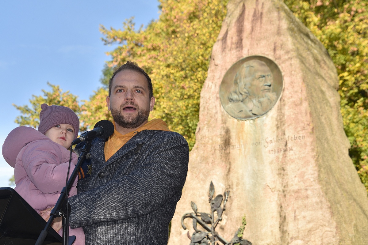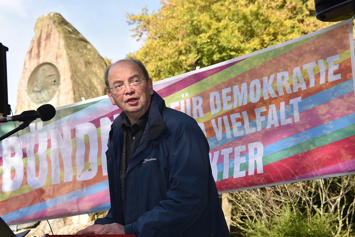 Und so fehlte in dem passenden Motto „Starke Worte. Starke Orte“ eigentlich nur noch die Ergänzung „mit starken Liedern“, meinte eine Besucherin. Einen Rückblick in die Geschichte brachte das Grußwort von Dr. Michael Stoltz, Vorsitzender des Arbeitskreises Hoffmann von Fallersleben im Heimat- und Verkehrsverein Höxter e.V., mit sich, das von Helmut Lensdorf verlesen wurde. Stoltz, der persönlich nicht anwesend sein konnte, spannte einen historischen Bogen: von den Bauernkriegen über die Revolution von 1848 bis hin zur Weimarer Republik und zum Grundgesetz. Er erinnerte daran, dass Demokratie stets erkämpft und verteidigt werden müsse. „Heute stehen wir wieder an einem Punkt, der verlangt, Farbe zu bekennen, die Demokratie zu verteidigen, die Würde aller Menschen zu schützen. Demokratie ist keine Selbstverständlichkeit, sondern eine gemeinsame Aufgabe.“