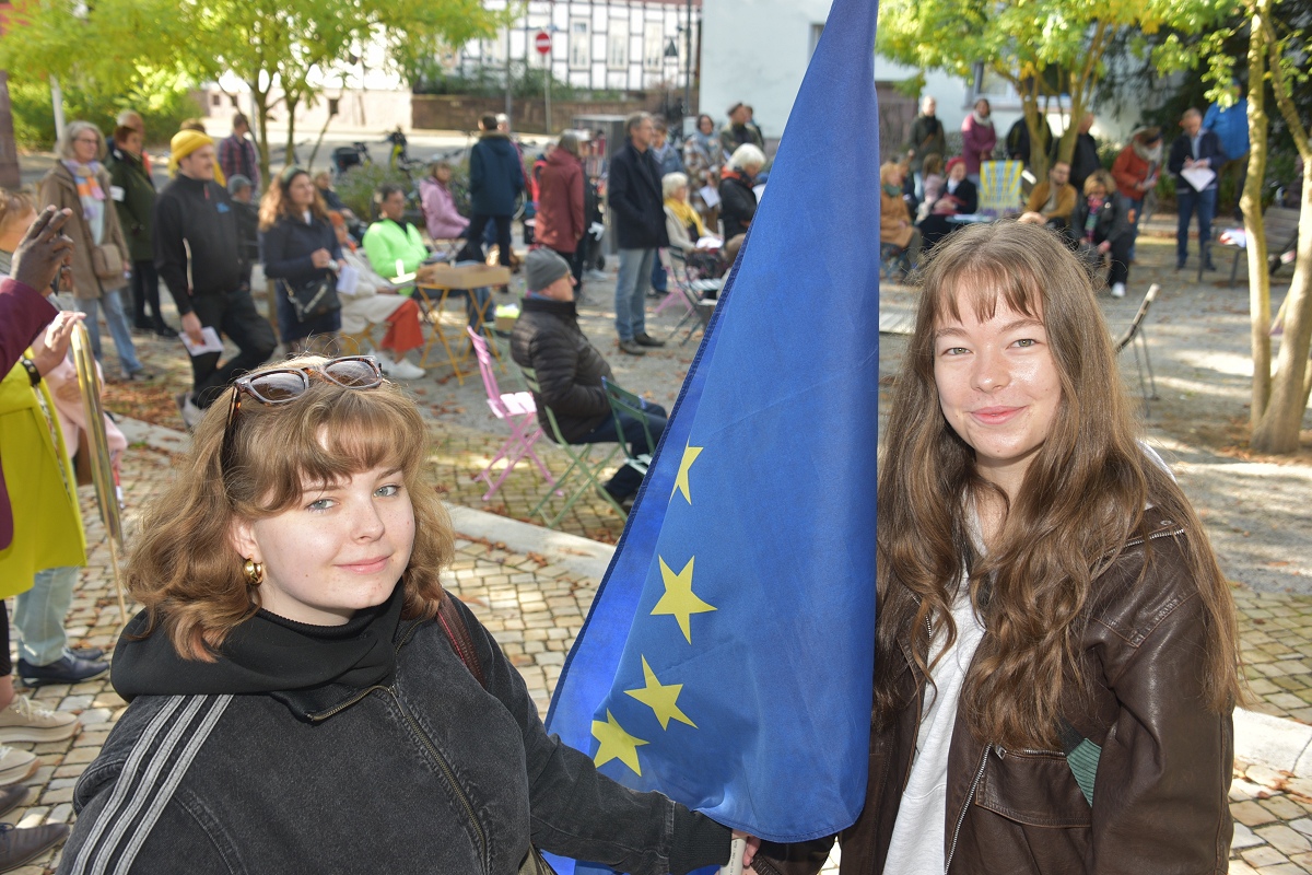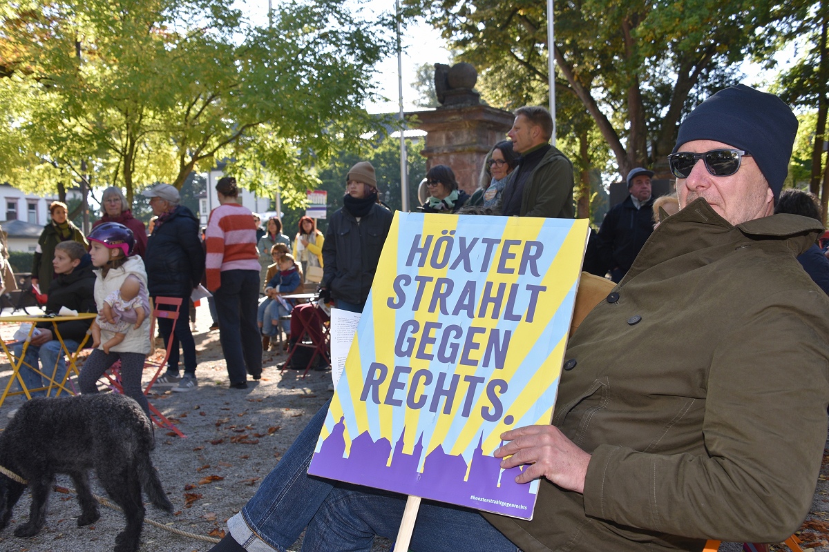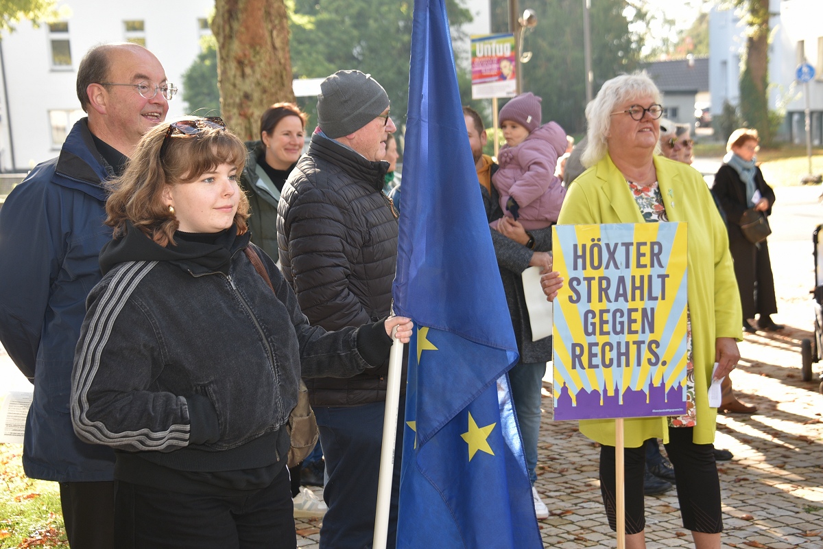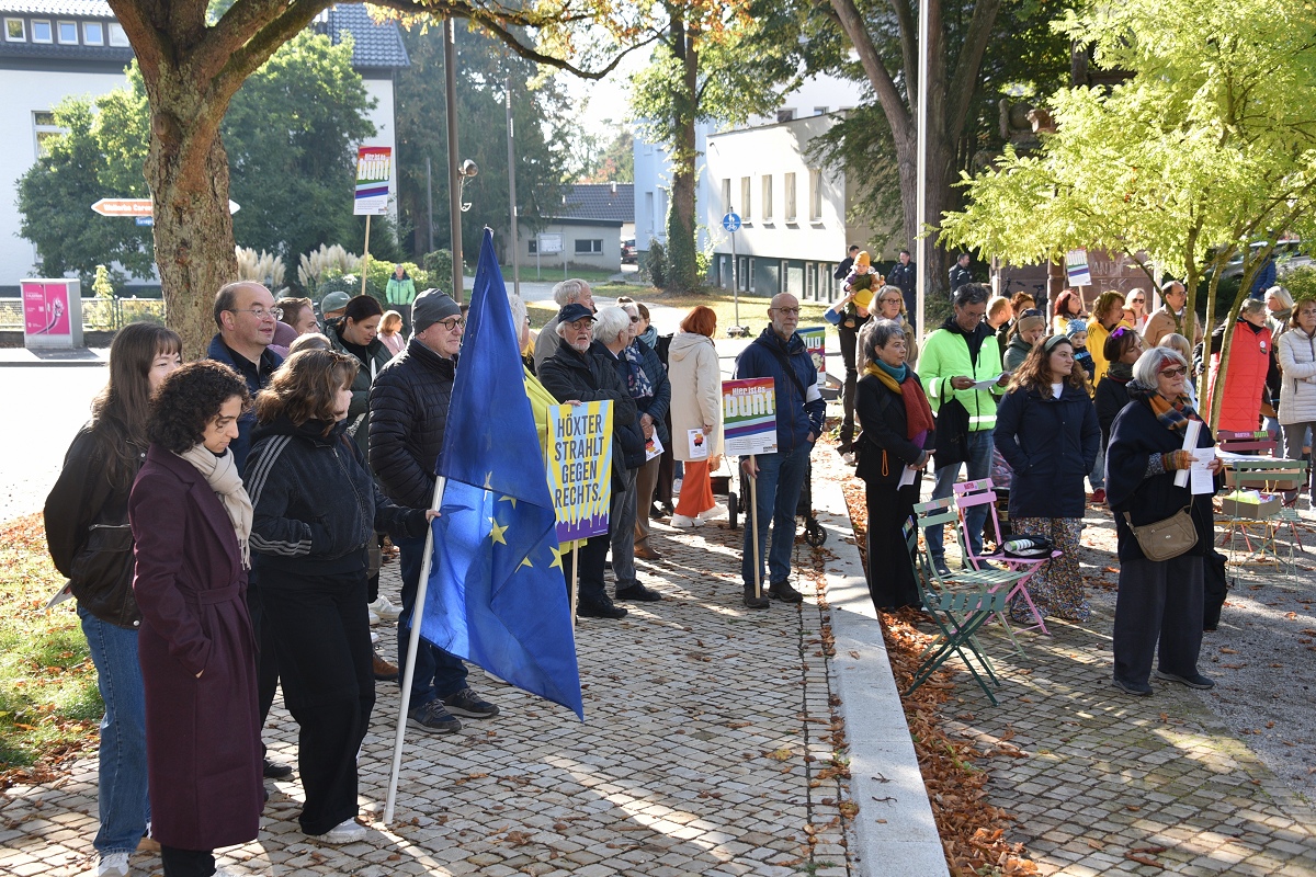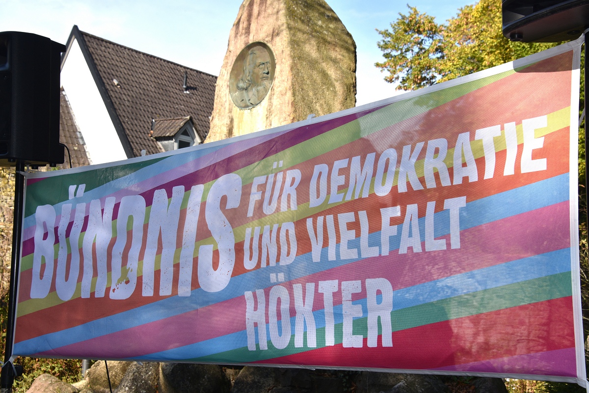 Höxter (TKu). Etwa 100 Teilnehmende setzten am Tag der Deutschen Einheit ein besonderes Zeichen für „Einigkeit und Recht und Freiheit“. Organisiert vom „Bündnis für Demokratie und Vielfalt Höxter“ haben die 100 Teilnehmer mit dem vom Aller.Land-Programm geförderten Projekt „Starke Worte. Starke Orte“ ein klares Zeichen für Freiheit, Toleranz und Zusammenhalt gesetzt. Über der Veranstaltung stand das Motto „Einigkeit und Recht und Freiheit“, Worte, die aktueller denn je wirken. Versammlungsleiter und Bündnis-Sprecher Helmut Lensdorf eröffnete die Kundgebung: „Wir wollen Haltung zeigen für Demokratie und Vielfalt.“ Damit gab er den Ton für ein Programm vor, das Politik, Kultur und Musik miteinander verband. Für den musikalischen Rahmen sorgte Singer-Songwriter Phil Solo aus Detmold zusammen mit dem Musiker Hans Hermann Jansen, die das Thema „Zusammenhalt und Solidarität“ eindringlich vertonten. Maja Machalke vom Projektteam „Starke Worte. Starke Orte“ nahm die berühmten Hymnenzeilen zum Anlass für eine pointierte Analyse. „Einigkeit bedeutet, auch Unterschiedlichkeit auszuhalten. Recht heißt, das Richtige zu tun. Und Freiheit bedeutet nicht, alles machen zu können, was man will, sondern dass alle ihren Freiheitsraum leben dürfen.“ Ihre Worte waren zugleich Einladung und Ermutigung, das Ideal der Nationalhymne auf das Heute zu beziehen.