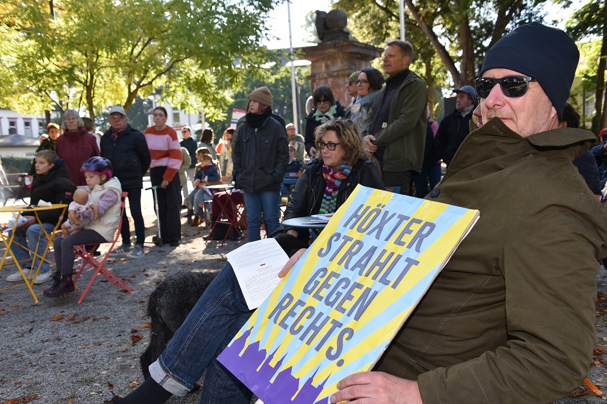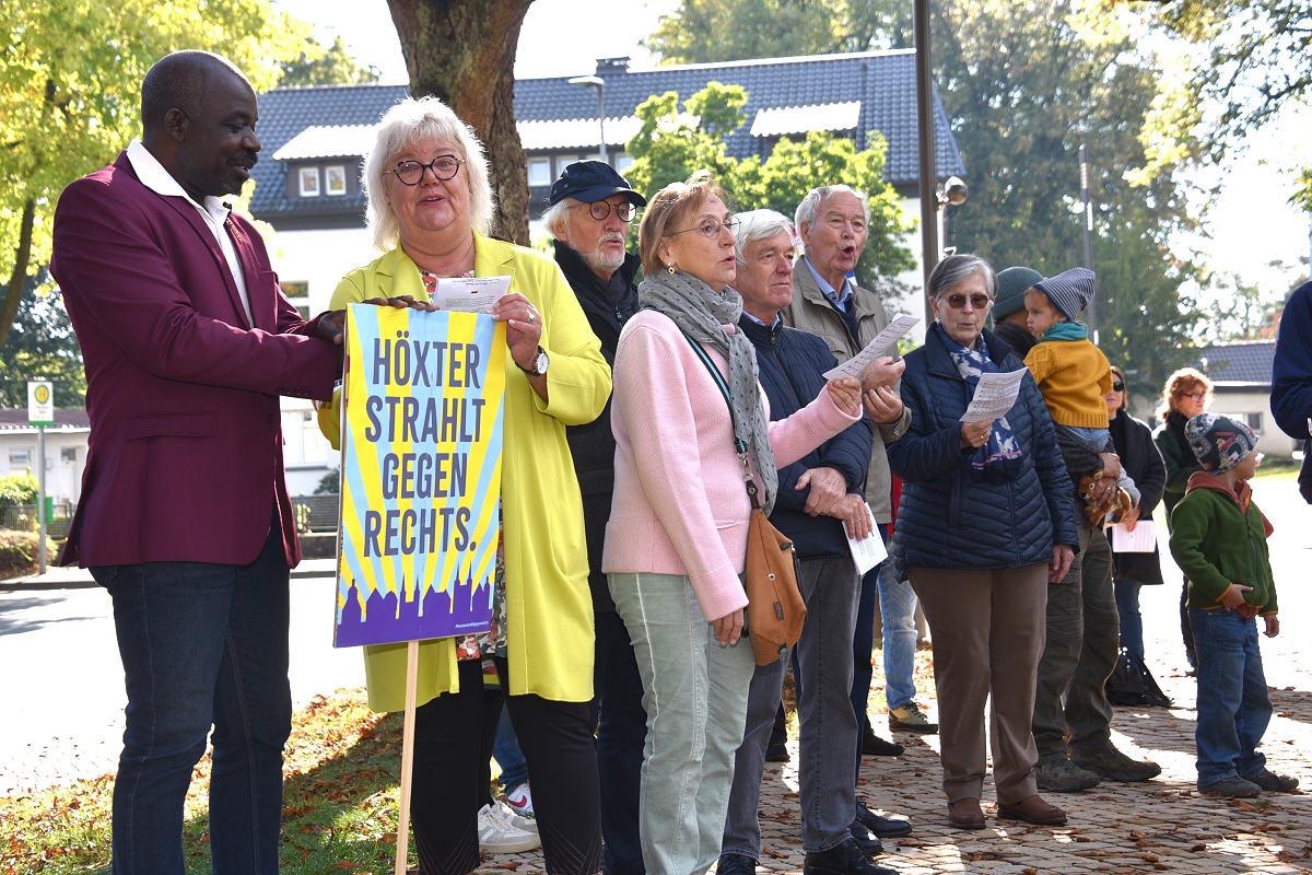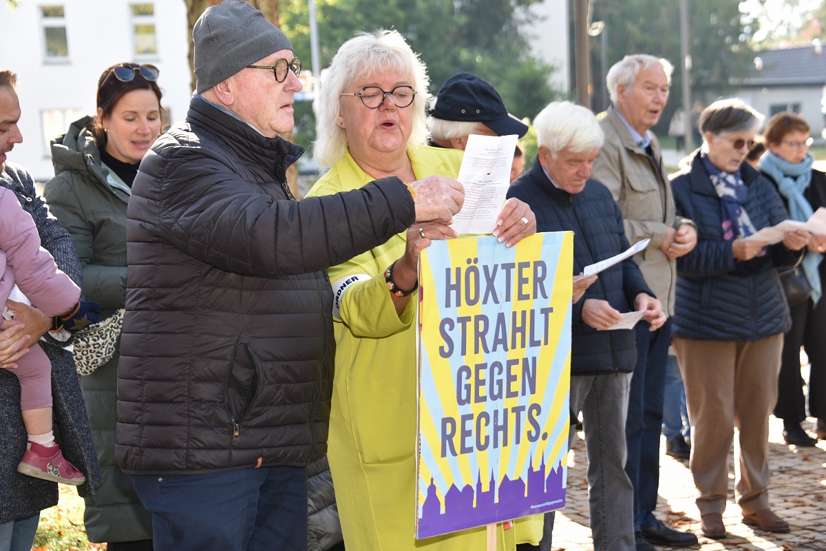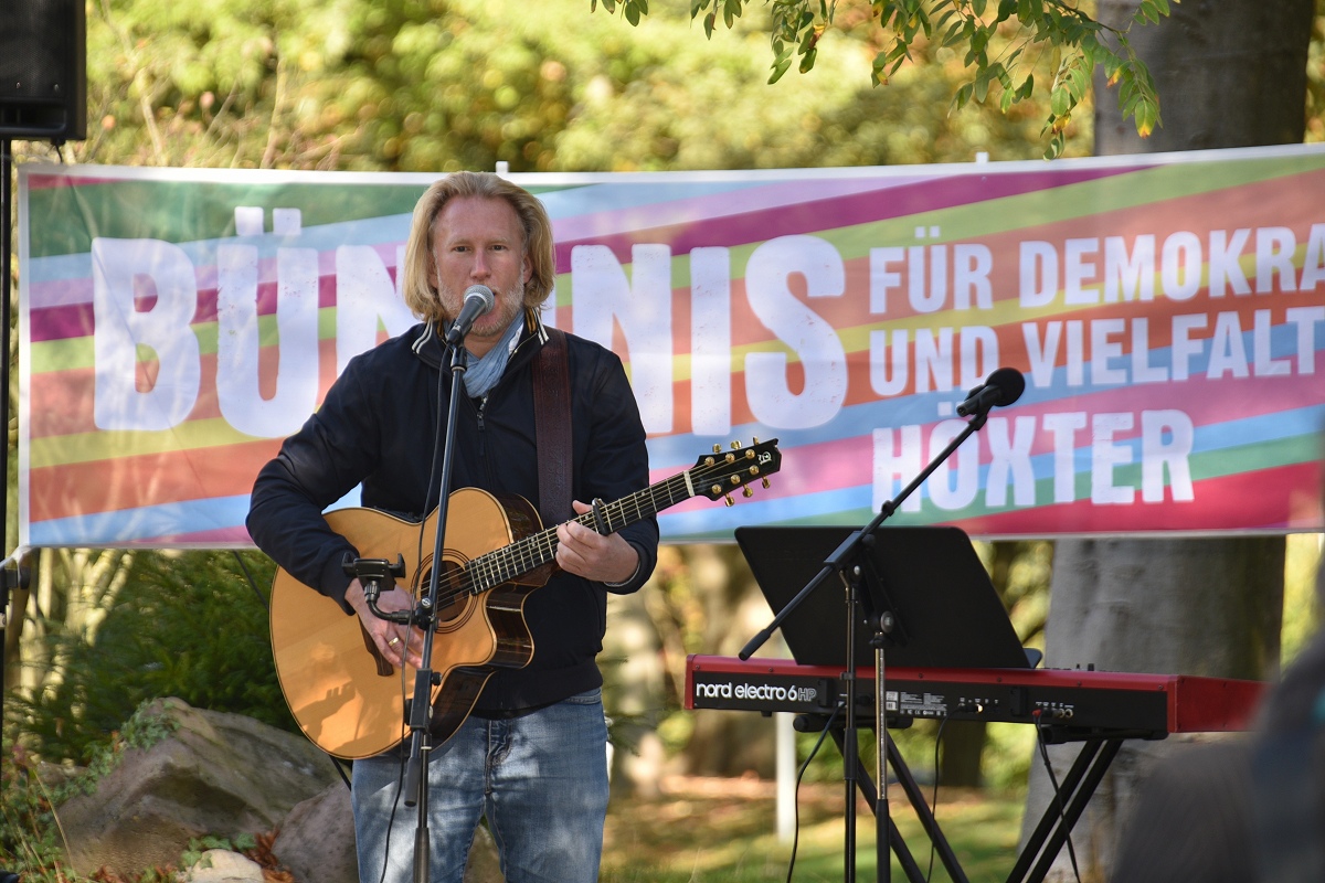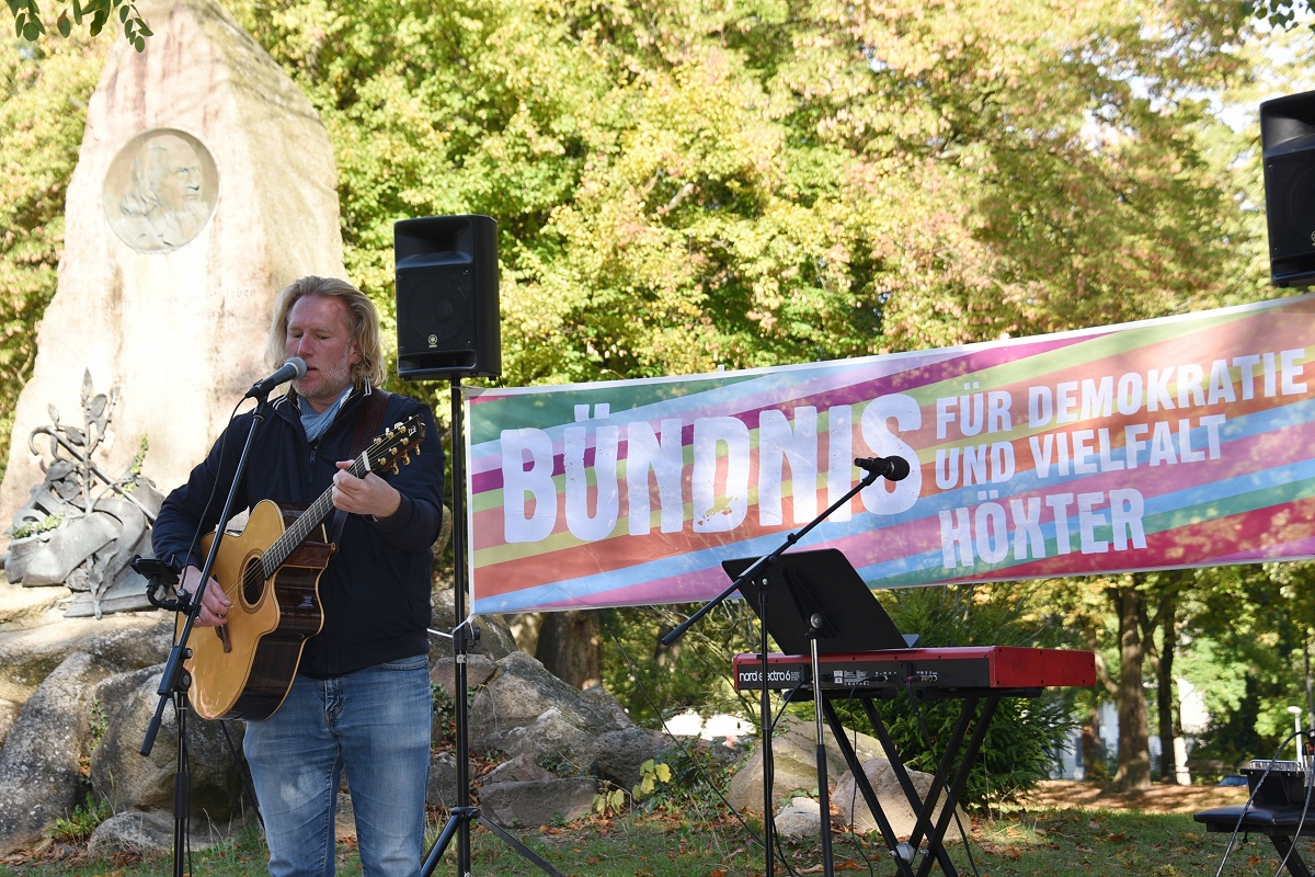 Der evangelische Pfarrer Tim Wendorff aus Höxter trug Hasskommentare aus dem Internet vor. Mit scharfen Beispielen verdeutlichte er den Anwesenden, wie verletzend und gefährlich menschenverachtende Sprache wirkt. „Diese Internetkommentare haben mit ‚Einigkeit und Recht und Freiheit‘ nichts zu tun“, betonte Wendorff. „Wenn Freiheit missbraucht wird, schränkt sie die Freiheit anderer ein.“ Zwischen den Redebeiträgen setzten Hans Hermann Jansen und das Projektteam musikalische Akzente, womit sie die Teilnehmenden aktiv eingebunden haben. Gemeinsam wurden starke Lieder gesungen wie das alte Volkslied „Die Gedanken sind frei“, die dritte Strophe von Hoffmann Von Fallersleben seinem Deutschlandlied, ergänzt durch Brechts Kinderhymne „Anmut sparet nicht noch Mühe“ auf die Melodie der Nationalhymne oder aber auch die Europahymne „Freude schöner Götterfunken“.