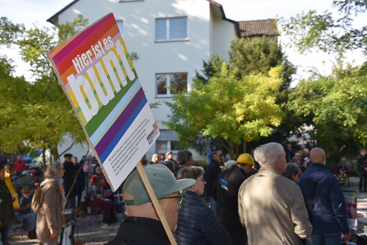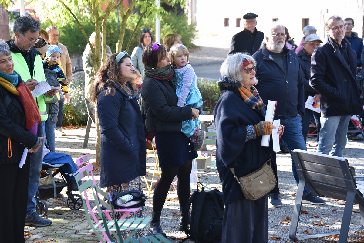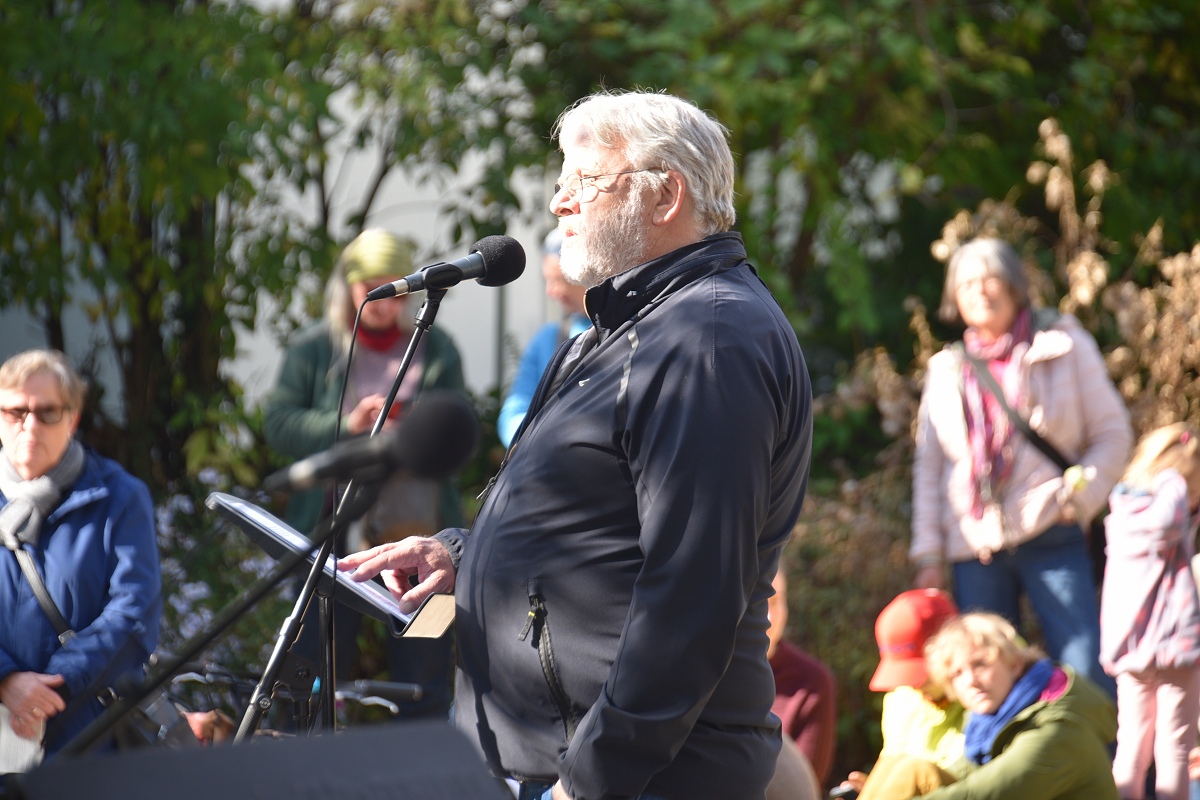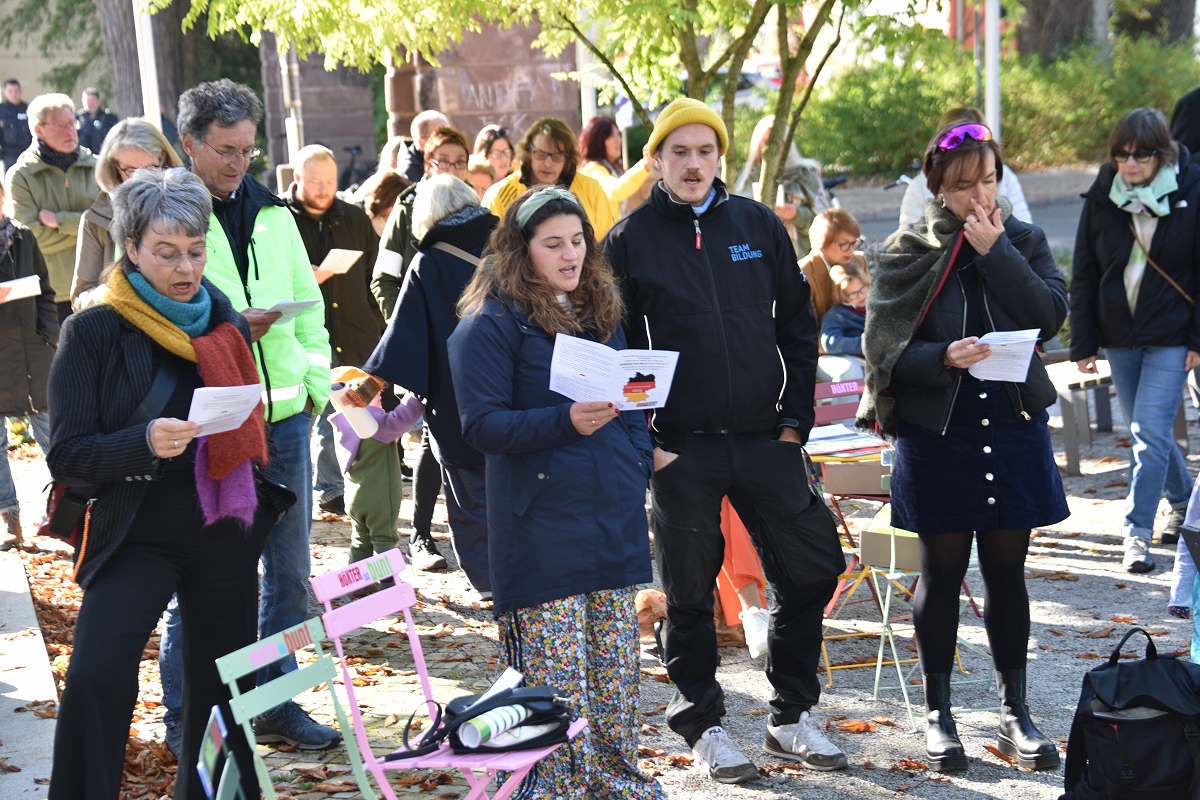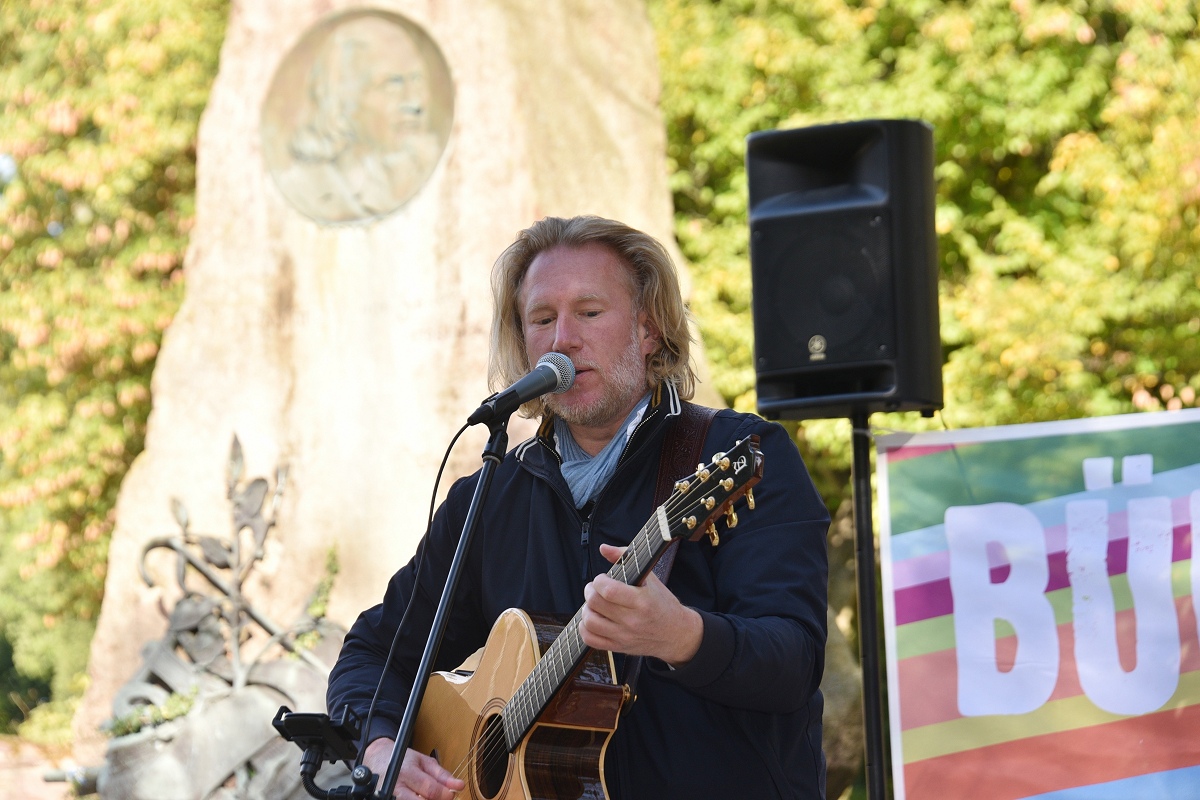 Der evangelische Pfarrer Tim Wendorff aus Höxter trug Hasskommentare aus dem Internet vor. Mit scharfen Beispielen verdeutlichte er den Anwesenden, wie verletzend und gefährlich menschenverachtende Sprache wirkt. „Diese Internetkommentare haben mit ‚Einigkeit und Recht und Freiheit‘ nichts zu tun“, betonte Wendorff. „Wenn Freiheit missbraucht wird, schränkt sie die Freiheit anderer ein.“ Zwischen den Redebeiträgen setzten Hans Hermann Jansen und das Projektteam musikalische Akzente, womit sie die Teilnehmenden aktiv eingebunden haben. Gemeinsam wurden starke Lieder gesungen wie das alte Volkslied „Die Gedanken sind frei“, die dritte Strophe von Hoffmann Von Fallersleben seinem Deutschlandlied, ergänzt durch Brechts Kinderhymne „Anmut sparet nicht noch Mühe“ auf die Melodie der Nationalhymne oder aber auch die Europahymne „Freude schöner Götterfunken“.