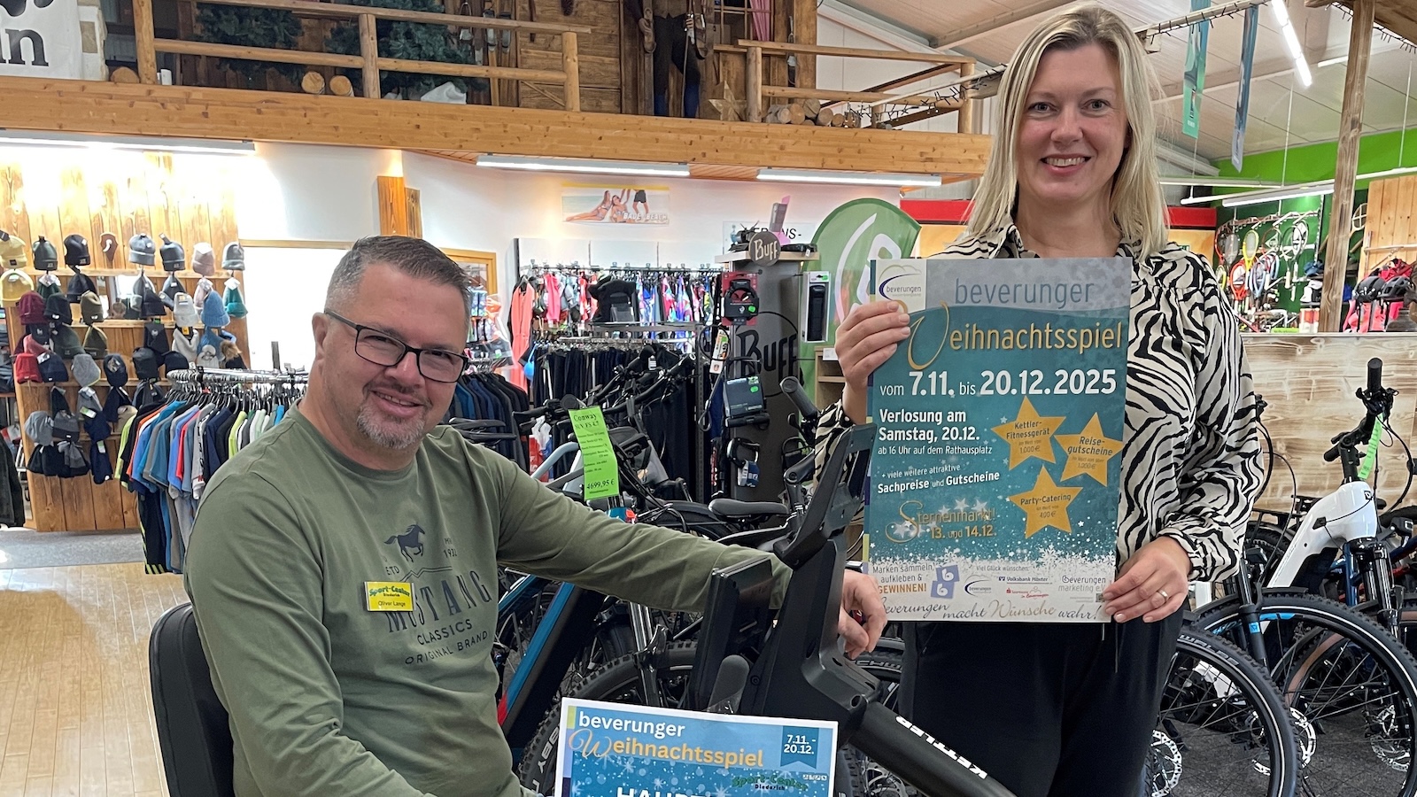 Oliver Lange (Sport-Center Diederich) und Nicole Bartolles (Beverungen Marketing e.V.) präsentieren den diesjährigen Hauptpreis