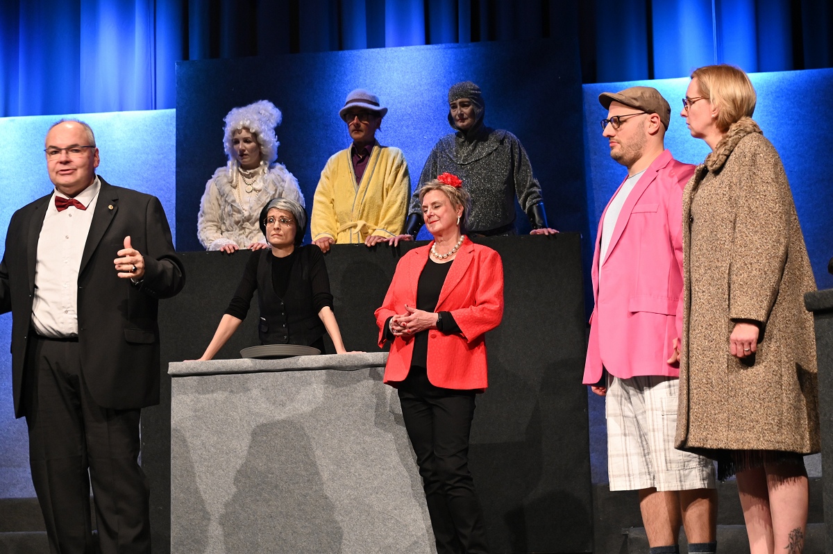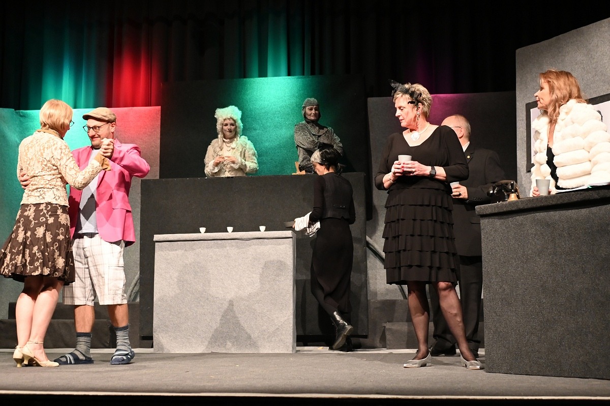 Ottbergen (TKu). Das Theater-Ensemble ThimKu, Theater im Kuhstall, hat am vergangenen Wochenende mit seiner neuen Komödie „Burghotel Schlosshof – Kredit wird nicht gegeben“ von Evelyn Köster erfolgreich abgeliefert. Am 8. und 9. November feierte das Stück im voll besetzten Kuhstall in Ottbergen seine Premiere mit zwei Aufführungen. Das Publikum zeigte sich begeistert von der turbulenten Handlung und dem, mit viel Freude agierenden, Ensemble, das an beiden Abenden mit viel Applaus belohnt wurde. Im Mittelpunkt der Aufführung steht das Burghotel Schlosshof, ein in die Jahre gekommener Hotelkomplex, der kurz vor dem Aus steht. Hoteldirektor Fröhlitsch, seine Mitarbeiterinnen Pitrella Partinowa und Hannelore Prügelhausen sowie zwei liebreizende Geister setzen große Hoffnungen in eine illustre Gästeschar. Doch unter ihnen soll sich auch ein Spion der Finanz- und Bilanz AG befinden. Mit einer Mischung aus Humor, Spannung und skurrilen Eigenheiten nimmt das Ensemble das Publikum mit in eine Welt voller Rätsel, Notizbücher und schräger Überraschungen. Besonders war dieser Premierenstart auch für Maren Schlebusch, Gründungsmitglied des ThimKu e. V., die mit dieser Inszenierung ihr Regiedebüt gab.