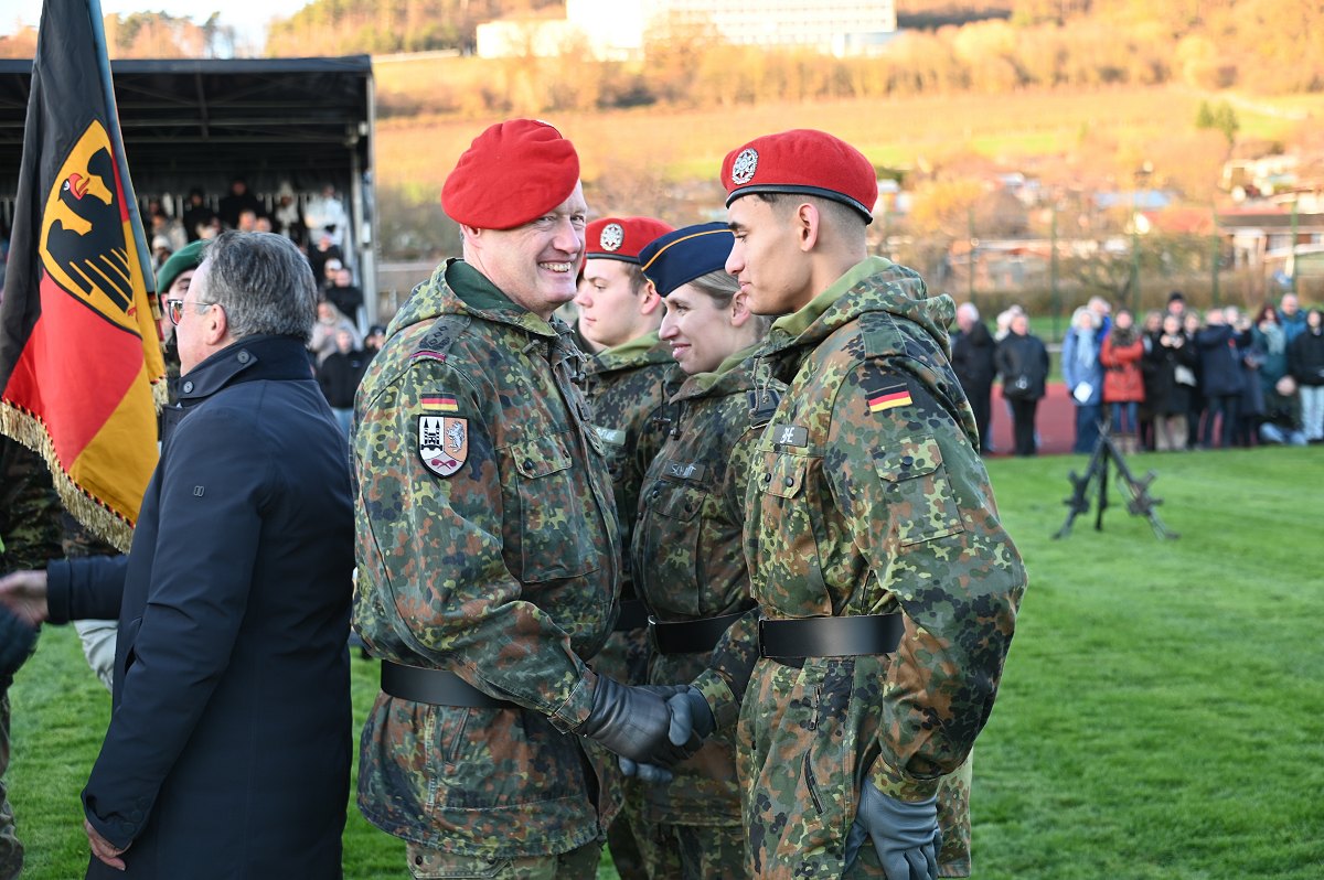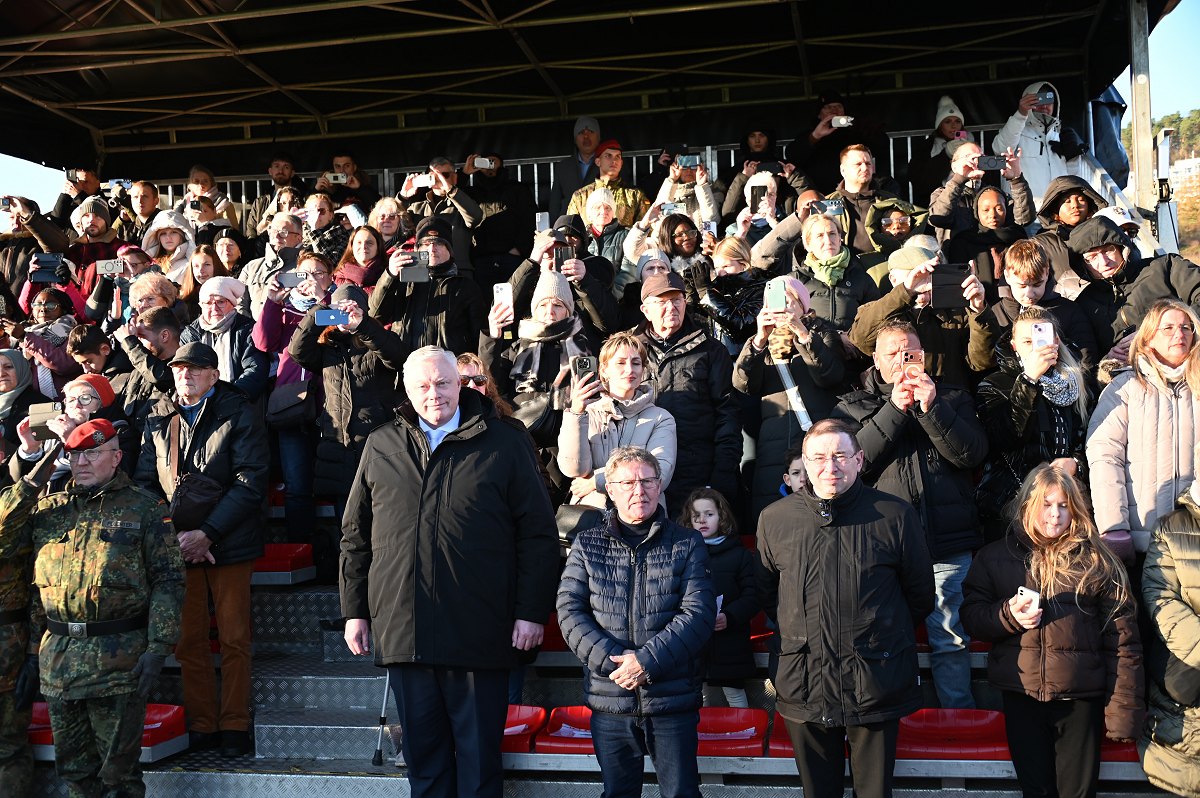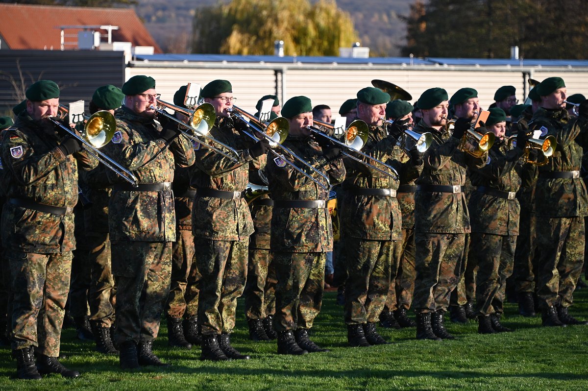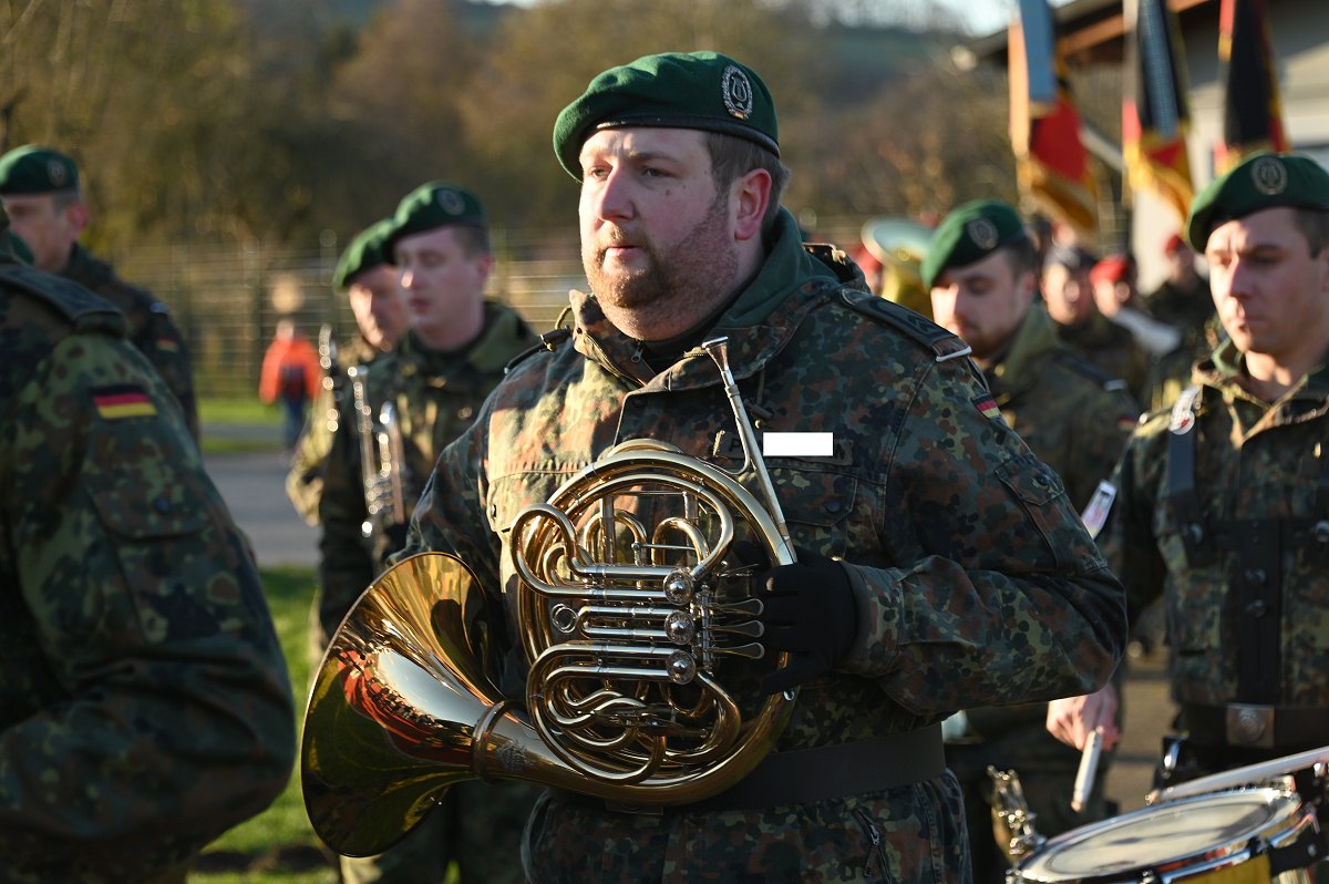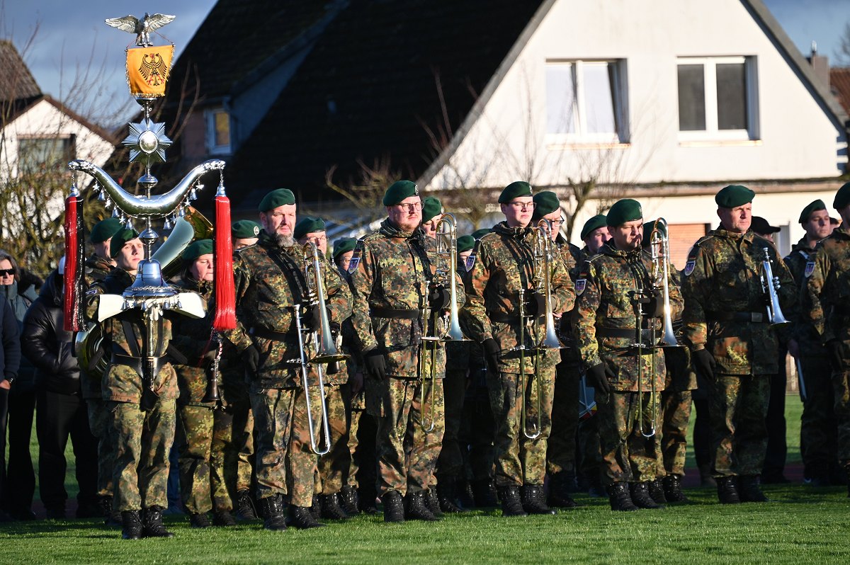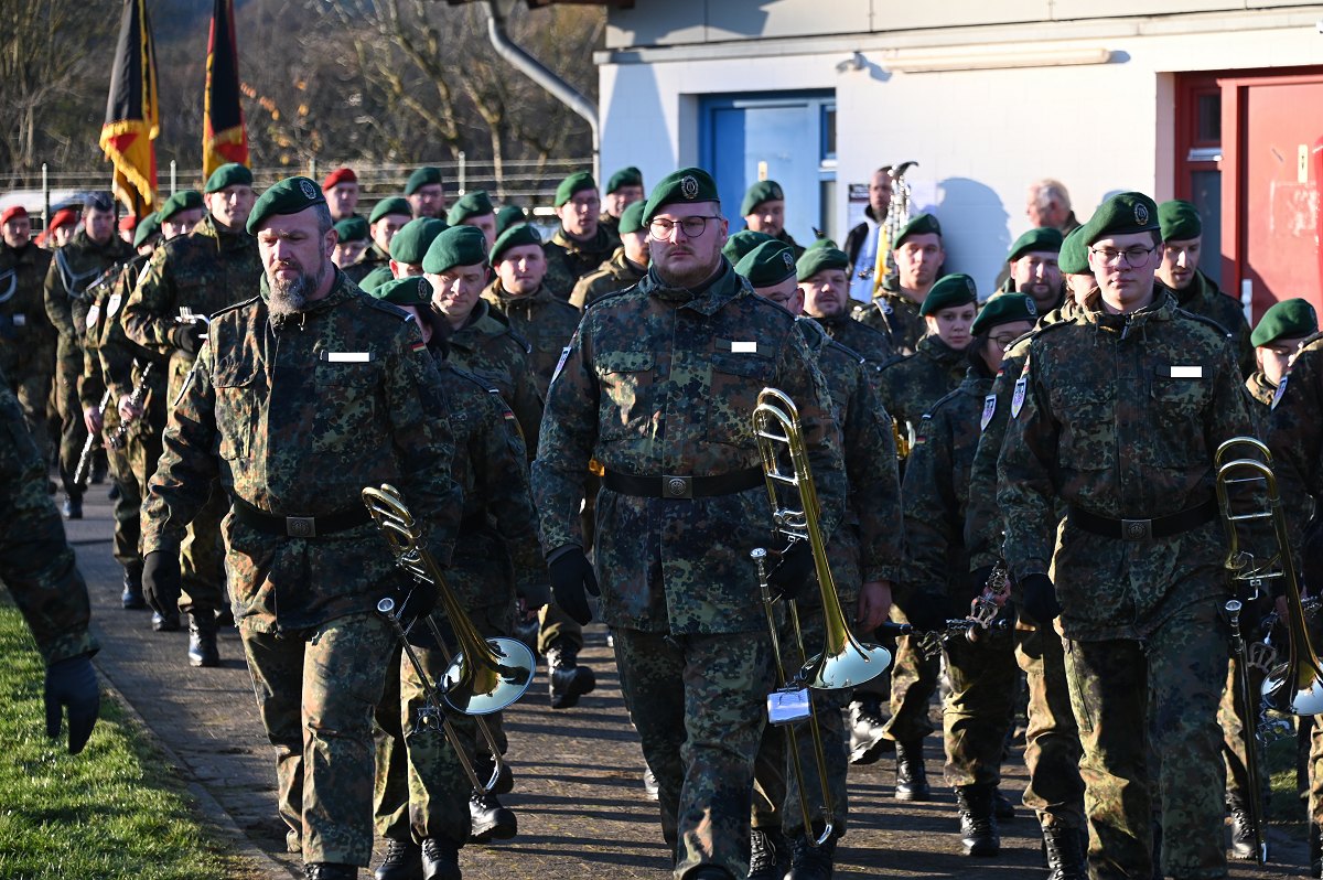 Der zentrale Moment des Appells folgte, als die Fahnenabordnungen und die Rekrutenabordnungen antraten, die Truppenfahnen gesenkt wurden und Oberst Lutz die Eidesformel sprach. Während das Heeresmusikkorps Kassel traditionelle Stücke wie den Preußischen Präsentiermarsch und das Altniederländische Dankgebet intonierte, legten die Rekruten ihr Gelöbnis ab: der Bundesrepublik Deutschland treu zu dienen und das Recht und die Freiheit des deutschen Volkes tapfer zu verteidigen. Es war ein Augenblick spürbarer Ernsthaftigkeit, der sich auch auf die viele Angehörigen übertrug, die diesen Schritt ihrer Söhne, Töchter und Partnerinnen sichtlich bewegt verfolgten. Mit der Nationalhymne erreichte der Appell seinen feierlichen Höhepunkt. Nach der offiziellen Feststellung des Gelöbnisses durch den Kommandeur folgten Gratulationen, persönliche Worte und Erinnerungsfotos bzw. -videos. Mit dem Ausmarsch der Ehrenformation endete der offizielle Teil der Veranstaltung, doch für die Rekrutinnen und Rekruten beginnt nun der nächste Abschnitt ihrer militärischen Ausbildung.