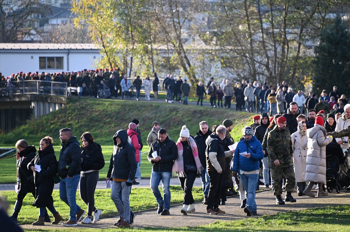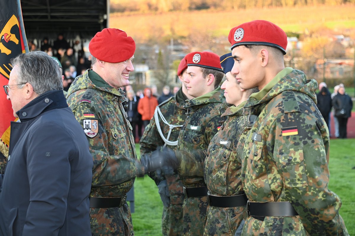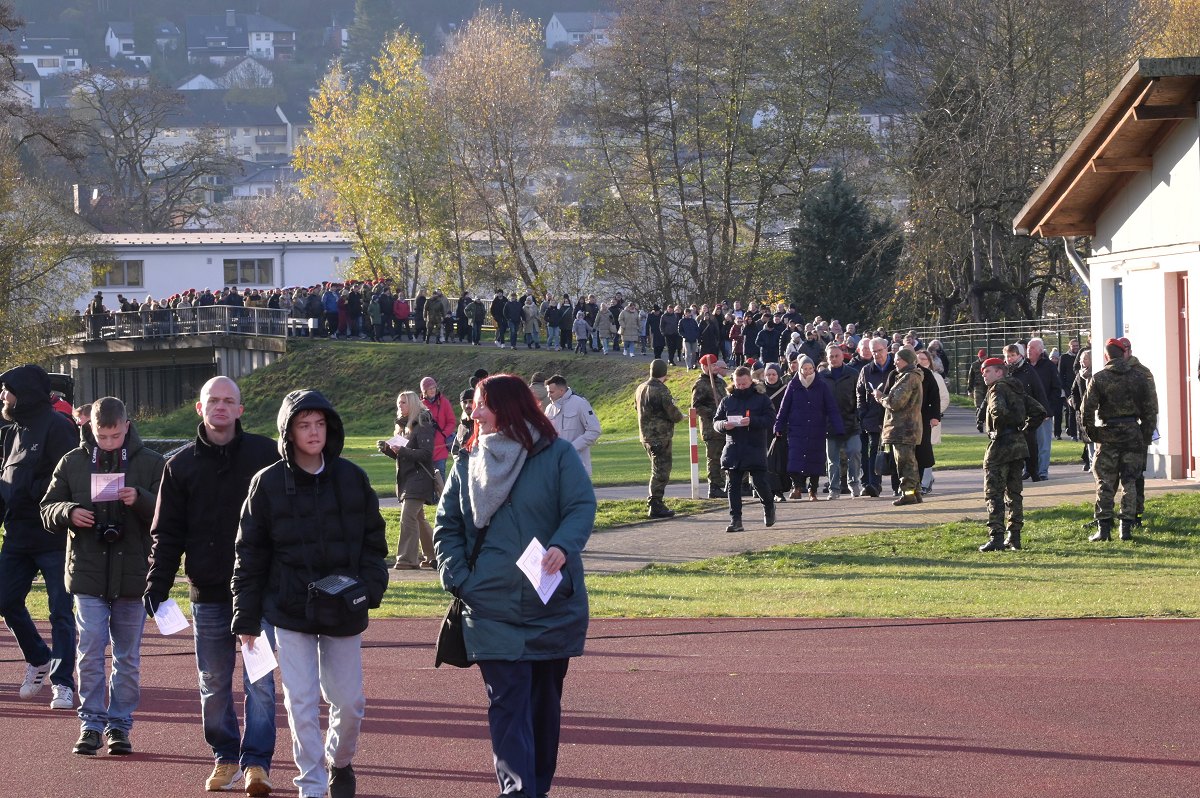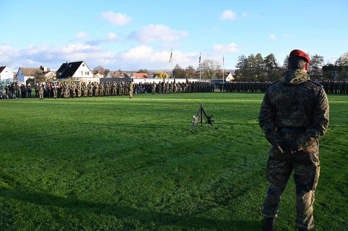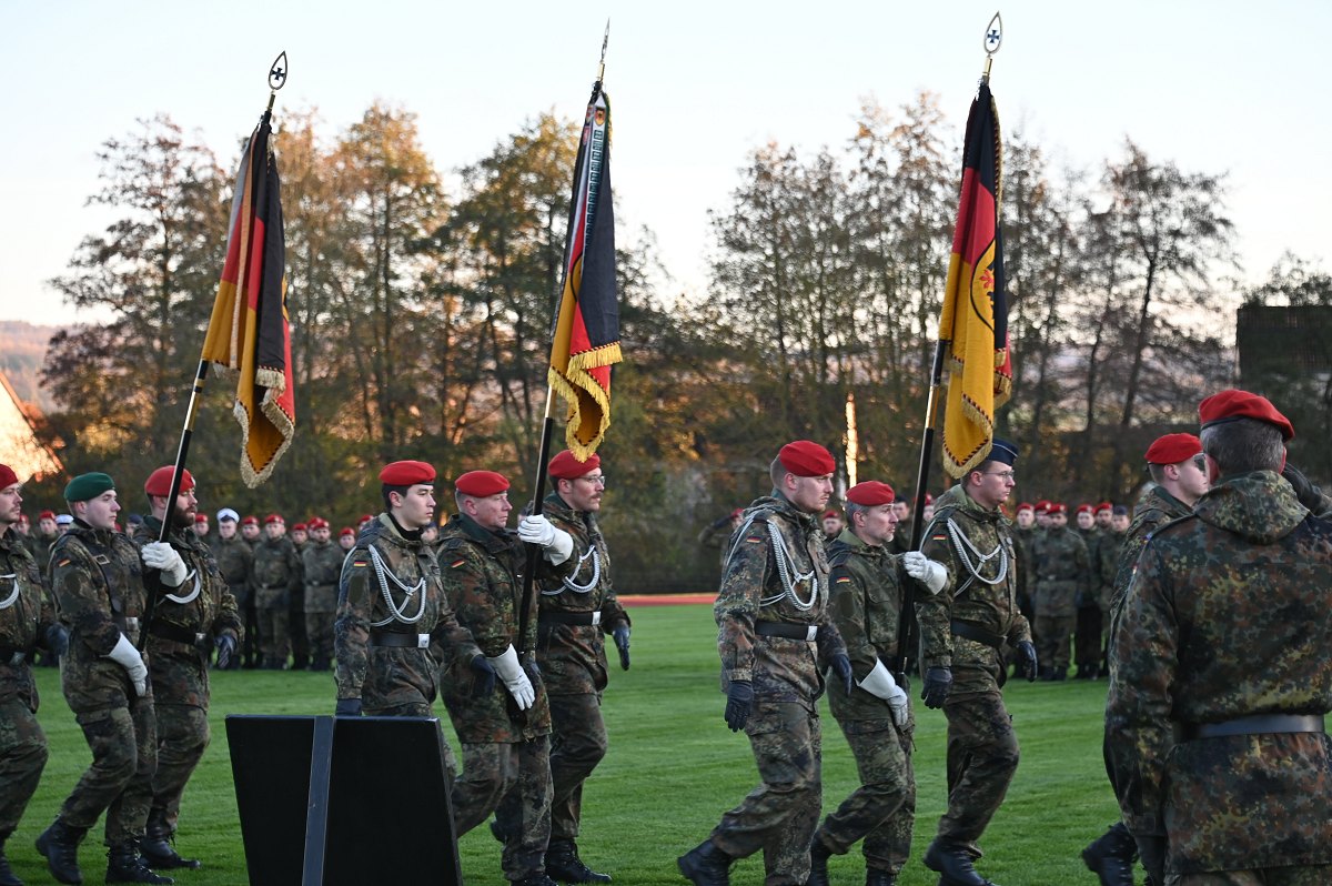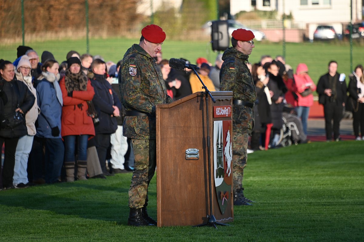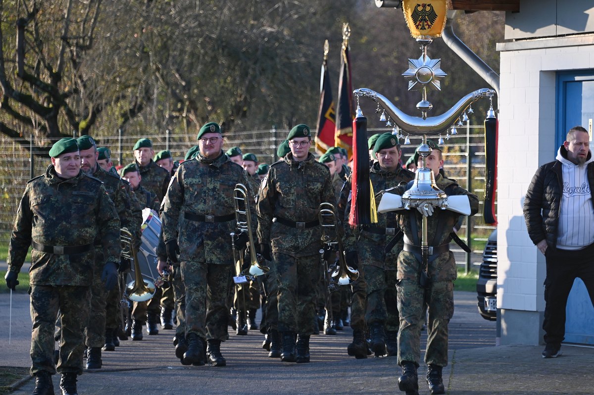 Der zentrale Moment des Appells folgte, als die Fahnenabordnungen und die Rekrutenabordnungen antraten, die Truppenfahnen gesenkt wurden und Oberst Lutz die Eidesformel sprach. Während das Heeresmusikkorps Kassel traditionelle Stücke wie den Preußischen Präsentiermarsch und das Altniederländische Dankgebet intonierte, legten die Rekruten ihr Gelöbnis ab: der Bundesrepublik Deutschland treu zu dienen und das Recht und die Freiheit des deutschen Volkes tapfer zu verteidigen. Es war ein Augenblick spürbarer Ernsthaftigkeit, der sich auch auf die viele Angehörigen übertrug, die diesen Schritt ihrer Söhne, Töchter und Partnerinnen sichtlich bewegt verfolgten. Mit der Nationalhymne erreichte der Appell seinen feierlichen Höhepunkt. Nach der offiziellen Feststellung des Gelöbnisses durch den Kommandeur folgten Gratulationen, persönliche Worte und Erinnerungsfotos bzw. -videos. Mit dem Ausmarsch der Ehrenformation endete der offizielle Teil der Veranstaltung, doch für die Rekrutinnen und Rekruten beginnt nun der nächste Abschnitt ihrer militärischen Ausbildung.
