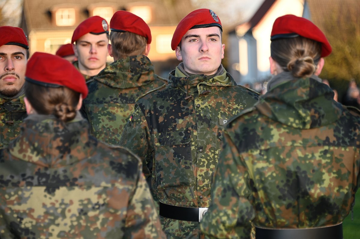 Höxter (TKu). In der Hammerstein-Equord-Kaserne in Höxter fand am vergangenen Donnerstagnachmittag erstmals seit der Umbenennung der Liegenschaft ein feierliches Gelöbnis auf dem großen Sportplatz statt. 220 Rekrutinnen und Rekruten der Schule für Feldjäger und Stabsdienst aus Hannover, 40 Rekruten des ABC-Abwehrregiments 7 aus Höxter und 30 Rekruten des Panzerpionierbataillons 1 aus Holzminden waren angetreten, um vor mehr als 1.000 Zuschauerinnen und Zuschauern ihr Treueversprechen gegenüber der Bundesrepublik Deutschland abzulegen. Für alle Beteiligten war es ein besonderer Moment, der von Musik, Tradition und spürbarer Anspannung begleitet wurde.