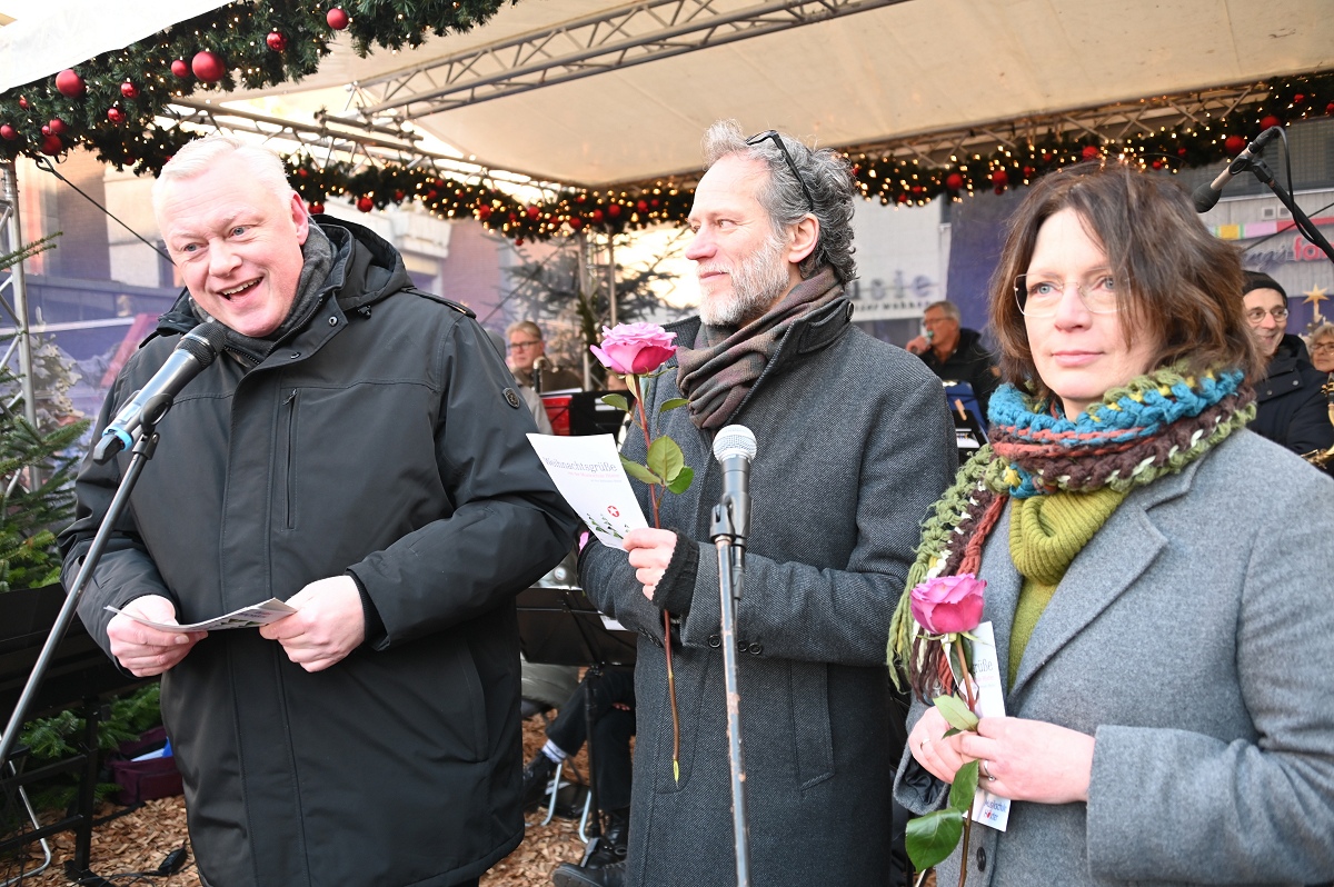 Musikschulleiterin Klaudia Knapp blickte in einer kurzen Ansprache zurück und erinnerte an die Anfänge der Musikschule, die vor wenigen Wochen 65 Jahre alt geworden ist. Ende November 1960 wurde das Jugendmusikwerk laut Claudia Knapp gegründet, der Vorläufer der heutigen Musikschule. Unterstützt wurde das Weihnachtssingen zudem von den Turmbläsern Stefan Balke vom Weserberglandorchester Bödexen und Jonathan Mann von den Hochstiftmusikanten, die vom Balkon über Thalia aus einzelne Musikstücke anstimmten und so für eine besondere Klangatmosphäre sorgten. Bürgermeister Daniel Hartmann wünschte allen Menschen „frohe Festtage“, dankte den Mitwirkenden für ihr Engagement. Er hob den starken Gemeinschaftssinn in Höxter hervor und betonte die Bedeutung des letzten Liedes „Stille Nacht, heilige Nacht“ als Zeichen von Frieden, Hoffnung und Zusammenhalt, ein Lied, das wie kaum ein anderes für Frieden in der Welt steht.