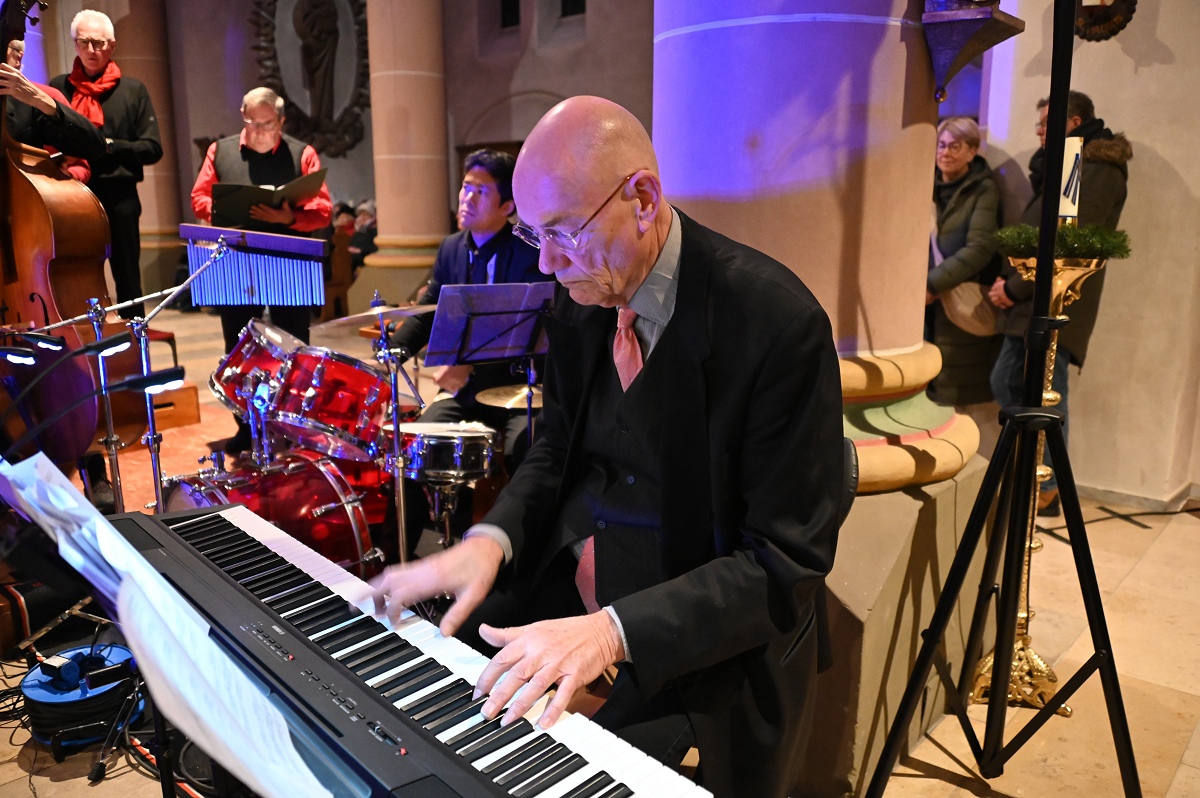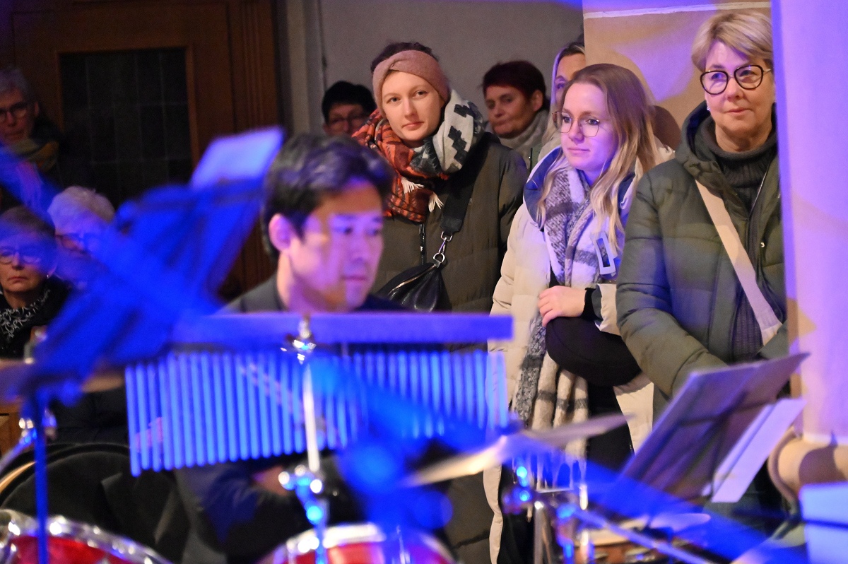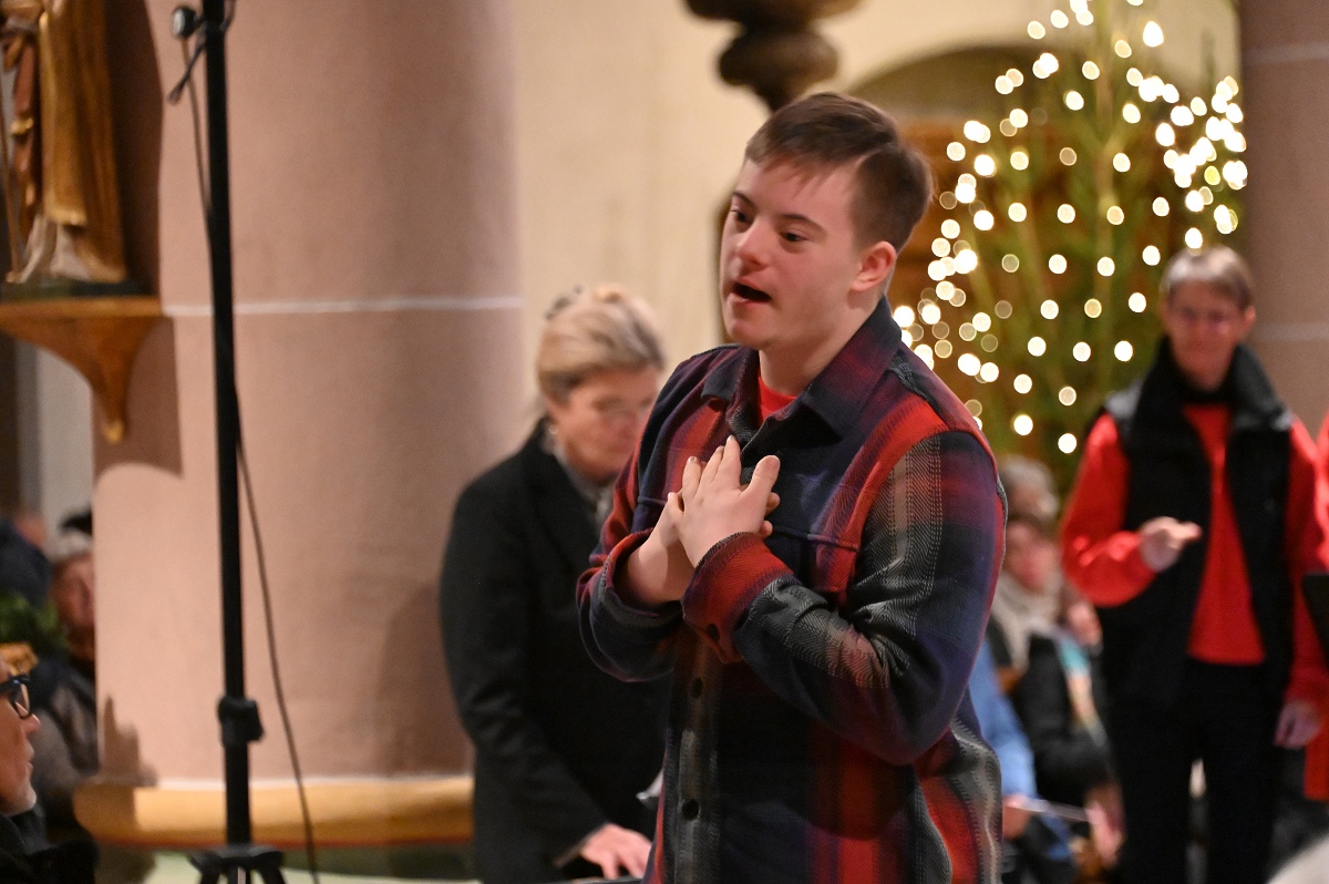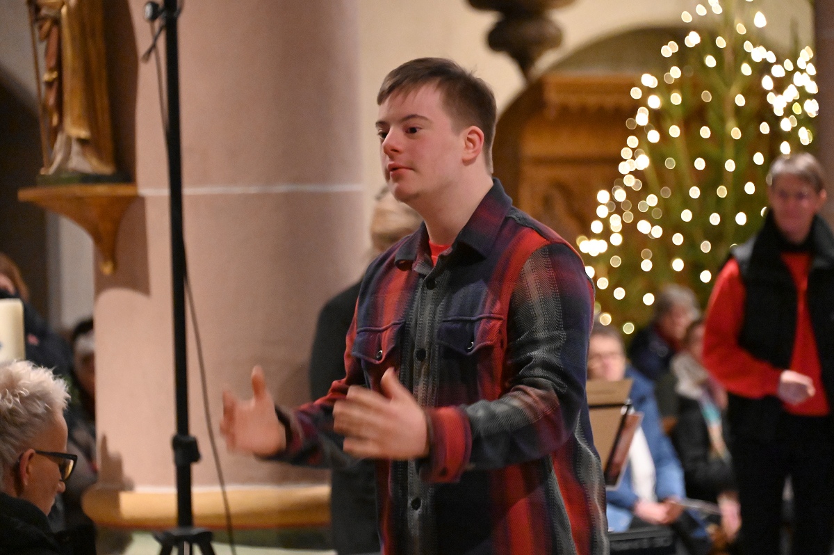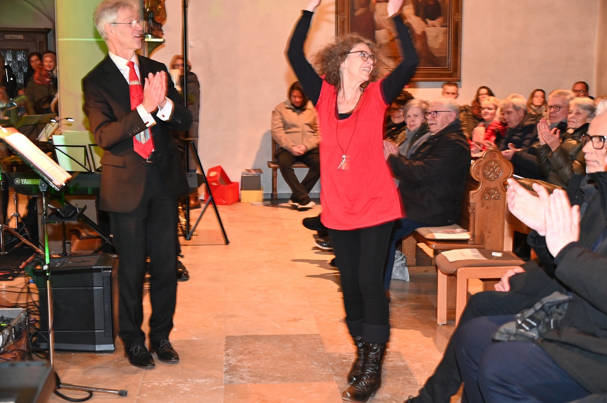 Ein besonderer Höhepunkt des Abends war der tänzerische Auftritt von Anke Schregel, die zum Lied „Lord Of The Dance“ mit ausdrucksstarker Bewegung die Kirche förmlich zum Leben erweckte. Während sie durch die Reihen schritt, wurde sie von den kraftvollen Stimmen des Chors begleitet und sorgte für einen magischen Moment. Für einen weiteren Gänsehautmoment sorgte der 20-jährige Timo Ising. Mit seiner gefühlvollen Interpretation von „Du bist so“ berührte der junge Mann mit Handycap die Herzen der Anwesenden. Seine ausdrucksstarke Stimme und lebhaften Gesten machten diesen Auftritt zu einem emotionalen Höhepunkt des Konzerts und setzten zugleich ein starkes Zeichen für gelebte Inklusion. Musikalisch überzeugten die LIVING VOICES mit einem abwechslungsreichen Repertoire. Neu arrangierte Weihnachtsklassiker wie „Winter Wonderland“, „Santa Claus Is Coming to Town“, „Shepherds Run“ und „Feliz Navidad“ sorgten für vertraute Melodien in frischem Gewand. Passend zum 15-Jährigen erklangen insgesamt auch 15 Titel. Für besondere Klangfarben sorgte erneut die dreiköpfige Band mit dem britischen Keyboarder Peter Moss, Bassist Peter Kros und Percussionist Yukinobu Ishikawa. Die Soloparts wurden von den vereinseigenen Sängerinnen und Sängern Monique Sandmann, Nicole Timmermann, Johanna Potthast, Werner Humann, Heiner Wiemers-Meyer sowie Matthias Kämpfer und Walter Cappell übernommen. Zusätzliche Instrumentalbeiträge, unter anderem von Helena Holletzek an der Blockflöte, rundeten das Klangbild ab. Zum Abschluss des Konzerts erhob sich das Publikum zu stehenden Ovationen und daher gab es auch noch eine Zugabe.