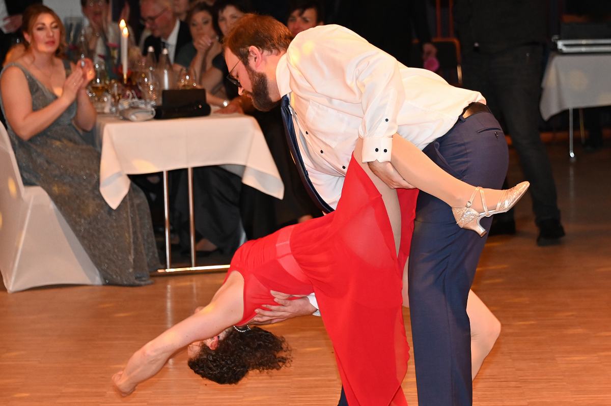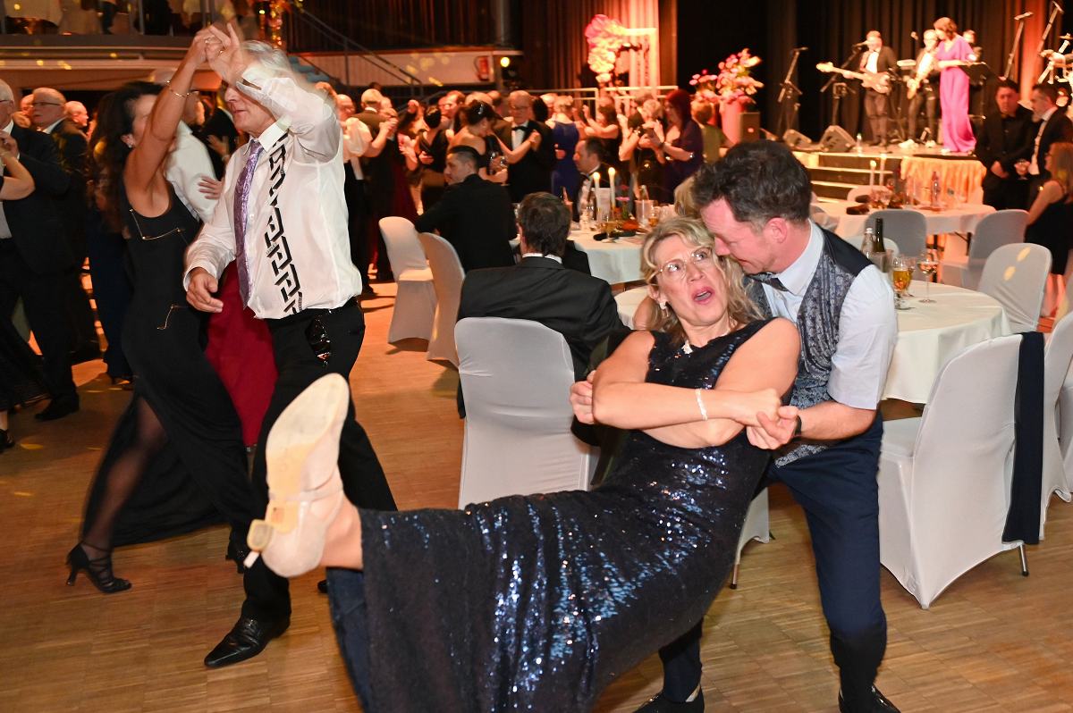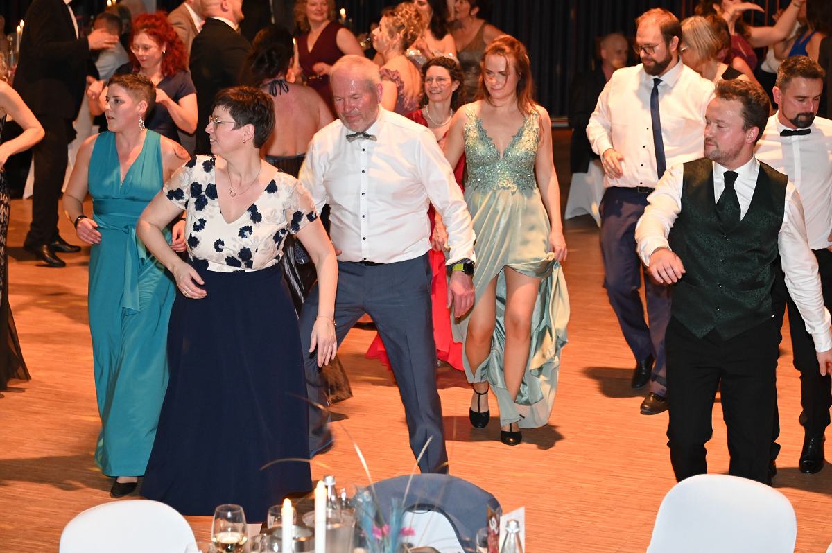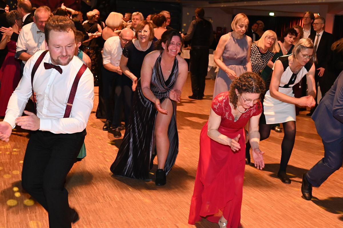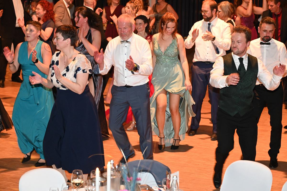 Doch statt Enttäuschung folgte Begeisterung: Ball-Besucher Daniel Hesse von der Tanzschule Hesse aus Heiligenstadt sprang spontan ein und „rettete“ den zweiten Hauptact. Mit einer Line-Dance-Vorführung, Animationen und einem eigenen Tanzpaar brachte Hesse die Stimmung zum Kochen. „Wir haben uns das aus den Fingern gesogen“, sagte er schmunzelnd und traf damit genau den Geschmack des Publikums. Besonders der Auftritt des Tanzpaares Diana und Michael aus Heiligenstadt zum Song „Pretty Woman“ sorgte für großen Applaus. Insgesamt war die Gruppe mit 26 Personen vertreten. Für Daniel Hesse schloss sich dabei ein Kreis: Bereits vor 15 Jahren hatte er in der Stadthalle Beverungen Tanzkurse gegeben. Seine Verbundenheit zum Kulturball sei bis heute geblieben. Für die musikalische Begleitung sorgten Jürgen Becker und seine Amorados Showband. Die achtköpfige Formation überzeugte erneut mit ihrer großen musikalischen Bandbreite und direkter Publikumsnähe. Die Tanzfläche blieb daher durchgehend gut gefüllt, wenn sie vom Walzer bis Disco-Fox mit einer großen Bandbreite an bester Ball-Musik begeisterten.