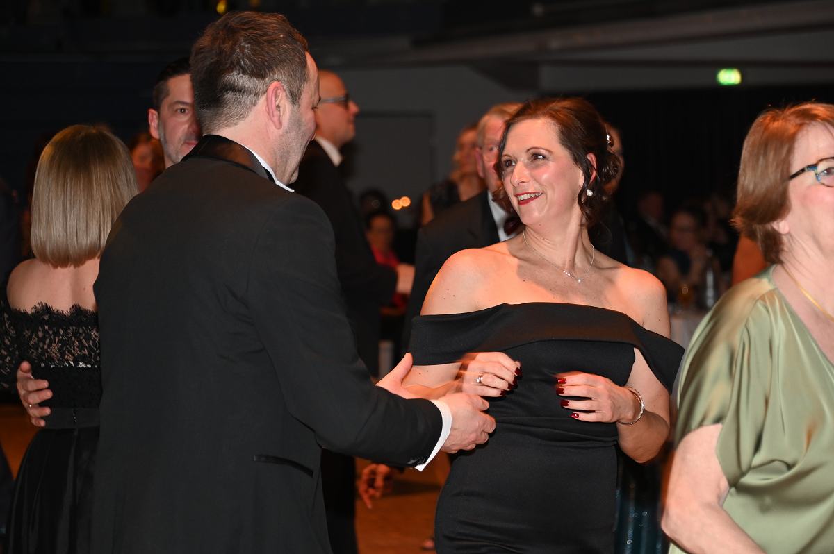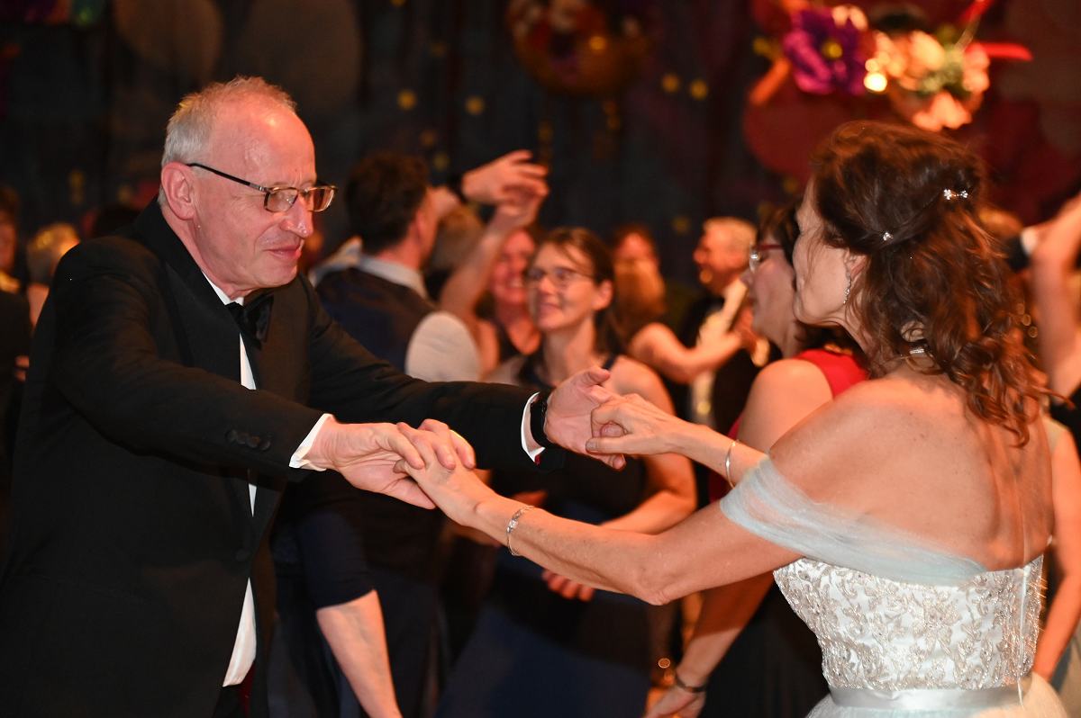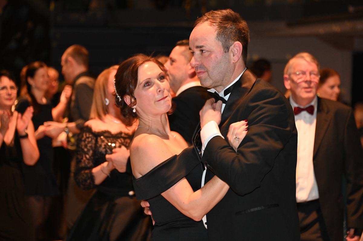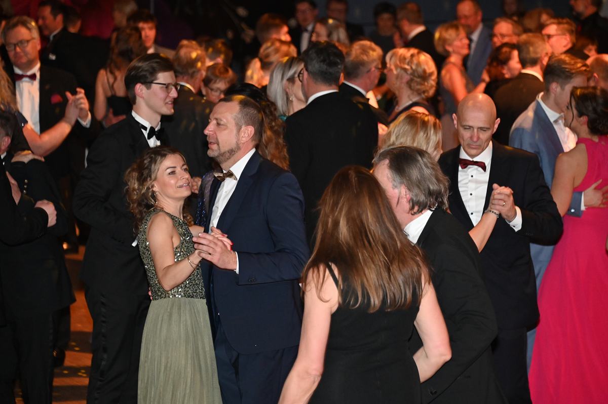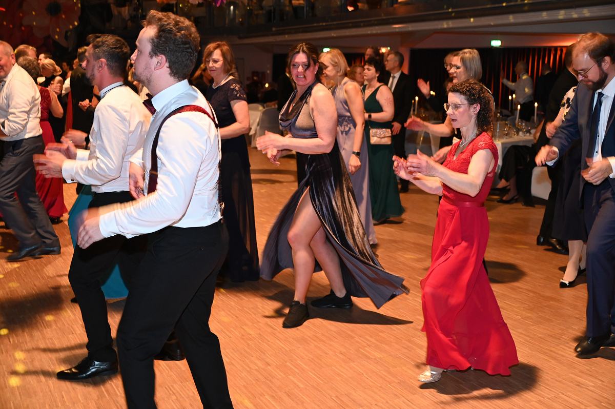 Doch statt Enttäuschung folgte Begeisterung: Ball-Besucher Daniel Hesse von der Tanzschule Hesse aus Heiligenstadt sprang spontan ein und „rettete“ den zweiten Hauptact. Mit einer Line-Dance-Vorführung, Animationen und einem eigenen Tanzpaar brachte Hesse die Stimmung zum Kochen. „Wir haben uns das aus den Fingern gesogen“, sagte er schmunzelnd und traf damit genau den Geschmack des Publikums. Besonders der Auftritt des Tanzpaares Diana und Michael aus Heiligenstadt zum Song „Pretty Woman“ sorgte für großen Applaus. Insgesamt war die Gruppe mit 26 Personen vertreten. Für Daniel Hesse schloss sich dabei ein Kreis: Bereits vor 15 Jahren hatte er in der Stadthalle Beverungen Tanzkurse gegeben. Seine Verbundenheit zum Kulturball sei bis heute geblieben. Für die musikalische Begleitung sorgten Jürgen Becker und seine Amorados Showband. Die achtköpfige Formation überzeugte erneut mit ihrer großen musikalischen Bandbreite und direkter Publikumsnähe. Die Tanzfläche blieb daher durchgehend gut gefüllt, wenn sie vom Walzer bis Disco-Fox mit einer großen Bandbreite an bester Ball-Musik begeisterten.