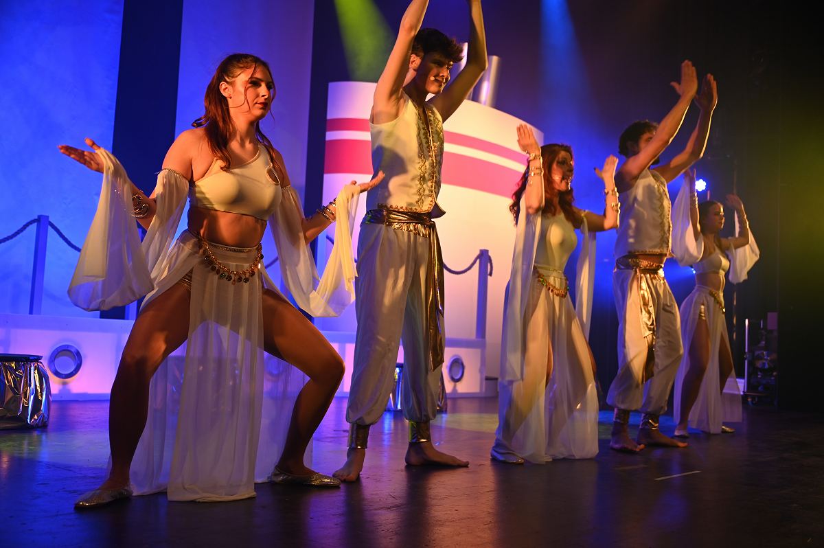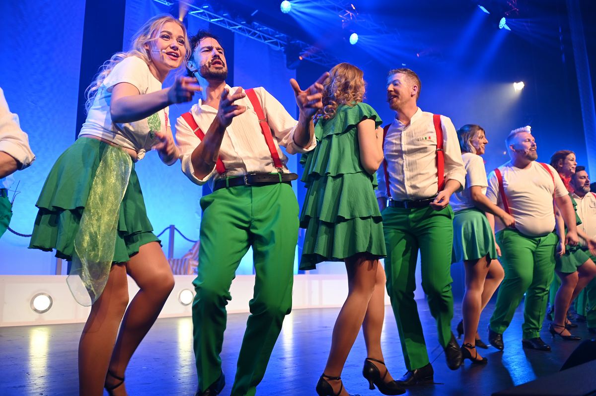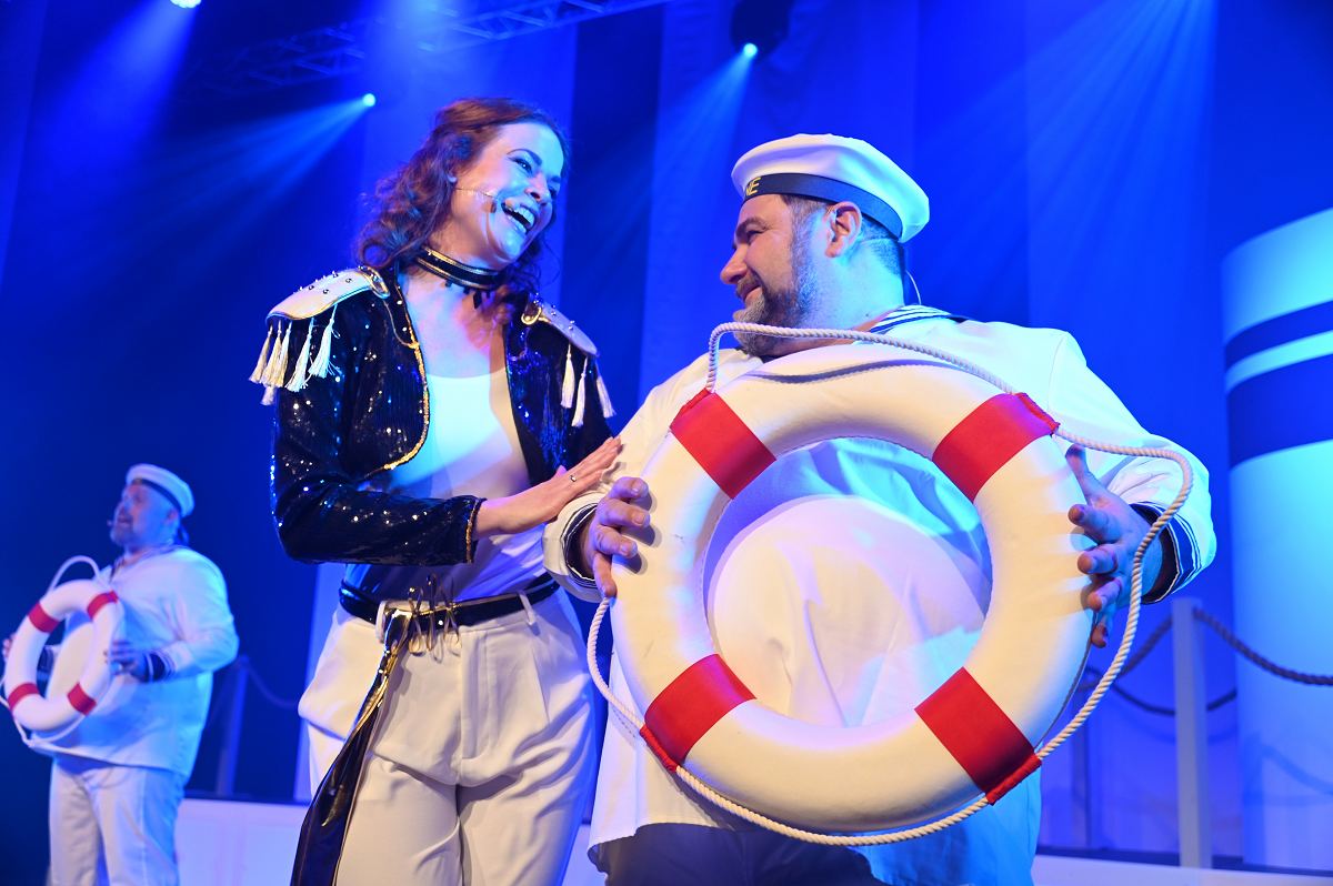 Auf der Bühne überzeugte ein großes Ensemble aus erfahrenen Darstellerinnen und Darstellern sowie neuen Gesichtern. Zu sehen waren Birgit Auel, Thomas Golüke, Sandra Hake, Sebastian Hegener, Pia Hermanns, Martin Klinkemeier, Sergej Rau, Björn Schwarzer, Maria Sievers und Carina Stickel. Frischen Wind brachten zudem Mika Germa, Xenia Heidebrecht, Alina Schmieder und Ida Sonnemann, die gemeinsam mit dem Ensemble glänzten. In zweieinhalb Stunden geht es in der Stadthalle einmal rund um die Welt, möglich gemacht durch das Kreuzfahrtschiff des Schlosstheaters. Nach dem Einchecken führt Kapitän Björn Tegeler das Publikum von Italien über Ägypten und Afrika bis nach Südamerika und New York, bevor es wieder zurück in heimische Gewässer geht. Im Mittelpunkt stehen dabei nicht nur die Reiseziele, sondern auch das Leben an Bord: Szenen in der Barbara Bar, sportliche Einlagen im Fitnessstudio („Bauch, Beine, Po“), Zauberkunst und humorvolle Begegnungen mit skurrilen Bojen und Leuchttürmen sorgen immer wieder für Schmunzeln und Lacher.