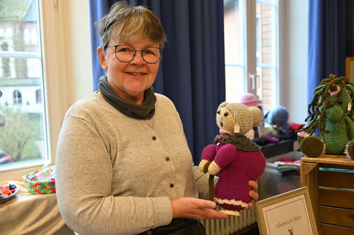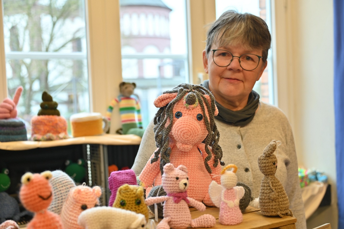 Auch textile Arbeiten waren stark vertreten. Angeboten wurden unter anderem Taschen aus Jeansstoff, Beutel, Rucksäcke und Leseknochen. Hinzu kamen genähte, gestrickte und gehäkelte Stücke für Kinder und Erwachsene, darunter Baby- und Puppenkleidung, Jacken und Pullover. An mehreren Ständen wurde außerdem Schmuck verkauft, ergänzt durch Schmuckkarten und feine Handarbeiten. Blickfänger waren ebenso Bilder in Aquarell-, Acryl-, Seiden- und Steintechnik, die von vielen Besuchern aufmerksam betrachtet wurden. Wie viel Arbeit hinter den Stücken steckt, zeigte sich im Gespräch mit den Ausstellerinnen. Ingrid Ferk aus Höxter strickt Pullover in verschiedenen Farben und Formen. Bis zu vier Tage arbeitet sie an einem einzelnen Stück. Schon das Material schlägt mit rund 50 Euro zu Buche. Reich wird man damit nicht, machte sie deutlich. Für sie steht ohnehin etwas anderes im Vordergrund: Sie strickt, weil es ihr Freude macht. Mit fantasievollen Häkelarbeiten war Elke Besse aus Boffzen vertreten. Seit rund zehn Jahren fertigt sie Tiere, Menschen und Fabelwesen mit ganz eigenem Ausdruck. Je nach Größe sitzt sie bis zu zwei Tage an einer Figur. Für Aufsehen sorgte eine ihrer Arbeiten besonders: Im Auftrag entstand eine Trump-Figur, die Silvia Beth aus Höxter später zur Voodoo-Puppe machte. Beth war selbst mit einem Stand auf dem Markt vertreten und zeigte damit, dass kreative Ideen hier auch mal augenzwinkernd und politisch unkorrekt daherkommen dürfen.