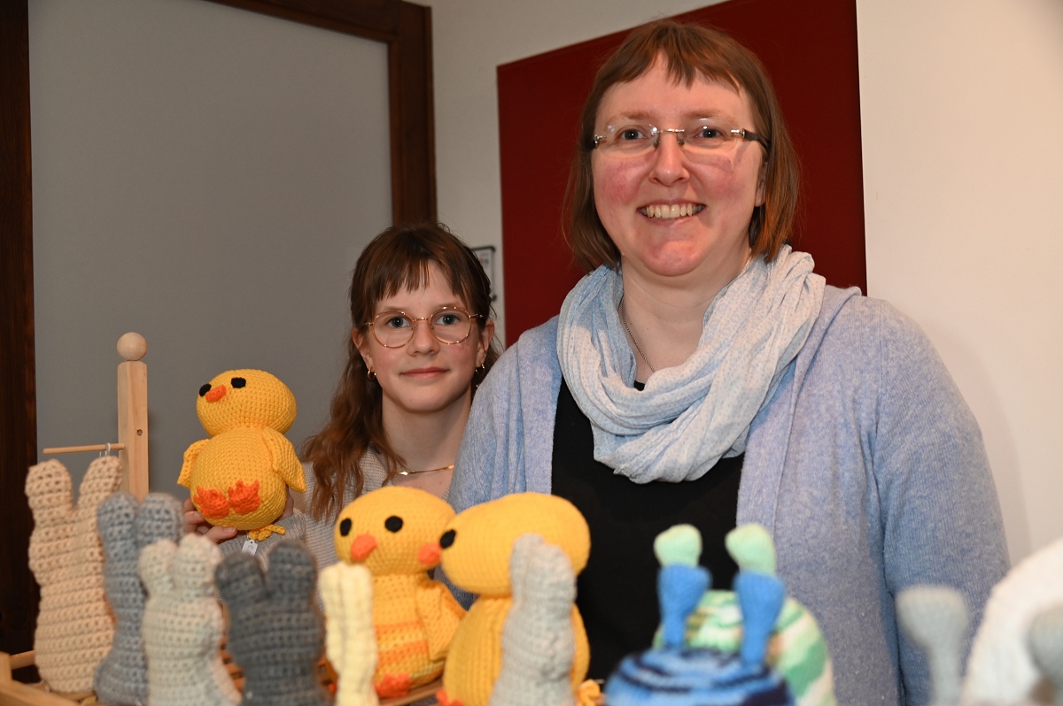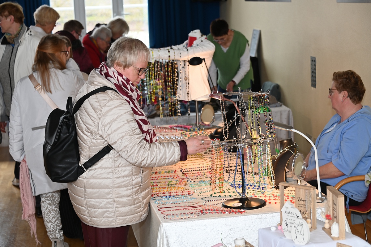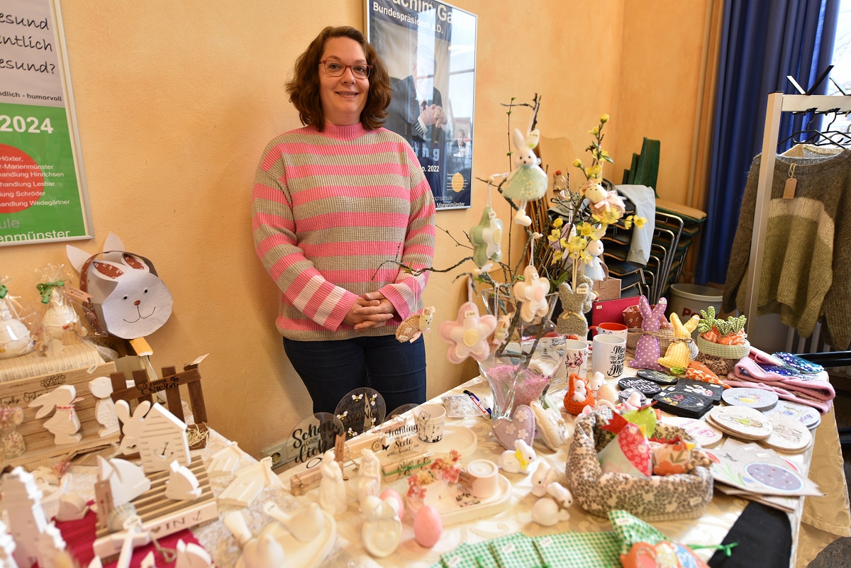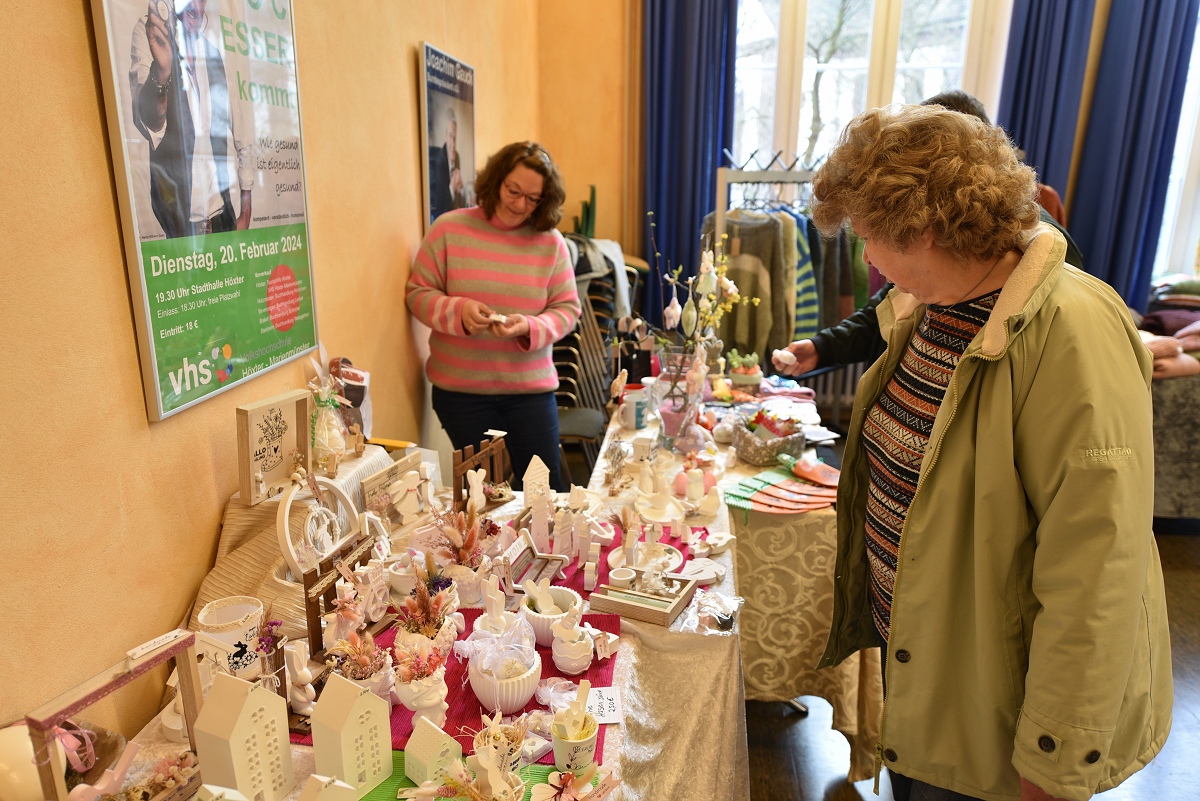 Höxter (TKu). Zwischen Osterkränzen, Schmuck und handgestrickten Pullovern wurde wieder viel Kreatives angeboten beim diesjährigen Höxteraner Kreativmarkt in der Volkshochschule am vergangenen Sonntag. Genau dieser Kontrast machte den Reiz der Veranstaltung aus: klassisches Kunsthandwerk, originelle Ideen und viele persönliche Geschichten trafen am Sonntag auf fünf Ebenen der VHS aufeinander. Im Rahmen der Frauenaktionswochen hatte das Team „HÖXTI AKTIV“ erneut in die Räume an der Möllinger Straße eingeladen. 43 Ausstellerinnen und Aussteller präsentierten dort ihre Arbeiten. Viel Platz blieb nicht mehr. „Mehr Anbieter finden hier auch keinen Platz“, sagte Organisatorin Marianne Heinemeyer. Tatsächlich war das Gebäude vom Souterrain bis hinauf zum Dachboden komplett belegt. Gemeinsam mit ihrem Team stellte sie den Markt in gewohnter Größe wieder auf die Beine und zeigte sich dankbar für die Unterstützung, die die Durchführung erneut möglich machte. Wer durch die Flure und Räume schlenderte, bekam schnell einen Eindruck davon, wie breit das Angebot gefächert war. Im Mittelpunkt standen viele handgemachte Einzelstücke, die mit Geduld, Erfahrung und viel Liebe zum Detail entstanden waren. Passend zur Jahreszeit dominierten Frühlings- und Osterartikel viele Tische: Kränze, Gestecke und aufwendig gestaltete Ostereier in ganz unterschiedlichen Formen und Materialien sorgten für farbige Akzente. Daneben fanden sich Seifen, Kerzen und Dekorationen für Haus und Garten.