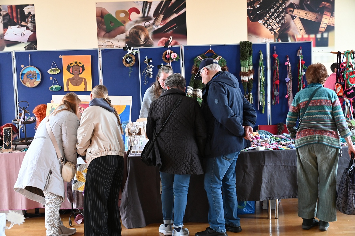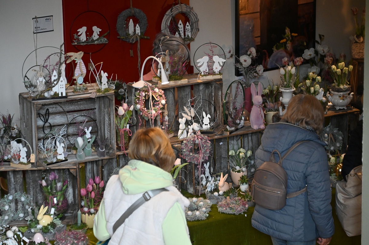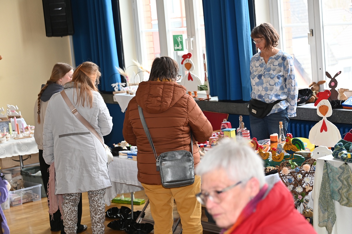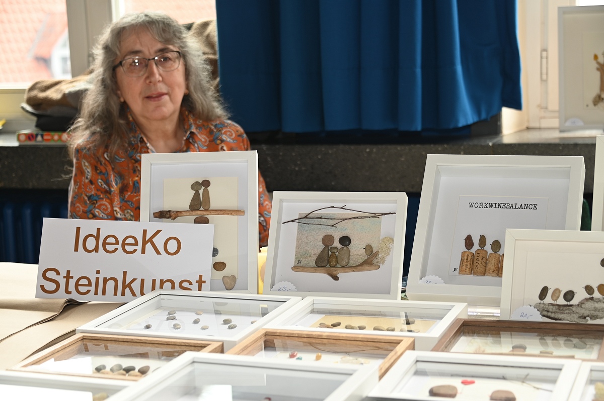 Höxter (TKu). Zwischen Osterkränzen, Schmuck und handgestrickten Pullovern wurde wieder viel Kreatives angeboten beim diesjährigen Höxteraner Kreativmarkt in der Volkshochschule am vergangenen Sonntag. Genau dieser Kontrast machte den Reiz der Veranstaltung aus: klassisches Kunsthandwerk, originelle Ideen und viele persönliche Geschichten trafen am Sonntag auf fünf Ebenen der VHS aufeinander. Im Rahmen der Frauenaktionswochen hatte das Team „HÖXTI AKTIV“ erneut in die Räume an der Möllinger Straße eingeladen. 43 Ausstellerinnen und Aussteller präsentierten dort ihre Arbeiten. Viel Platz blieb nicht mehr. „Mehr Anbieter finden hier auch keinen Platz“, sagte Organisatorin Marianne Heinemeyer. Tatsächlich war das Gebäude vom Souterrain bis hinauf zum Dachboden komplett belegt. Gemeinsam mit ihrem Team stellte sie den Markt in gewohnter Größe wieder auf die Beine und zeigte sich dankbar für die Unterstützung, die die Durchführung erneut möglich machte. Wer durch die Flure und Räume schlenderte, bekam schnell einen Eindruck davon, wie breit das Angebot gefächert war. Im Mittelpunkt standen viele handgemachte Einzelstücke, die mit Geduld, Erfahrung und viel Liebe zum Detail entstanden waren. Passend zur Jahreszeit dominierten Frühlings- und Osterartikel viele Tische: Kränze, Gestecke und aufwendig gestaltete Ostereier in ganz unterschiedlichen Formen und Materialien sorgten für farbige Akzente. Daneben fanden sich Seifen, Kerzen und Dekorationen für Haus und Garten.