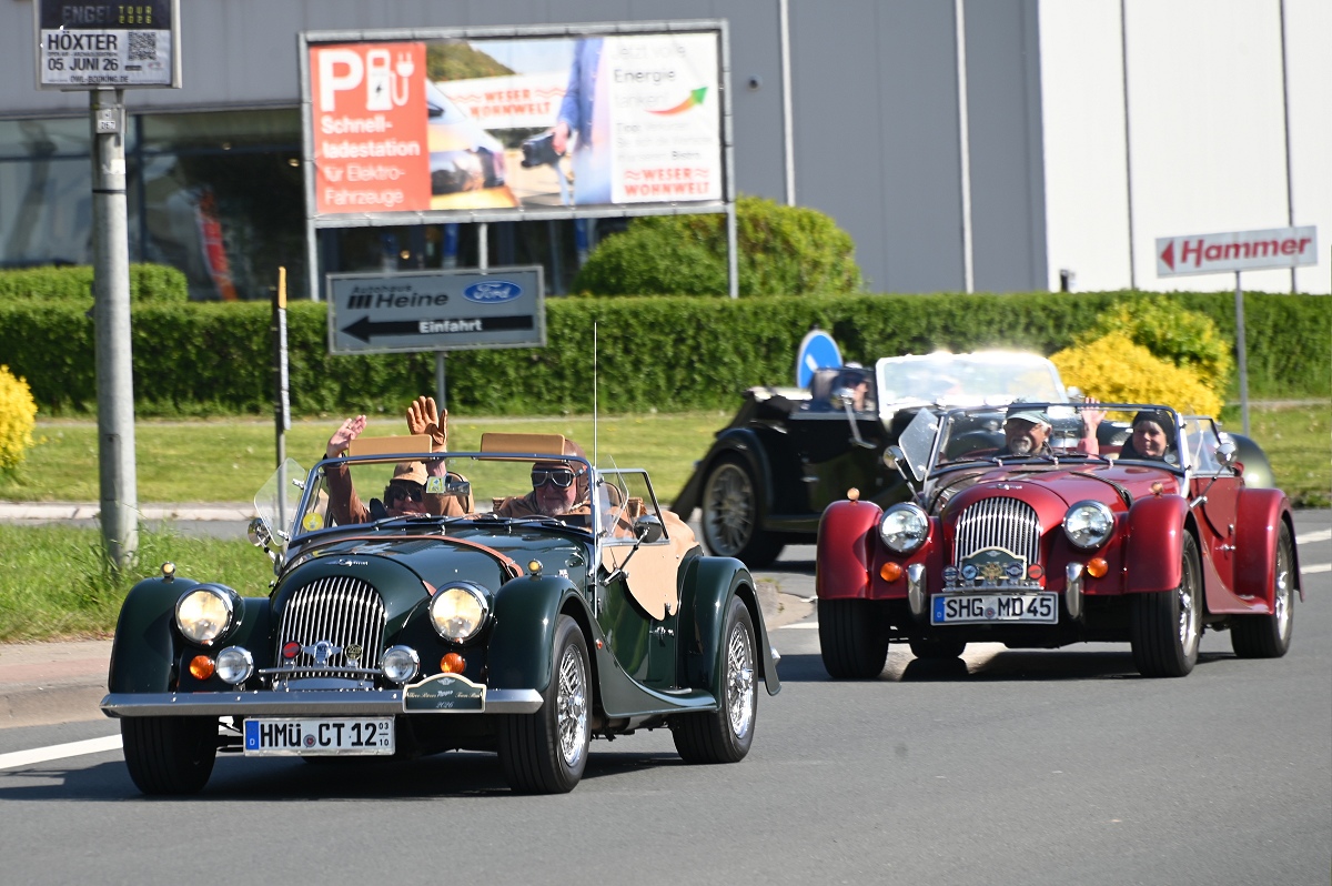 Höxter (TKu). Eine ungewöhnliche Fahrzeugkolonne hat sich am Samstagvormittag bei strahlendem Sonnenschein von Höxter aus durch das Weserbergland in Bewegung gesetzt: 14 handgefertigte Sportwagen der britischen Marke Morgan starteten vom Parkplatz eines Burger-Restaurants zu einer zweitägigen Tour durch die Region.