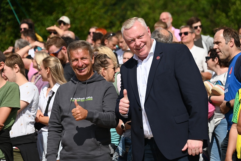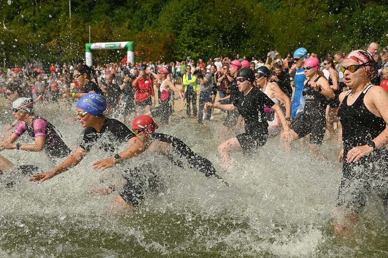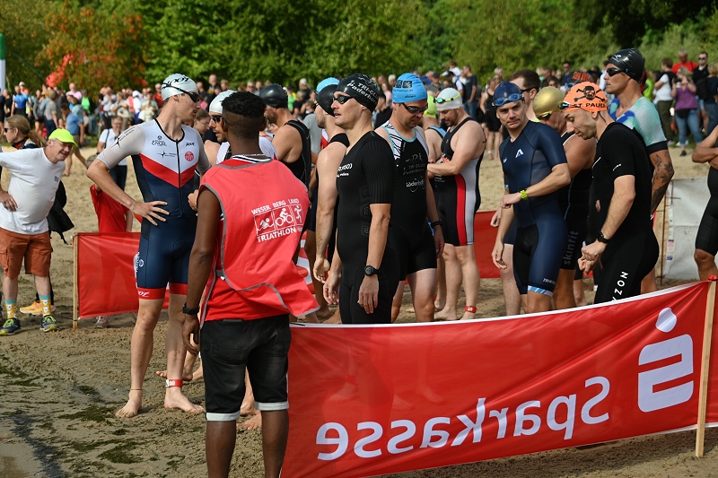 Höxter (TKu). Am vergangenen Sonntag zog der Weserbergland-Triathlon in Höxter-Godelheim erneut zahlreiche Sportbegeisterte in seinen Bann. Rund um die idyllische Freizeitanlage fand die fünfte Auflage dieses sportlichen Großereignisses statt, organisiert vom Kreissportbund Höxter, moderiert von Markus Finger und mit Unterstützung des Kreises sowie der Stadt Höxter. Einen Teilnehmerrekord wie in dem Jahr 2019, der aufgrund des damals kurzfristig abgesagten Köln-Marathons aufgestellt wurde, gab es in diesem Jahr nicht. Dafür erreichte die Veranstaltung eine respektable Anzahl von über 200 Einzelstartern und 35 Staffeln, die in Höxter an den Start gingen. Das Event, das sowohl erfahrene Athleten als auch Triathlon-Neulinge ansprach, fand bei idealen Wetterbedingungen statt. Bei angenehmen Temperaturen und nahezu windstillem Wetter bot der Tag perfekte Voraussetzungen für alle Beteiligten. Insgesamt 90 Helferinnen und Helfer aus verschiedenen Vereinen und vom Veranstalter sorgten für einen reibungslosen Ablauf, darunter auch viele Helfer der Deutschen-Lebens-Rettungs-Gesellschaft aus den Kreisen Höxter und Paderborn, die für die Sicherheit der Teilnehmenden am und im Wasser präsent waren. Der Startschuss für das erste Teilnehmerfeld fiel pünktlich um 11 Uhr durch Landrat Michael Stickeln. Kurz darauf eröffnete Bürgermeister Daniel Hartmann das Rennen für die zweite Gruppe, die reine Damengruppe. Insgesamt fünf Startgruppen, darunter drei Herrengruppen, eine Damengruppe und eine gemischte Staffelgruppe, gingen ins Rennen.
