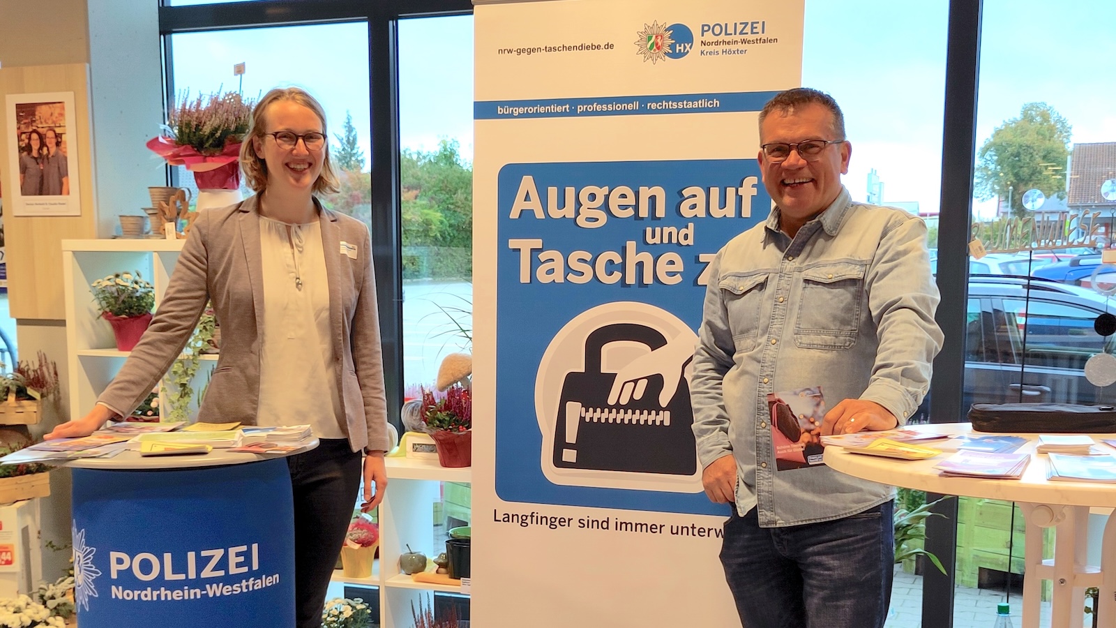 Unter dem Motto "Augen auf und Tasche zu" bietet die Kreispolizeibehörde Höxter in dieser Woche verschiedene Beratungen an und gibt Tipps, wie man sich vor Dieben und Betrügern schützen kann. Die Präventionsberater der Polizei, Annemarie Berghoff und Albert Ecke, stehen zum Beispiel am Donnerstag, 9. Oktober, im Laufe des Vormittags an einem Infostand im Kaufland-Einkaufsmarkt an der Brenkhäuser Straße in Höxter für persönliche Gespräche zur Verfügung.