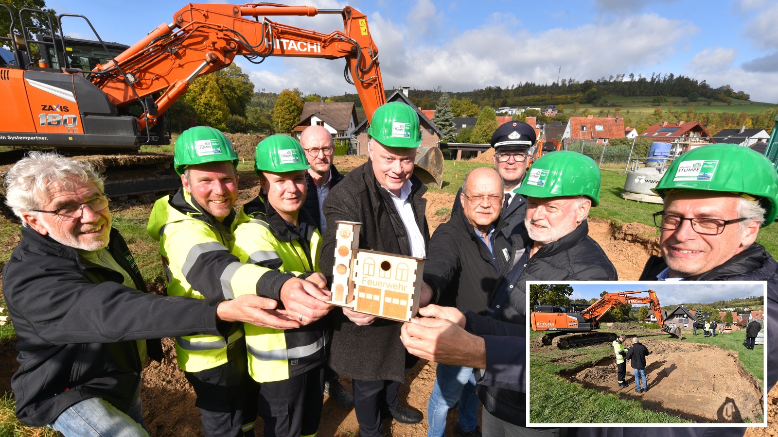 Höxter-Lütmarsen (TKu). Nach langer Planungsphase und intensiven Abstimmungen ist es endlich soweit: In Lütmarsen rollen die Bagger. Der offizielle Spatenstich für den Neubau des Feuerwehrgerätehauses markiert nicht nur den Beginn eines wichtigen Infrastrukturprojekts, sondern auch einen symbolischen Neuanfang für den Ort, der im Mai 2022 von einem verheerenden Tornado schwer getroffen wurde. Mit diesem Projekt werde ein wichtiger Schritt zur Stärkung der örtlichen Gefahrenabwehr und zur Modernisierung der Infrastruktur vor Ort getan, betonten Bürgermeister Daniel Hartmann und Dezernatsleiter Stefan Fellmann unisono. Der Neubau des Feuerwehrgerätehauses war nach der Tornado-Katastrophe im Mai 2022 auch dringend notwendig geworden. Damals hatte der Tornado große Teile von Lütmarsen und Ovenhausen verwüstet. Das bisherige Feuerwehrgerätehaus, das mit dem angrenzenden Sportheim gemeinsam genutzt wurde, war durch massive Dachschäden so stark in Mitleidenschaft gezogen worden, dass das Gebäude Anfang dieses Jahres abgerissen werden musste mit Ausnahme der alten Feuerwehrgarage, die auch zukünftig erhalten bleibt. Darin ist aktuell noch das Feuerwehrfahrzeug der Löschgruppe untergebracht, bis der Neubau gegenüber dem Friedhof zwischen Grabtal und Feldstraße fertiggestellt ist.