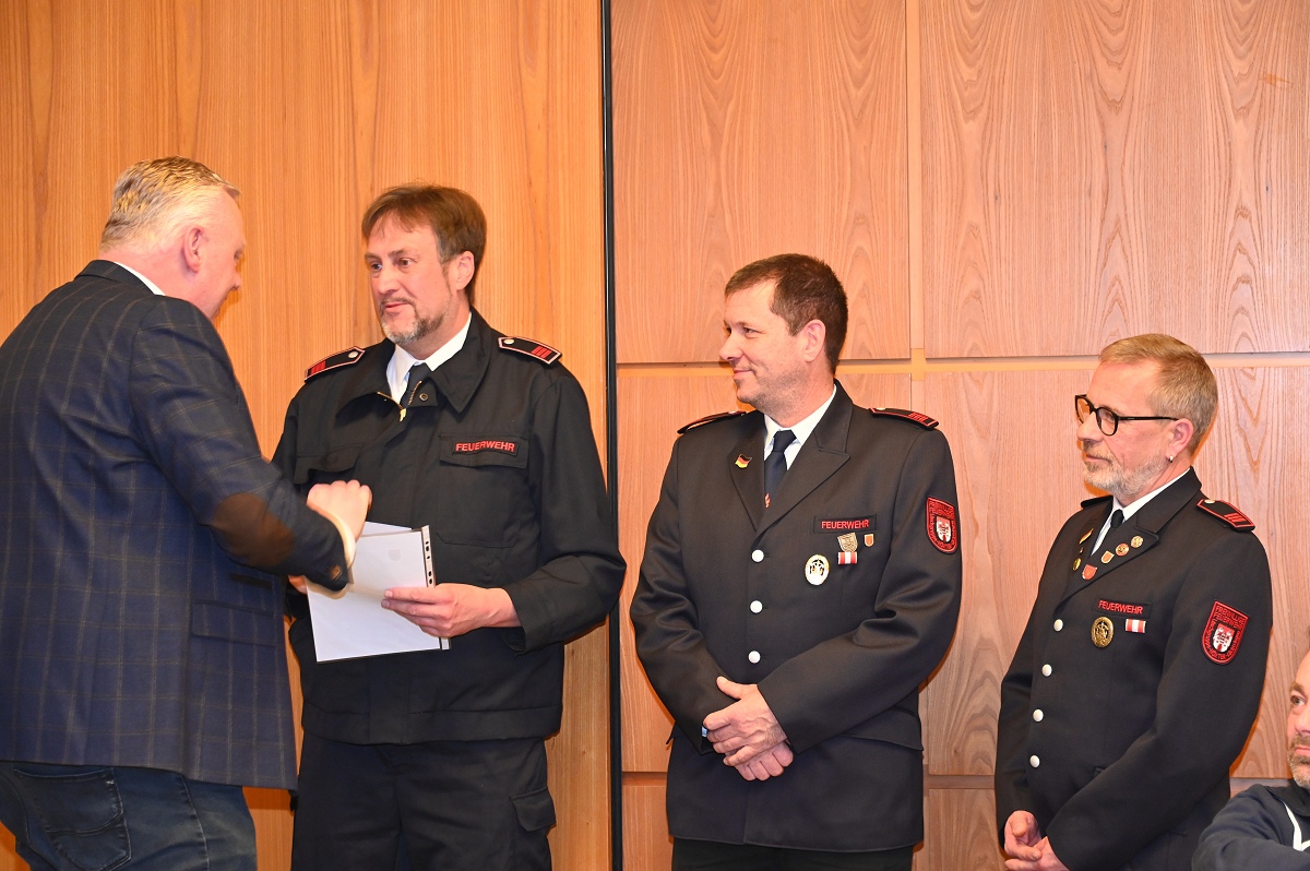 Eine besondere Ehrung wurde Hauptfeuerwehrmann Ludger Heine zuteil. Für seine 40-jährige aktive Mitgliedschaft in der Freiwilligen Feuerwehr verlieh Stadtbrandinspektor Jürgen Schmits ihm eine Urkunde sowie das Sonderabzeichen des Landesfeuerwehrverbandes. Sowohl der Leiter der Feuerwehr als auch Bürgermeister Daniel Hartmann dankten ihm für seinen jahrzehntelangen Einsatz. Aus gesundheitlichen Gründen trat Ludger Heine aus der ersten Reihe der aktiven Feuerwehrleute zurück und wurde in die Ehrenabteilung versetzt. Unter großem Applaus der Mannschaft verabschiedete ihn Jürgen Schmits mit einer Urkunde. Für ihre zehnjährige aktive Mitgliedschaft wurden Unterbrandmeister Timo Heine und Fabian Rosner in Abwesenheit sowie Hauptfeuerwehrmann Julian Jöhren und Unterbrandmeister Maximilien Meise ausgezeichnet. Urkunden für 20 Jahre aktive Mitgliedschaft überreichte Löschgruppenführer Andreas Bohnenpoll an Rudolf Lützer, Patrick Haller und Lukas Heine.