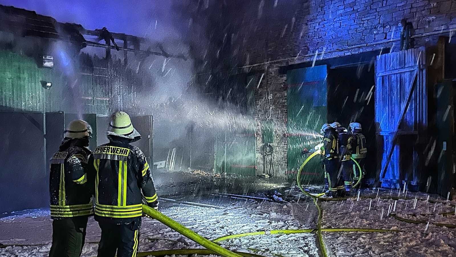 Riesel (red). Ein Brand auf einem landwirtschaftlichen Hof im Brakeler Ortsteil Riesel hat am frühen Montagmorgen einen größeren Feuerwehreinsatz ausgelöst. Gegen 6.25 Uhr wurden die Einsatzkräfte alarmiert, nachdem ein Unterstand an einer Scheune an der Straße „In der Bohle“ aus bislang ungeklärter Ursache in Brand geraten war. Das Feuer drohte auf die angrenzende Scheune überzugreifen. Umgehend rückten Feuerwehreinheiten aus Riesel, Istrup, Schmechten, Rheder und Brakel zur Einsatzstelle aus. Trotz der widrigen Witterungsverhältnisse mit starkem Schneefall erreichten die Einsatzkräfte zügig den Hof. Der Schneefall erschwerte sowohl die Anfahrt als auch die Löscharbeiten vor Ort erheblich.