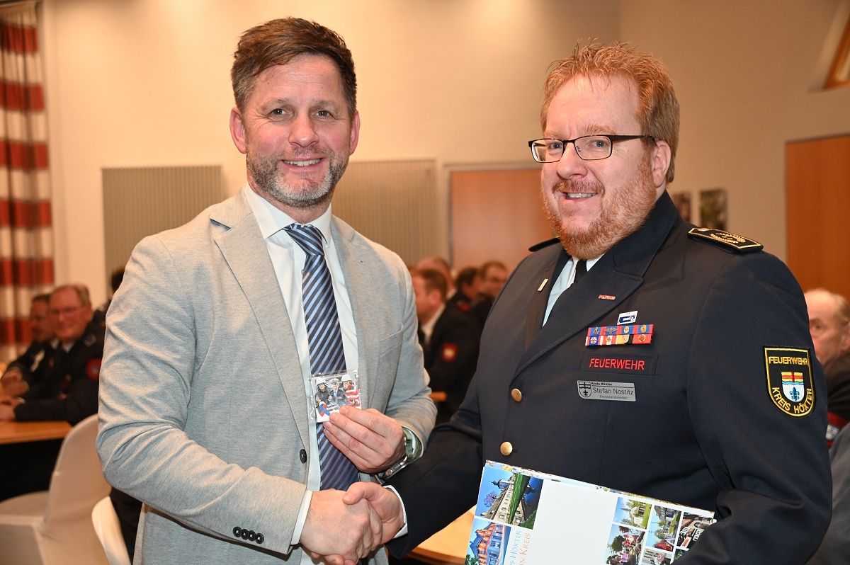 Auch Kreisbrandmeister Stefan Nostiz, selbst Mitglied der Feuerwehr Beverungen, griff die veränderten Gefahrenlagen auf. In seinem Bericht verwies er auf den Einsatz mit besonderer Bedrohungslage „In den Pölten“ in Beverungen vom vergangenen Samstag, bei dem Einsatzkräfte im Innenangriff plötzlich mit einer Waffe bedroht wurden. Mit solchen Situationen rechne niemand, dennoch seien sie inzwischen auch in Beverungen zur Realität geworden. Als Zeichen der Solidarität mit den Einsatzkräften überreichte Nostiz dem Bürgermeister die Einsatzschleife „NRW zeigt Respekt“.