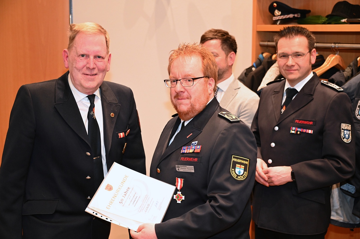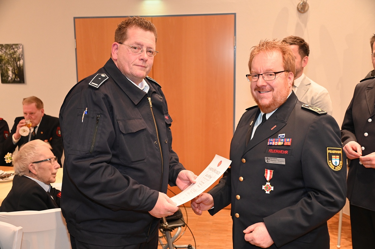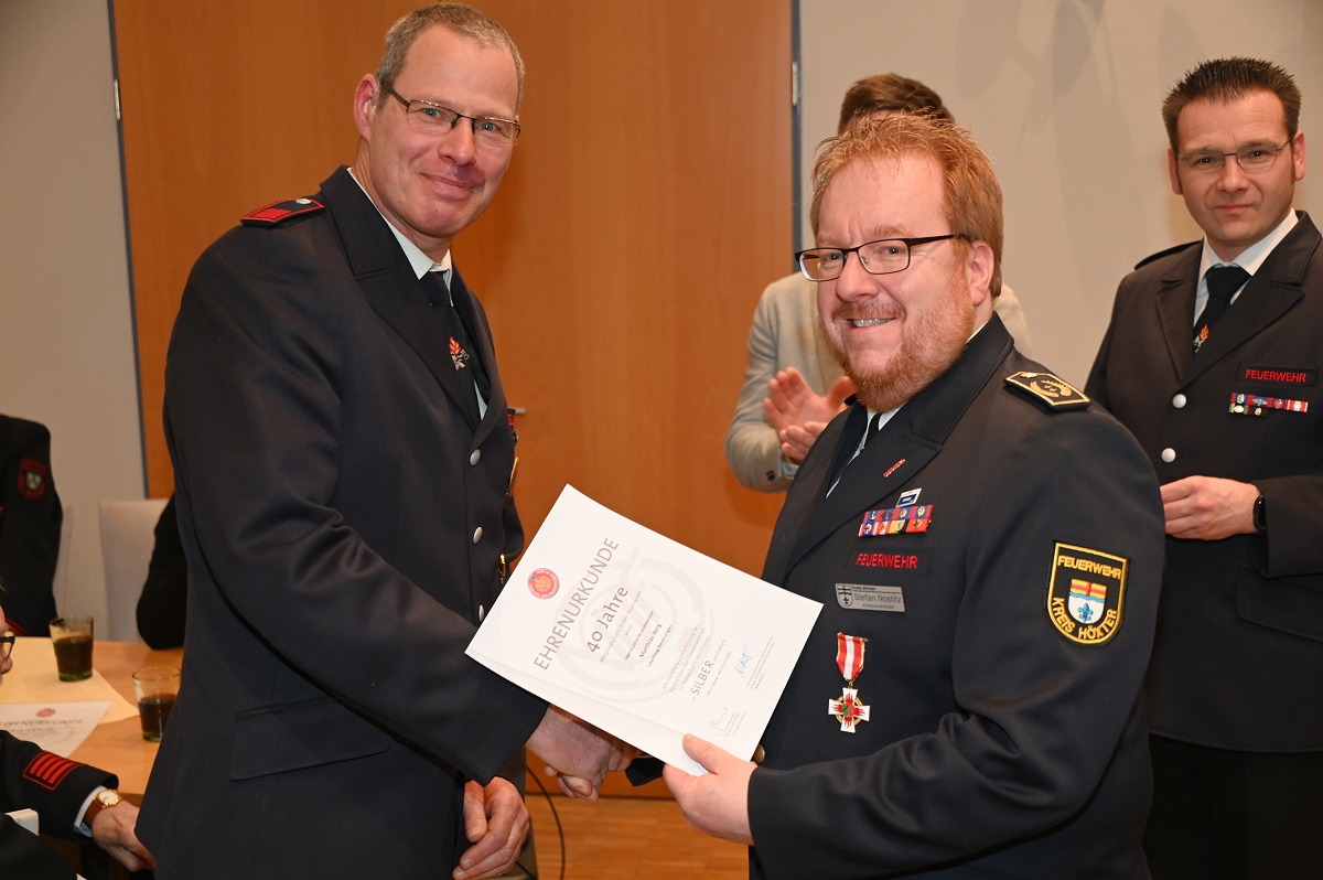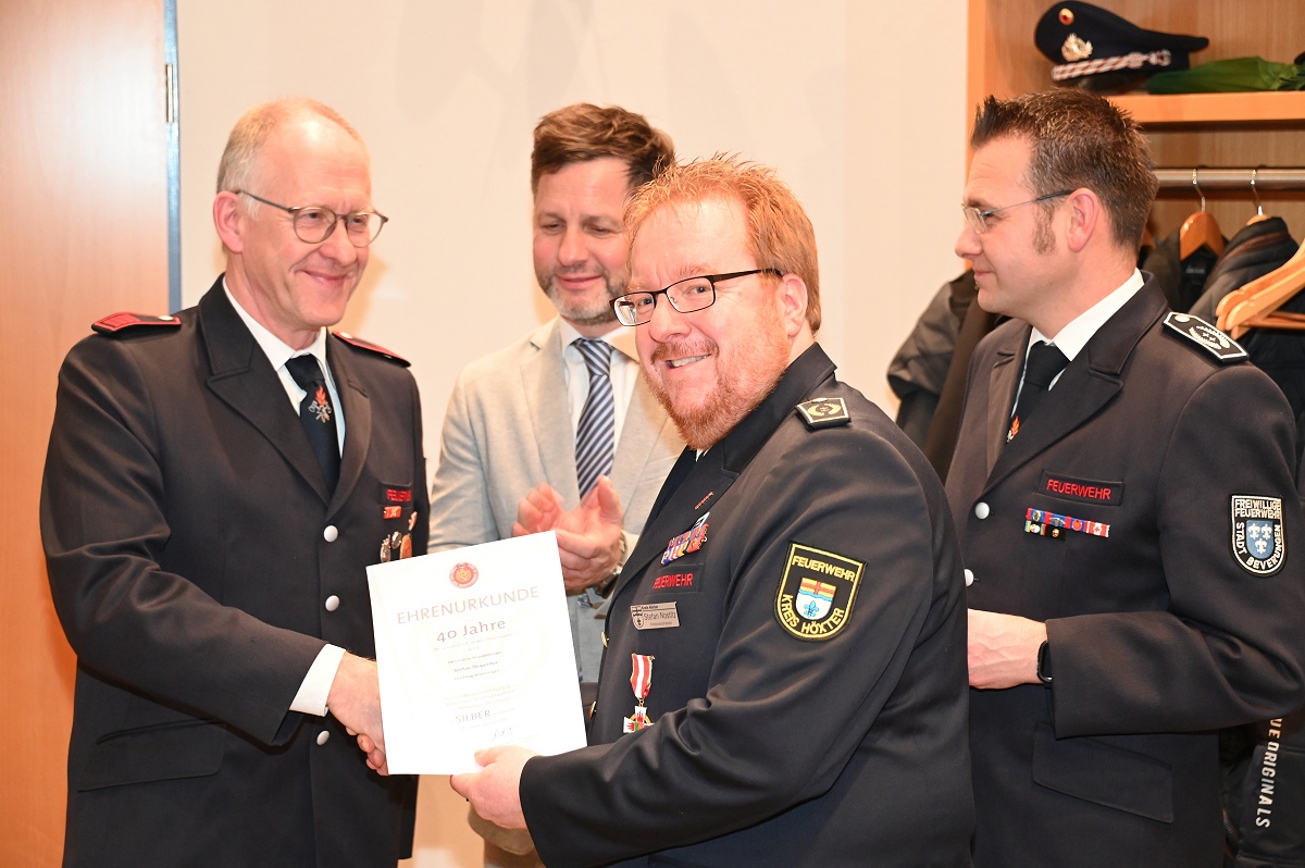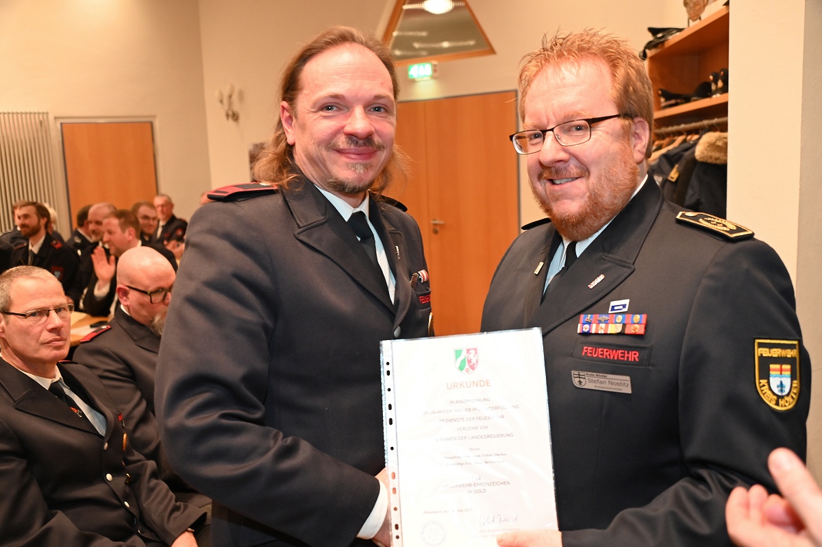 Das Feuerwehr-Ehrenzeichen des Landes in Gold für 35 Jahre aktiven Dienst ging an Stephan Sievers, Martin Beine, Klaus Even, Christoph Dierkes, Thomas Kröger, Tobias Dierkes, Markus Dierkes, Daniel Ernst, Kreisbrandmeister Stefan Nostiz, Andreas Nostitz und Ulrich Kieneke. Darüber hinaus wurden zahlreiche Sonderabzeichen des Verbandes der Feuerwehren NRW verliehen. Das Sonderabzeichen für 40 Jahre Feuerwehrmitgliedschaft in Silber erhielten Matthias Berg, Marc Schrick, Stefan Dewender, Arnold Dunschen und Franz Lavarino. Das Sonderabzeichen in Gold für 50 Jahre Mitgliedschaft verlieh Kreisbrandmeister Nostiz an Rudolf Berg, Günter Konzek, Ludwig Kuhn und Manfred Schade sowie für 60- bzw. 70-jährige Mitgliedschaft an Hans Lorenz Vössing und Josef Vössing.