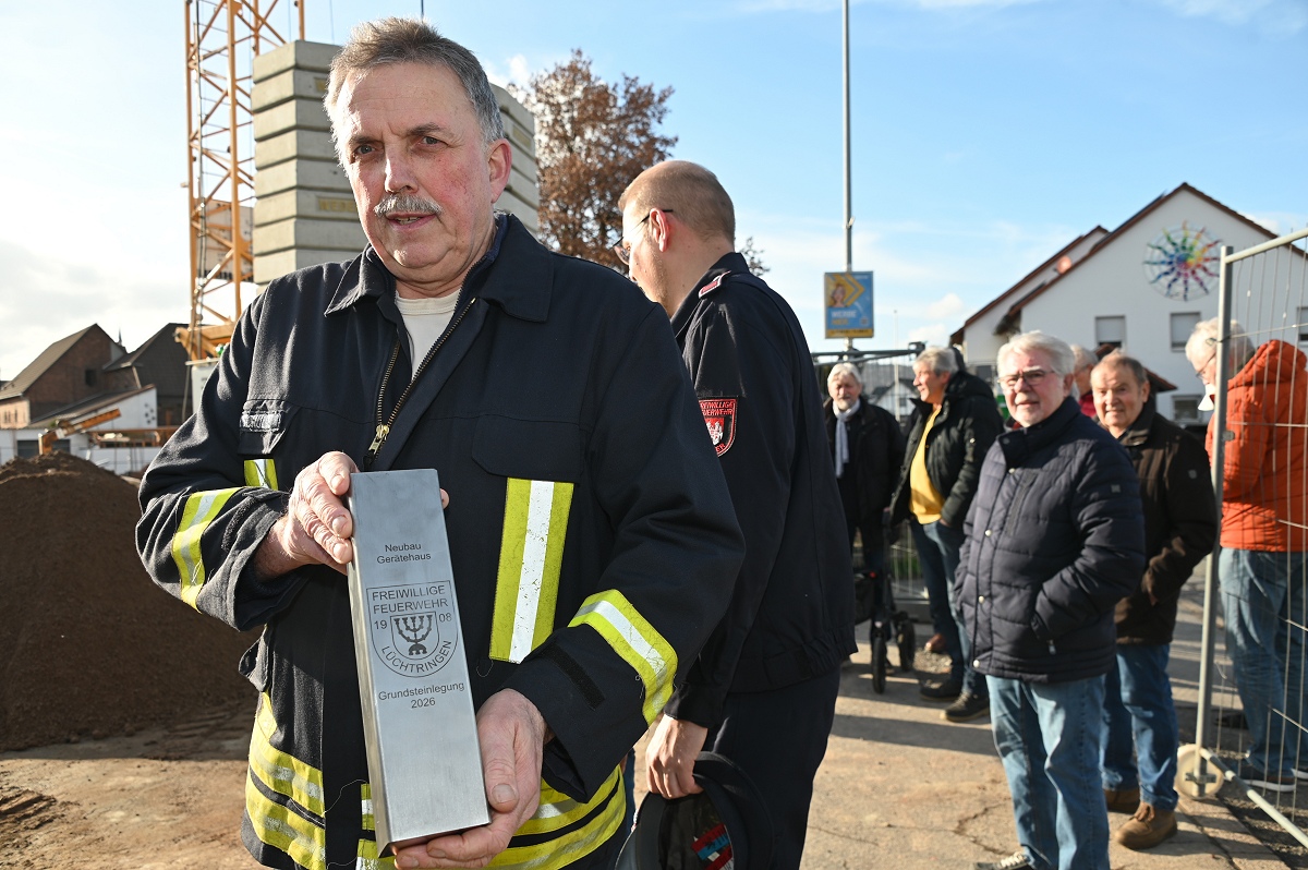 Architekt Schmidt verwies auf die durchdachte Planung des Neubaus: „Das Gebäude ist funktional gegliedert, bietet kurze Wege und schafft sichere sowie zeitgemäße Arbeitsbedingungen für die Einsatzkräfte.“ Der Neubau wird in Massivbauweise mit Flachdach errichtet. Mit der Ausführung der Bauarbeiten ist die Firma Nolte Hochbau beauftragt. Ein besonderer Schwerpunkt liegt auf Nachhaltigkeit und Energieeffizienz: Die Beheizung erfolgt über eine Wärmepumpe, sämtliche Räume werden mit Fußbodenheizung ausgestattet, während in der Fahrzeughalle die Bodenplatte thermisch aktiviert wird. Zusätzlich ist auf dem Flachdach eine Photovoltaikanlage vorgesehen. Insgesamt verfügt das Gebäude über eine Nutzfläche von rund 565 Quadratmetern bei einem Bruttorauminhalt von etwa 2.780 Kubikmetern. Der Alarmzugang erfolgt über den Plattenweg, an dem auch die Alarmparkplätze angeordnet sind. Der öffentliche Eingang sowie die Feuerwehrausfahrt orientieren sich zur Allenbergstraße und sorgen für klare und sichere Abläufe im Einsatzfall. Wehrführer Jürgen Schmits machte deutlich, wie notwendig der Neubau ist: „Das bisherige Gerätehaus aus dem Jahr 1964 entsprach nicht mehr den heutigen Anforderungen. Der Neubau ist ein wichtiger Schritt, um Einsatzbereitschaft, Ausbildung und Arbeitsschutz dauerhaft sicherzustellen.“ Auch Löschgruppenführer Bohnenpoll sieht der Zukunft positiv entgegen: „Mit den neuen Räumlichkeiten schaffen wir beste Voraussetzungen für eine leistungsfähige Feuerwehr und zeitgemäße Ausbildung. Davon profitieren sowohl die Aktiven als auch der Nachwuchs.“