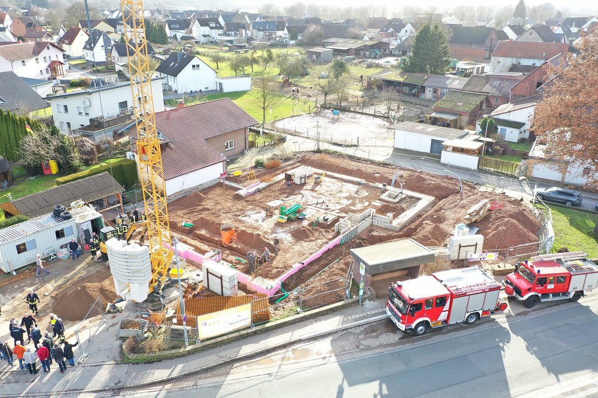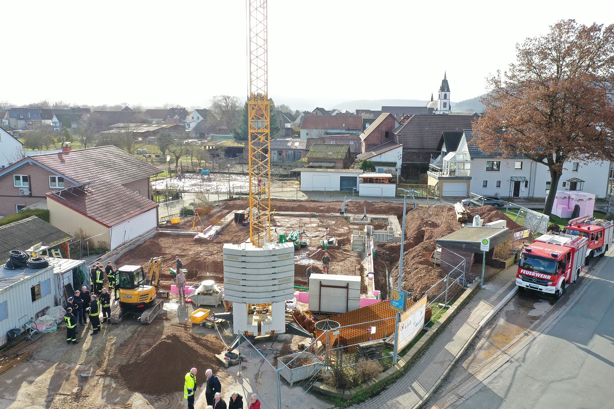 Lüchtringen (TKu). Aufgrund der in den vergangenen Tagen herrschenden winterlichen Wetterlage wurde am Dienstagnachmittag der symbolische erste Spatenstich für den Neubau des Feuerwehrgerätehauses der Löschgruppe Lüchtringen nachgeholt. Danach ging man direkt zur Grundsteinlegung über. In den Grundstein soll in Kürze noch eine Zeitkapsel eingepflegt werden, welche die aktuellen Tageszeitungen von Dienstag, den 24. Februar, einen Satz Hartgeld, einen Kümmerling, ein Blaulichtwasser sowie ein aktuelles Foto der Löschgruppe Lüchtringen enthält. Mit dem offiziellen Baustart rückte die Löschgruppe Lüchtringen geschlossen an: Mit beiden Einsatzfahrzeugen fuhren zwei Gruppen an die Baustelle, wo bei sonnigem Wetter der Beginn eines wichtigen Projekts markiert wurde. Ebenfalls mit dabei war auch eine große Abordnung der Ehrenabteilung der Löschgruppe Lüchtringen. Unter ihnen war auch der langjährige ehemalige stellvertretende Löschgruppenführer Josef Korte. Er war bereits bei der Grundsteinlegung des inzwischen abgerissenen Gerätehauses an gleicher Stelle mit dabei, das im Jahr 1964 fertiggestellt worden ist.