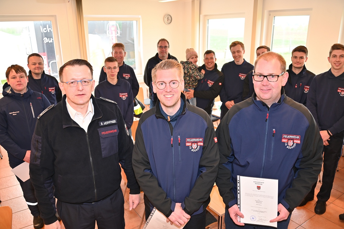 Großes Interesse zog zudem eine realitätsnahe Einsatzübung auf dem Schützenplatz auf sich. Die Löschgruppe Fürstenau zeigte gemeinsam mit dem Löschzug Höxter, wie die Feuerwehr bei einem Verkehrsunfall mit eingeklemmter Person vorgeht. Vor den Augen von dutzenden Zuschauern wurde ein ausgemusterter Pkw fachgerecht zerlegt, um eine schonende Rettung des „Verletzten“ zu ermöglichen. Dabei musste unter anderem das Fahrzeugdach entfernt werden, um die verunfallte Person aus dem Fahrzeug zu befreien. Auch personell gab es einen wichtigen Moment: Der stellvertretende Leiter der Feuerwehr Höxter, Rainer Höppner, nahm die Ernennung zweier Führungskräfte vor. Die Brüder Benedikt und Philipp Meise wurden für weitere sechs Jahre in ihren Funktionen als Löschgruppenführer bestätigt. Benedikt Meise bleibt Löschgruppenführer, während Philipp Meise weiterhin als sein Stellvertreter fungiert.