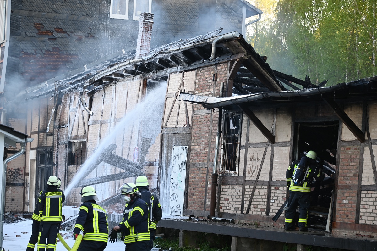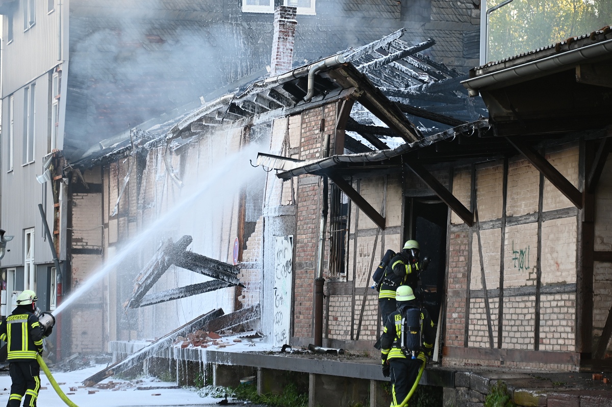 Beverungen (red). Nach dem Großbrand am Donnerstagnachmittag auf dem Gelände des Alten Bahnhofs in Beverungen liegen inzwischen weitere Erkenntnisse zum Einsatzverlauf und zum Ausmaß der Schäden vor. Demnach bestätigte sich, dass das Feuer im Bereich eines Anbaus ausbrach und sich von dort rasch ausbreitete. Eine Zeugin hatte gegen 16 Uhr Rauch aus dem Anbau des früheren Bahnhofsgebäudes bemerkt und die Einsatzkräfte alarmiert. Beim Eintreffen von Feuerwehr und Polizei stand der Dachstuhl bereits in Flammen, gegen 17 Uhr war er vollständig ausgebrannt. Das Feuer beschränkte sich nach Angaben der Einsatzleitung auf den Anbau, in dem unter anderem städtische Notunterkünfte untergebracht waren. Das angrenzende Gebäude mit einer Asylbewerberunterkunft blieb relativ verschont, wurde jedoch durch Hitze und Rauch ebenfalls in Mitleidenschaft gezogen. Die Feuerwehr kühlte das Gebäude vorsorglich dauerhaft, um ein Übergreifen der Flammen zu verhindern. Nach ersten Einschätzungen kann es vorerst nicht mehr bewohnt werden. Ein Anzeichen dafür sind die ausgelösten Rauchmelder im Gebäude, die auch am Abend noch lautstark schrillten. Das bedeutet, dass Rauch weit bis in das Wohngebäude vorgedrungen ist, wie die Feuerwehr erklärte. Die Bewohner wurden zunächst an anderen Orten untergebracht.