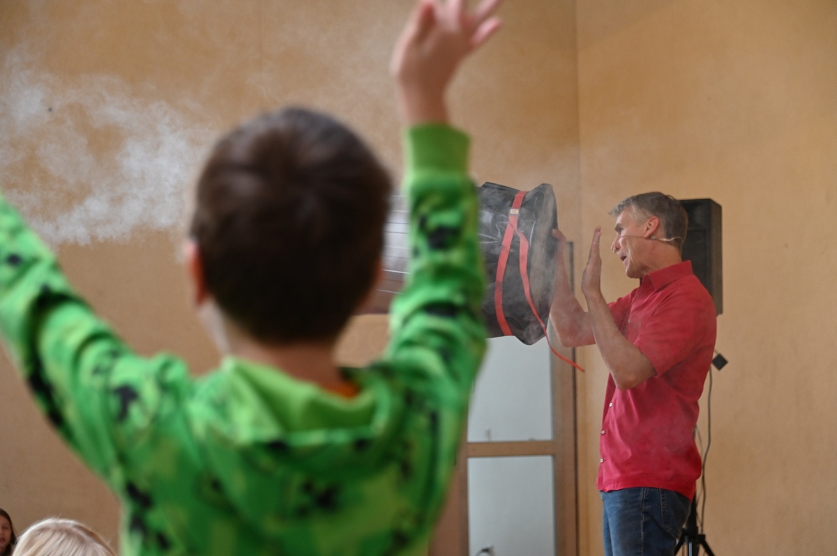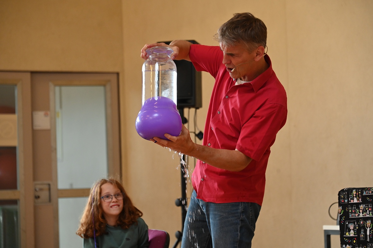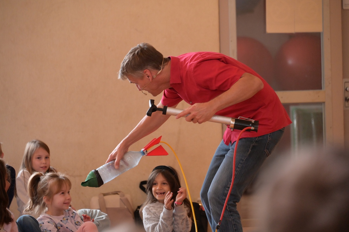 Im Mittelpunkt der Show standen die vier Elemente Feuer, Wasser, Luft und Erde. Wissenschaftsjournalist Dr. Sascha Ott, bekannt aus dem WDR-Format „Küchenexperimente“, präsentierte die physikalischen Phänomene kindgerecht, humorvoll und immer auf dem soliden Grund wissenschaftlicher Fakten. So wurde ein kleines Teelicht plötzlich zu einem spektakulären Feuerball. Fünf Liter Wasser verwandelten sich in eine Schwalldusche, die für viel Staunen und Gelächter sorgte. Doch nicht nur beeindruckende Experimente standen im Fokus. Die Kinder erfuhren spielerisch, wie Raketen fliegen, warum ein Feuer brennt oder wie man im Alltag Energie sparen kann. Besonders wichtig dabei: Alle durften mitdenken, miträtseln und mitexperimentieren. Genau dieses aktive Erleben macht die Wissensshows der Physikanten zu nachhaltigen Lernerlebnissen.