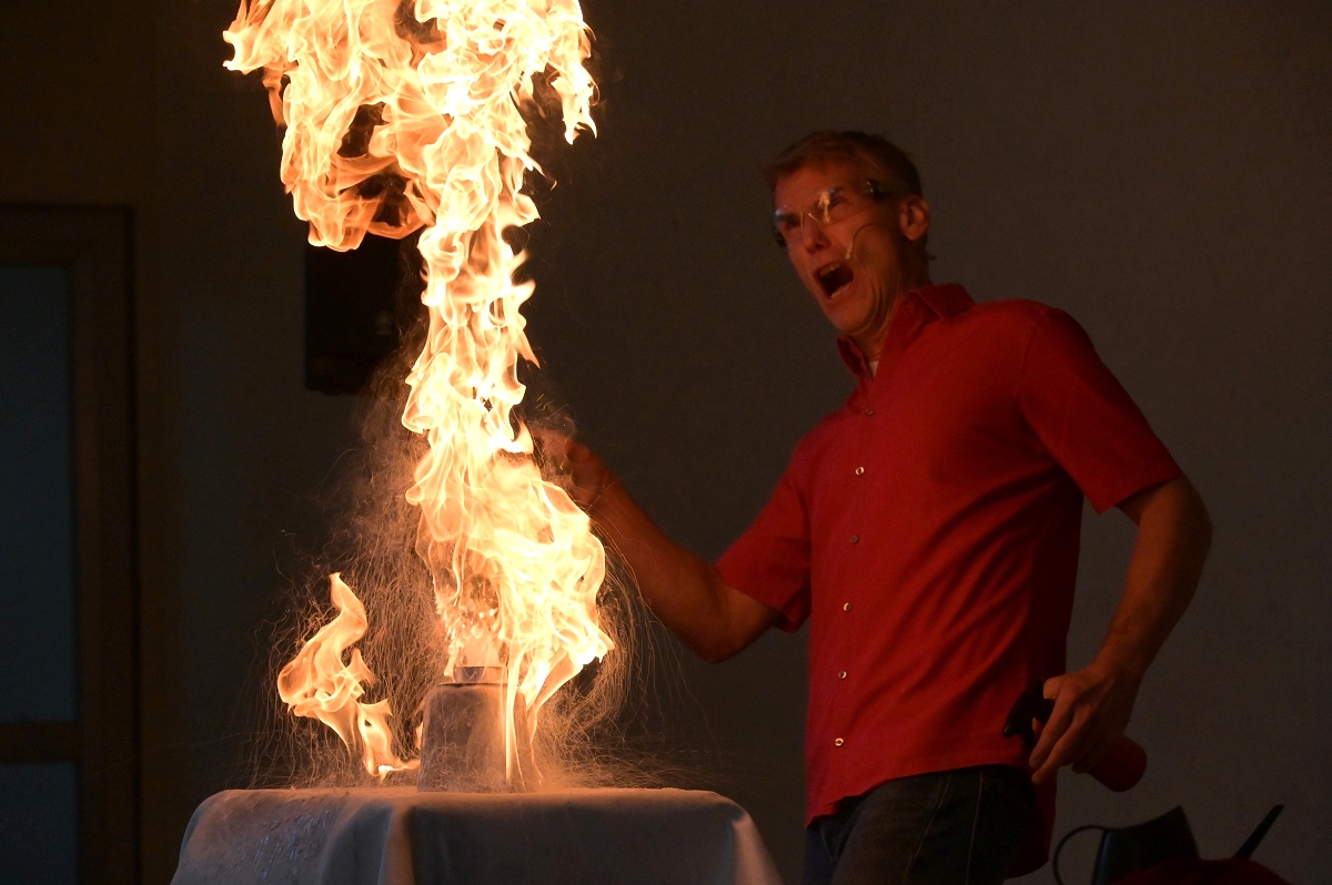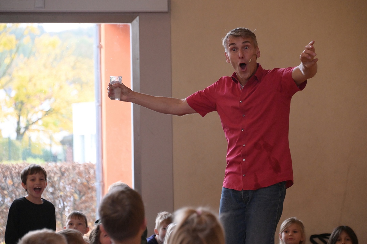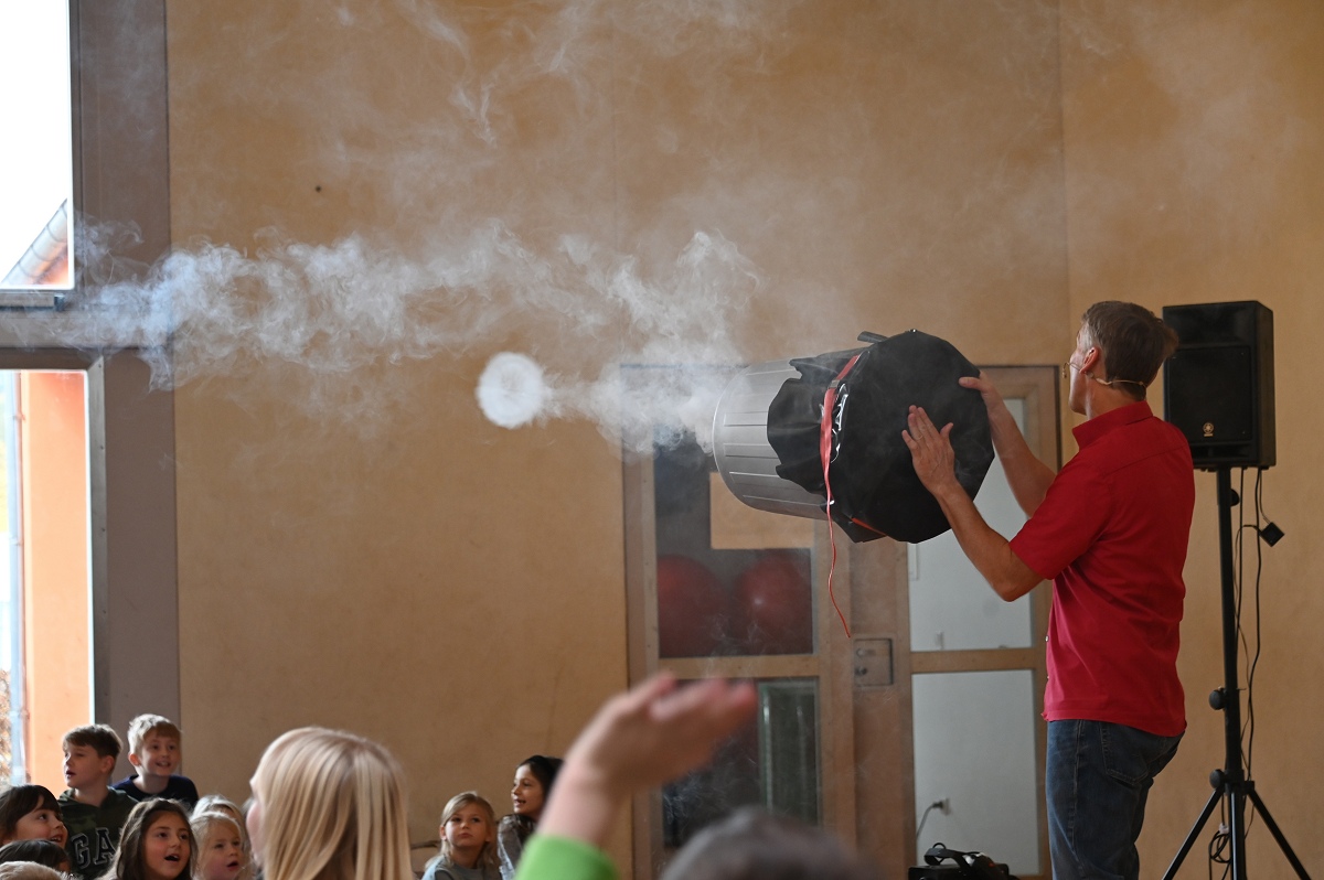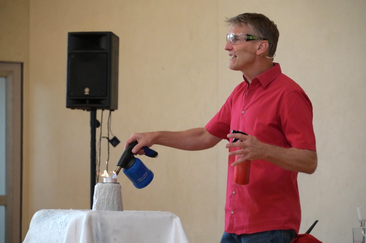 Im Mittelpunkt der Show standen die vier Elemente Feuer, Wasser, Luft und Erde. Wissenschaftsjournalist Dr. Sascha Ott, bekannt aus dem WDR-Format „Küchenexperimente“, präsentierte die physikalischen Phänomene kindgerecht, humorvoll und immer auf dem soliden Grund wissenschaftlicher Fakten. So wurde ein kleines Teelicht plötzlich zu einem spektakulären Feuerball. Fünf Liter Wasser verwandelten sich in eine Schwalldusche, die für viel Staunen und Gelächter sorgte. Doch nicht nur beeindruckende Experimente standen im Fokus. Die Kinder erfuhren spielerisch, wie Raketen fliegen, warum ein Feuer brennt oder wie man im Alltag Energie sparen kann. Besonders wichtig dabei: Alle durften mitdenken, miträtseln und mitexperimentieren. Genau dieses aktive Erleben macht die Wissensshows der Physikanten zu nachhaltigen Lernerlebnissen.