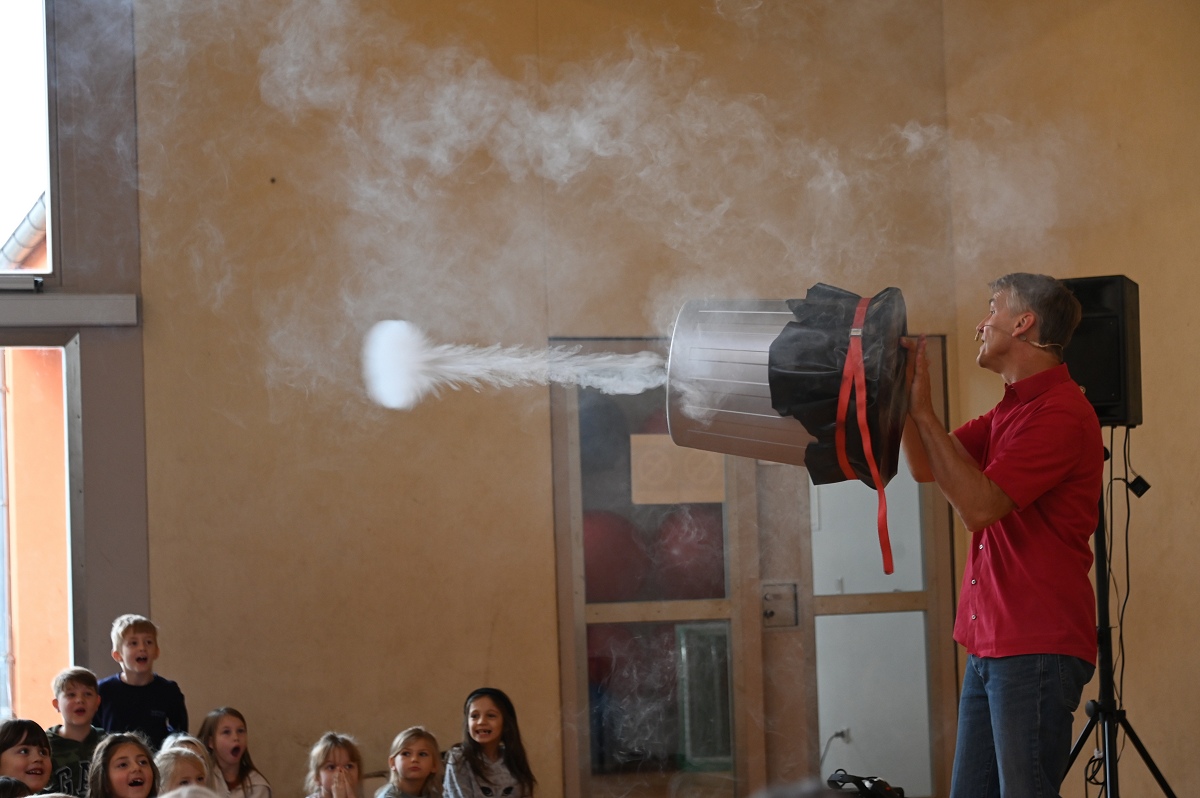 Lüchtringen (TKu). Mit einem Feuerball, spritzenden Wassermengen und Wirbelringen, die quer durch die Turnhalle schossen, endete am Donnerstagmorgen die letzte Unterrichtsstunde für die Schülerinnen und Schüler der Grundschule Lüchtringen auf besonders spannende Weise. Zu Gast waren „Die Physikanten“, ein mehrfach ausgezeichnetes Team aus Naturwissenschaftlern und Künstlern, das seit Jahren Kinder wie Erwachsene mit spektakulären Experimenten begeistert. Der Förderverein der Grundschule Lüchtringen hatte diese besondere Wissensshow organisiert und finanziert. Damit konnten alle Klassen von Jahrgang 1 bis 4 teilnehmen, und das nicht nur zuschauen, sondern auch aktiv mitmachen.