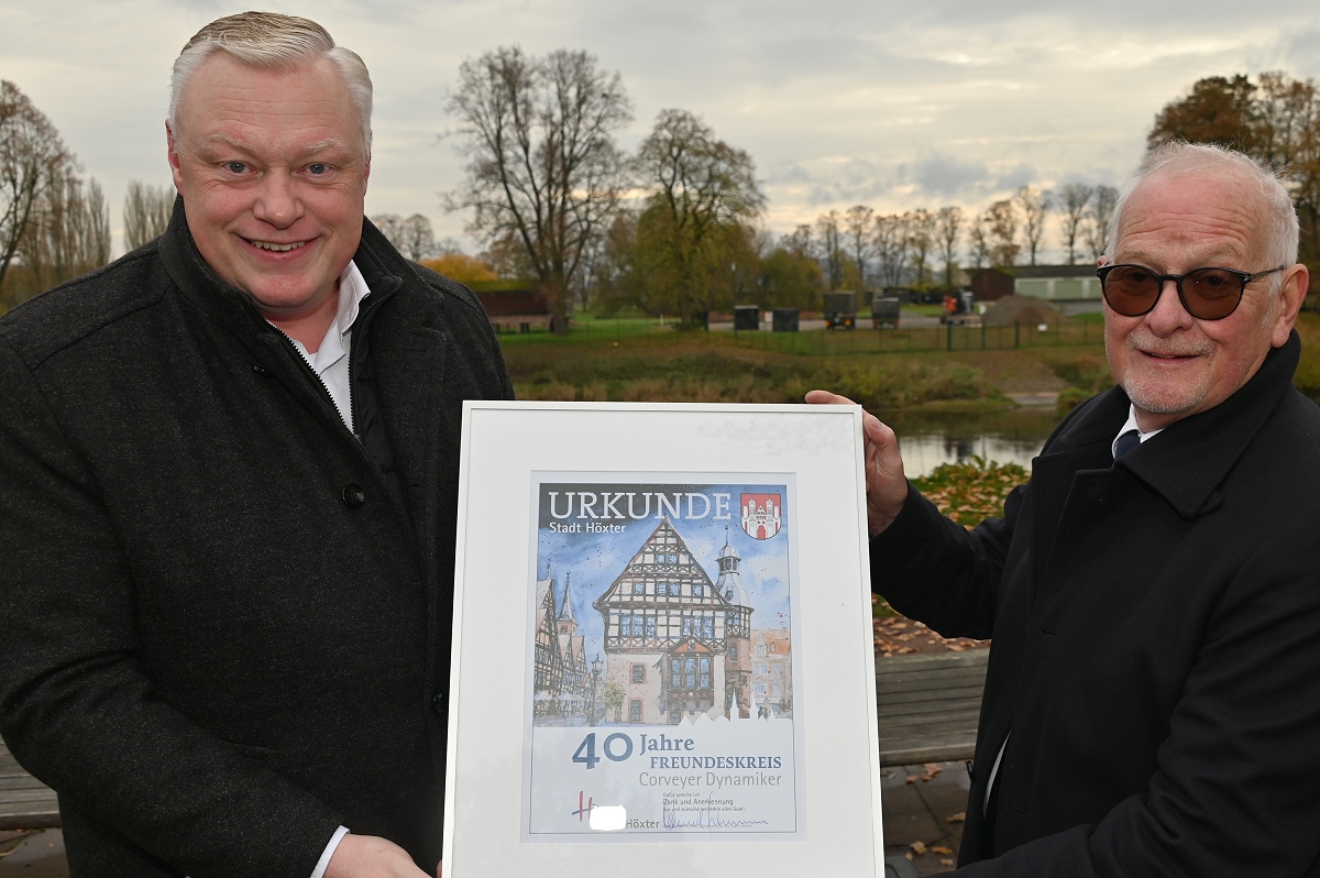 Bürgermeister Daniel Hartmann würdigte dieses Engagement und überreichte dem Freundeskreis im Namen der Stadt Höxter eine Ehrenurkunde. In seiner Rede erinnerte er an die Gründung im Kaminzimmer von Schloss Corvey und an die besondere Mischung der damaligen Runde: Handwerker, Kaufleute, Juristen, Unternehmer und ein Gastronom. „Eine Art Stadtsymphonie“, wie Hartmann es formulierte, „in der jeder ein anderes Instrument spielt, aber gemeinsam ein Klang entsteht, der sich hören lassen kann.“ Er hob hervor, wie selbstverständlich der Freundeskreis dort einspringe, wo Aufgaben sonst hätten liegen bleiben können. Die Dynamiker hätten nicht nur Steine restauriert, sondern Erinnerungsräume bewahrt; nicht nur Anlagen gebaut, sondern Freiheitsorte geschaffen; nicht nur Toiletten errichtet, sondern gezeigt, was möglich sei, wenn Bürgerinnen und Bürger Verantwortung übernehmen. „Der Funke aus jenem Kaminzimmer von 1985 brennt weiter. Und er leuchtet noch immer hell genug, um die nächsten Jahre Höxter ein Stück weit mitzugestalten“, so der Bürgermeister.